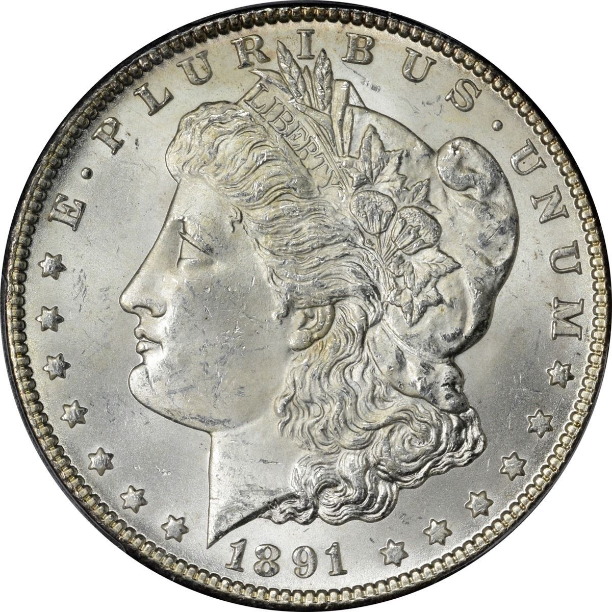 1891-CC Morgan $1. MS-64 PCGS.  This sharply struck example of a popular late-date Carson City issue is alive with ebullient luster and superb eye appeal for the grade. Full brilliance enhances both sides of this near-gem specimen. Neophytes and nabobs alike will rally to this coin when it crosses the auction block.