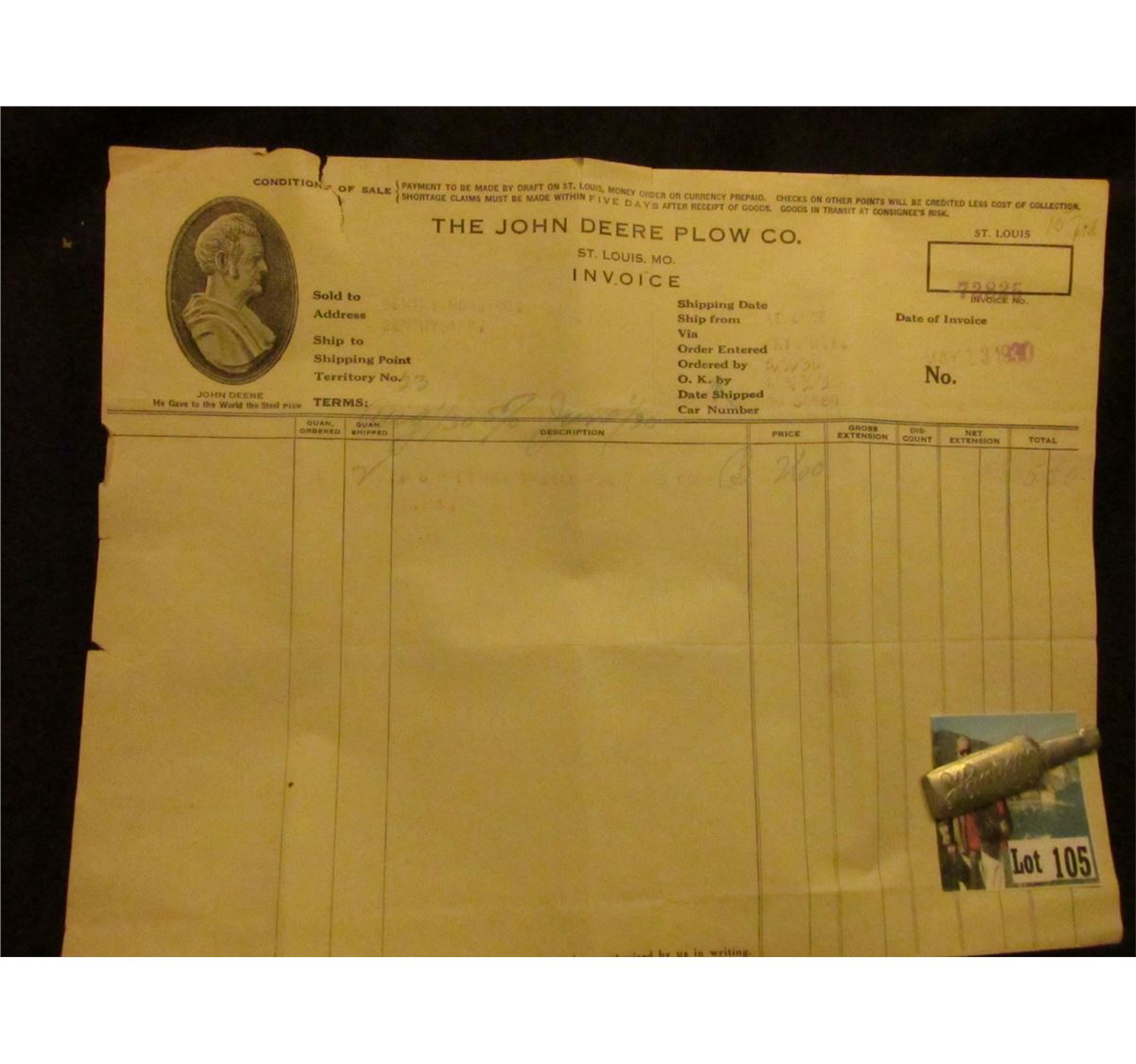5/3/1930 Invoice "The John Deere Plow Co. St. Louis, Mo.", vignette of Mr. Deere l.; & Harper Whiskey Pewter Advertising Toothpick.