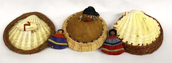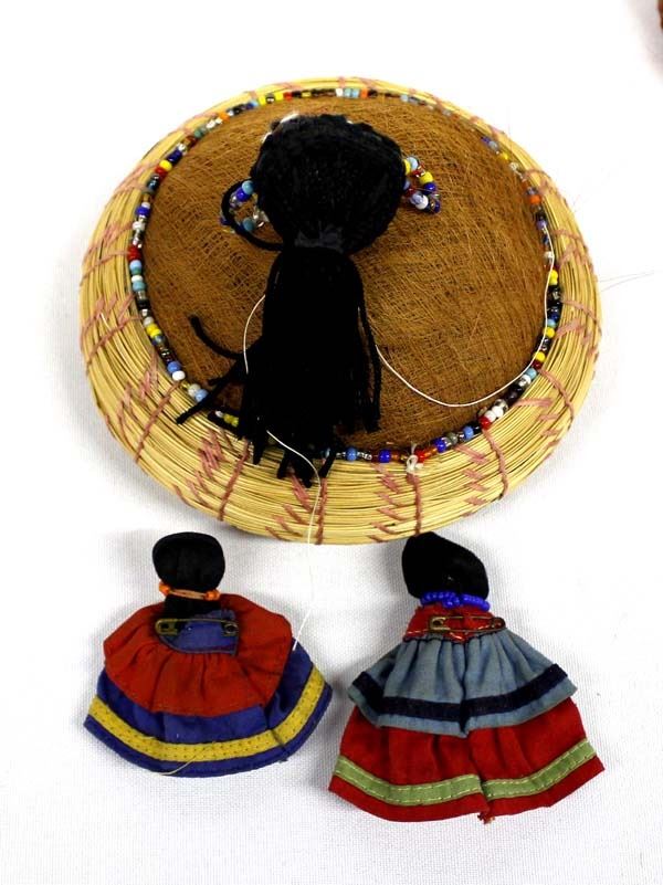 4 Native American Seminole Collectibles, includes: 1. Double Scallop Shell Pine Needle Basket, measures 3.5'' x 6.5'' and is double sided, the top features a scallop shell with an olive shell finial while the bottom features a scallop shell, the middle of the piece is pine needle basketry, very unique piece 2. Pin Cushion Doll on Pine Needle Basket, measures 4'' x 5'', embellished with beads and hand stitched facial features, palmetto fiber body 3. Two Doll Pins, largest measures 1.5'' x 2.5'', bead embellishments and hand sewn facial features, one of the dolls has a palmetto fiber head