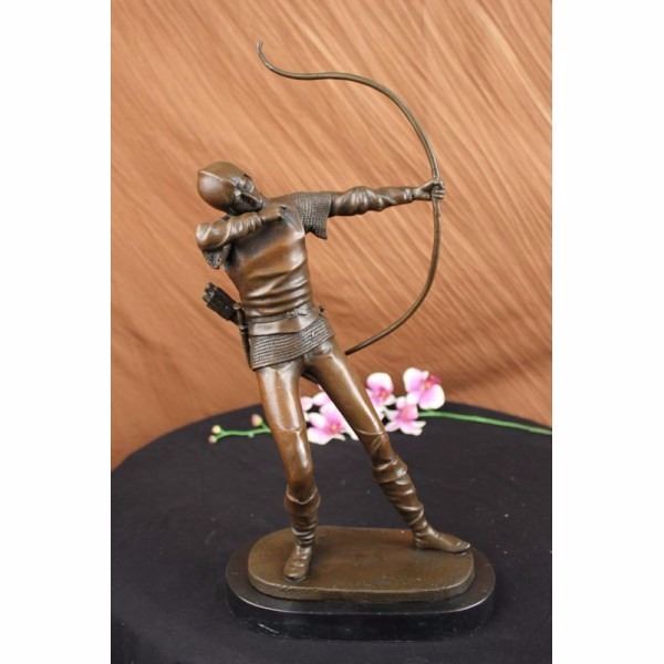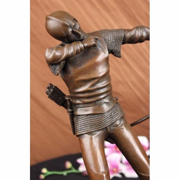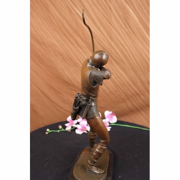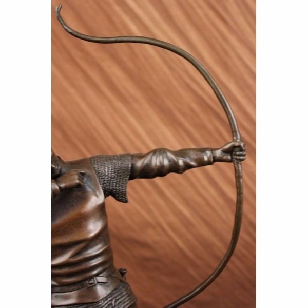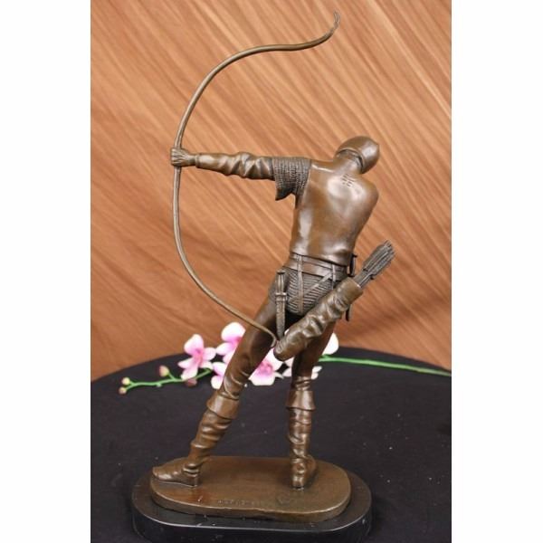 An archer at target practice. He leans back, lines his arms, tilts his head to the side, squints at his target and lets a arrow fly. He clutches his tall bow and watches his arrow sail through the air. You can even see his shut eye that helps him focus on the target. His back leg bends firmly, grinding into the ground. A knife and a sack of extra bows are slung off the back of his hip. He is covered completely in layers and knee-high boots that fold at the knees. 100% bronze and handmade and is signed P. Tourgueneff. Condition: This sculpture is in perfect condition. Bronze Dimensions with Marble Base:Height 21" x Width 10" Marble Dimensions: Diameter 10" Height without base: 20" Weight : 17 LBS Inventory : 27DS1865872