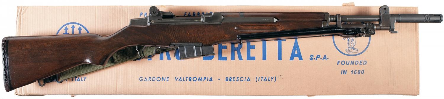 Developed in Italy this was the Italian equivalent of a semi-automatic U.S. M14 rifle in 7.62 NATO. Fixed front and adjustable peep rear sights, with a grenade launcher attached to the muzzle with a folding bipod. Benet Arms import mark on the left side of the receiver, with "P B" and "BM 59" markings on many parts. Smooth pistol grip stock with a green canvas sling and a "P. BERETTA" marked recoil pad. With a Beretta box, hand numbered to gun.