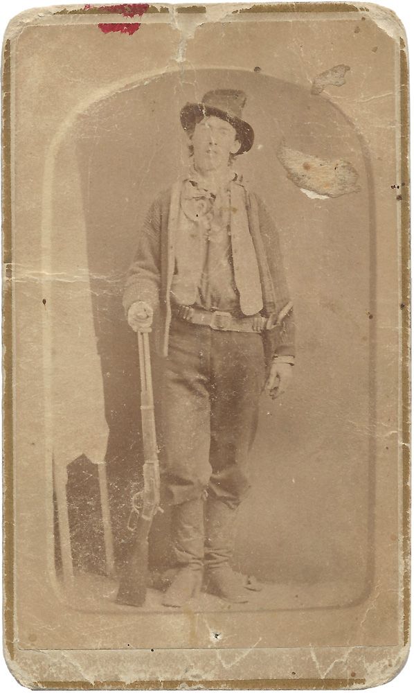 Original cartes-de-visites of the famous tintype image of Billy the Kid. Several folds, and cracks, red stain at the very top not affecting the image. 4 1/8" x 2 1/2" overall, with the image being 2 3/8" x 3 3/4" on the card. Circa 1880s.
