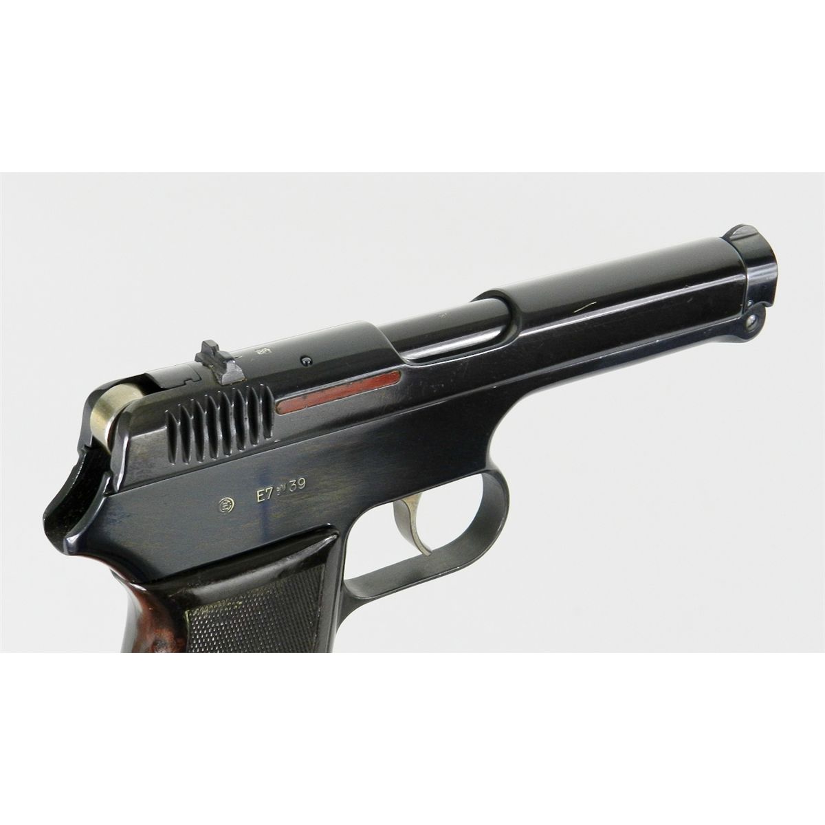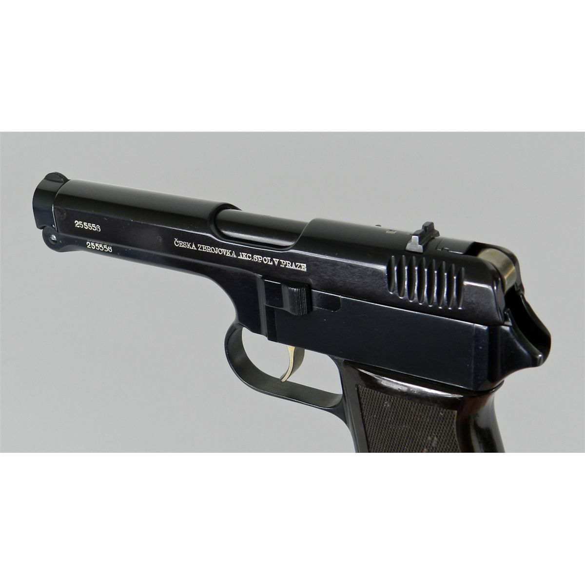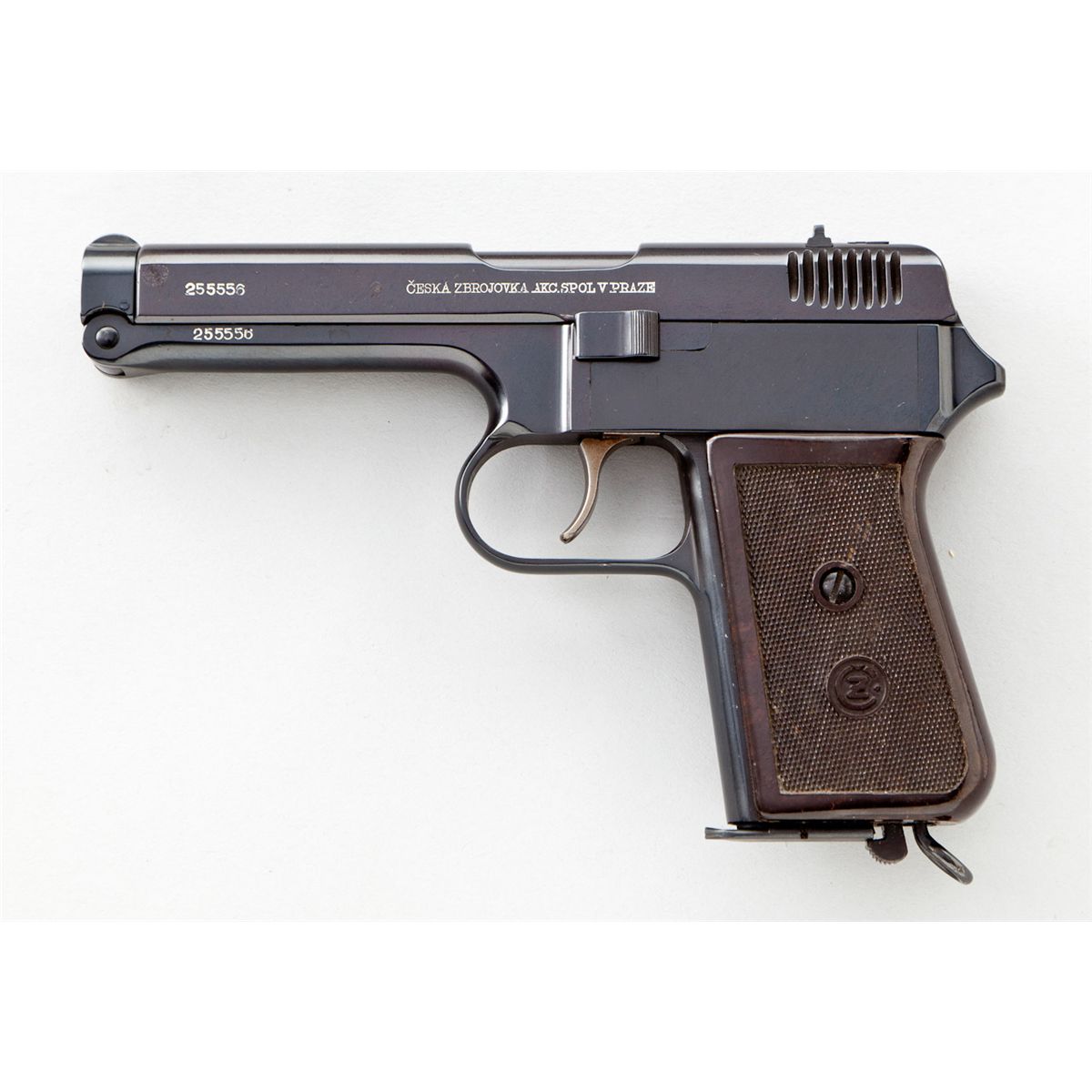 CZ 1938 Semi-Automatic Pistol, #255556, .380 cal., 4.65'' barrel, double action only, blue finish, wraparound checkered phenolic resin grips with CZ logo, lanyard loop in butt, with one correct magazine. Left side of slide marked ''Ceska Zbrojovka Akc Spol V Praze''; right side of frame with CZ logo and ''E7/lion/39''. Similar proofmarks to top of slide and center of barrel at chamber. Condition is excellent as professionally restored, retaining approx. 98% emersion type blue with crisp clear markings. Grips with very light wear. Straw colored hammer and trigger retain nearly all their original finish. Action is crisp, bore is fine. Est.: $400-$600.