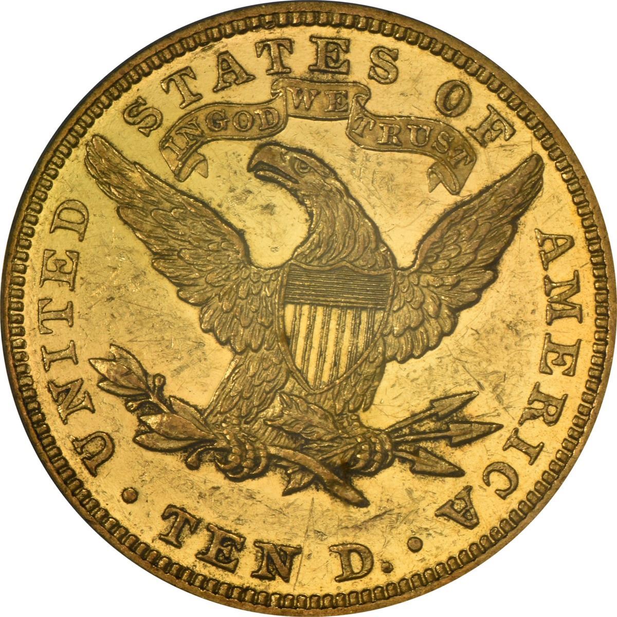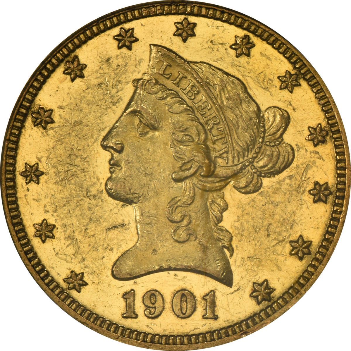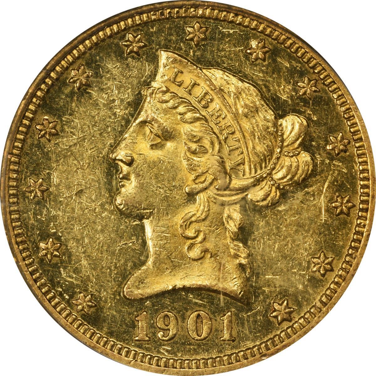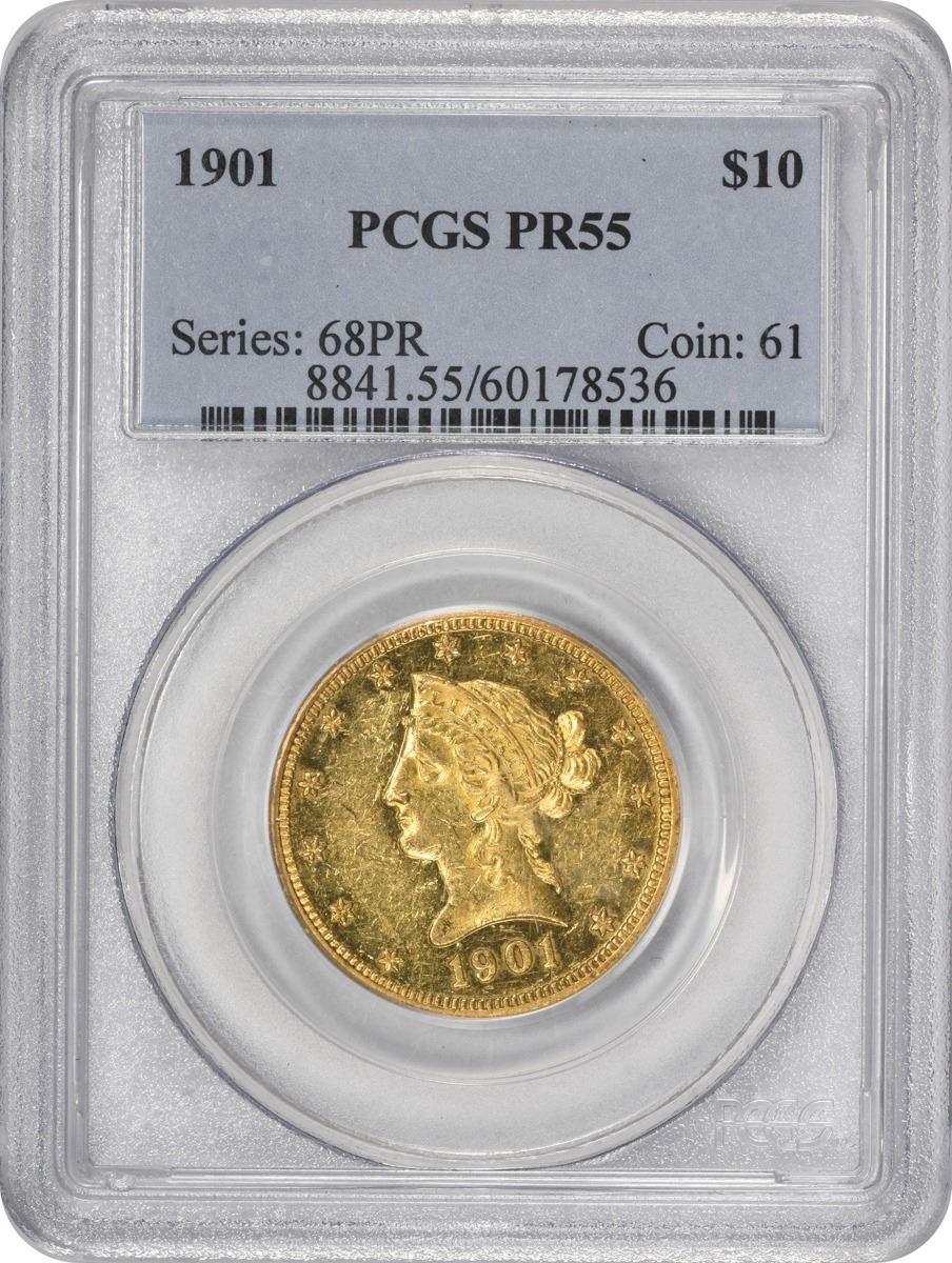 Circulated Proof 1901 Eagle. 1901 Gold $10. Proof-55 PCGS. The crinkly textured fields and frosty motifs of this modestly circulated Proof eagle, one of 85 examples of the date struck in the format, show innumerable dings and hairlines from a short but obviously arduous journey through pocket change. The marks are heaviest on the obverse. Trophy coins such as Proofs were often the first to go when hard times hit a family, and this piece may have suffered that fate. However, a sharp-eyed collector pulled it from circulation before it became totally unidentifiable as a Proof and placed it aside for posterity.