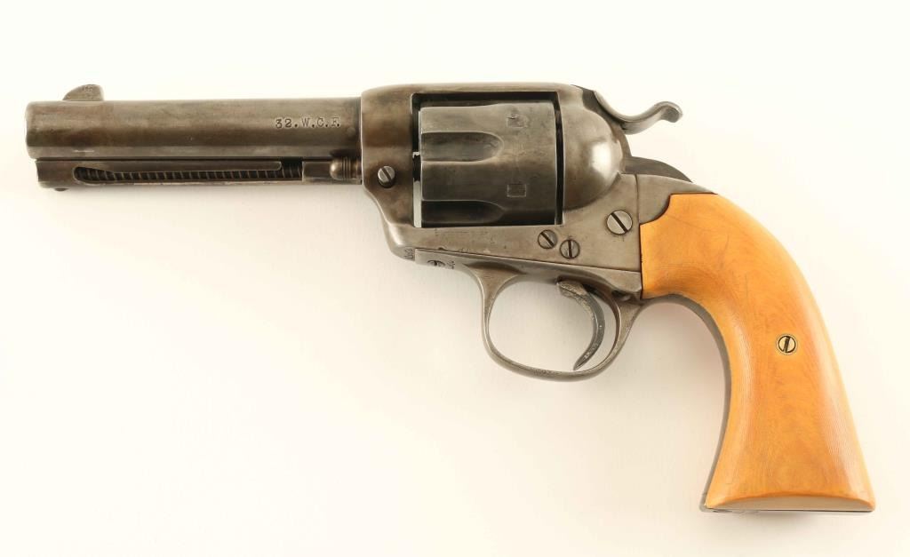 'First Generation' Vintage single action six-shot revolver chambered in .32-20 Winchester, manufactured circa 1911. Introduced in 1894, the Colt Bisley was marketed as a target revolver and was named after the Bisley shooting range in England. Features an old blued refinish, 4 3/4" barrel with no visible address, blade front sight, 'v' notched rear sight, ejector rod(missing thumb piece), smooth wide trigger, knurled wide low-profile hammer spur, fluted cylinder, and custom two-piece smooth wood grips. Serial numbers match on the frame, triggerguard and backstrap. The caliber designation on the barrel has been hand stamped. Revolver exhibits less than 10% of it's blued refinish with the majority of the metal surfaces turned to an aged grey/brown patina. When the hammer is cocked surface rust is visible on the hammer and on the inside of the frame. Action is strong with four clicks & very good lock-up, the bore is bright with some scattered light pitting, markings on the frame are mostly legible and the wood grips are good.