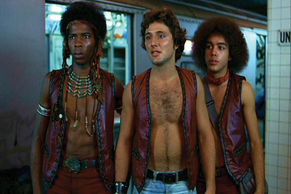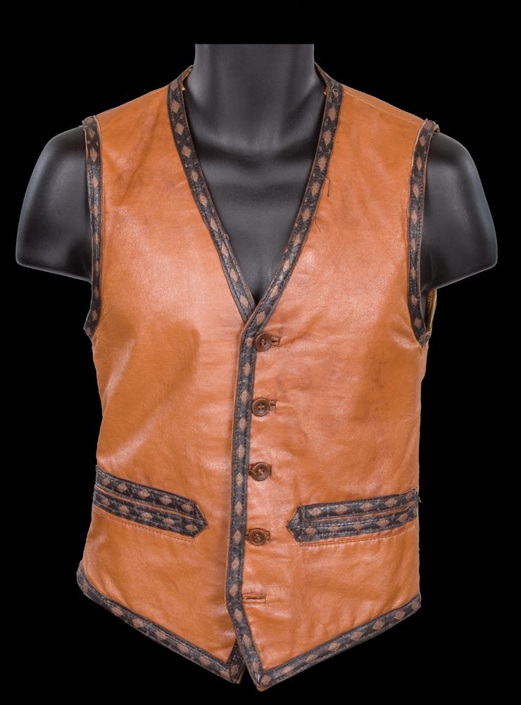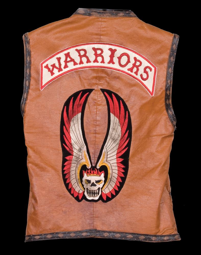 (Paramount, 1979) Light brown synthetic leather vest with black trim in a geometric pattern, lined in polyester and handwritten in black ink near the maker’s label, “Cochese” [sic]. Worn by Cochise, the soldier who dresses in Native American Indian accoutrements and who successfully makes it back to Coney Island with his Warrior brethren. The vest has a true copy of the two Warriors embroidered insignia patches on the back – the stylized Warriors logo and winged-skull symbol – which were created with the exact pattern used by costume designer Bobbie Mannix to make the vest patches in 1979, making these identical, 100% correct patches to the ones worn in the original production. (The original patches were removed from the vests shortly after the film wrapped, and the vests pressed into service on other unknown films). This is the only Warriors vest known to have survived, and may be the only opportunity collectors may ever have to own an original wardrobe piece from this classic film.