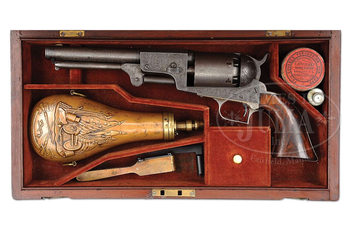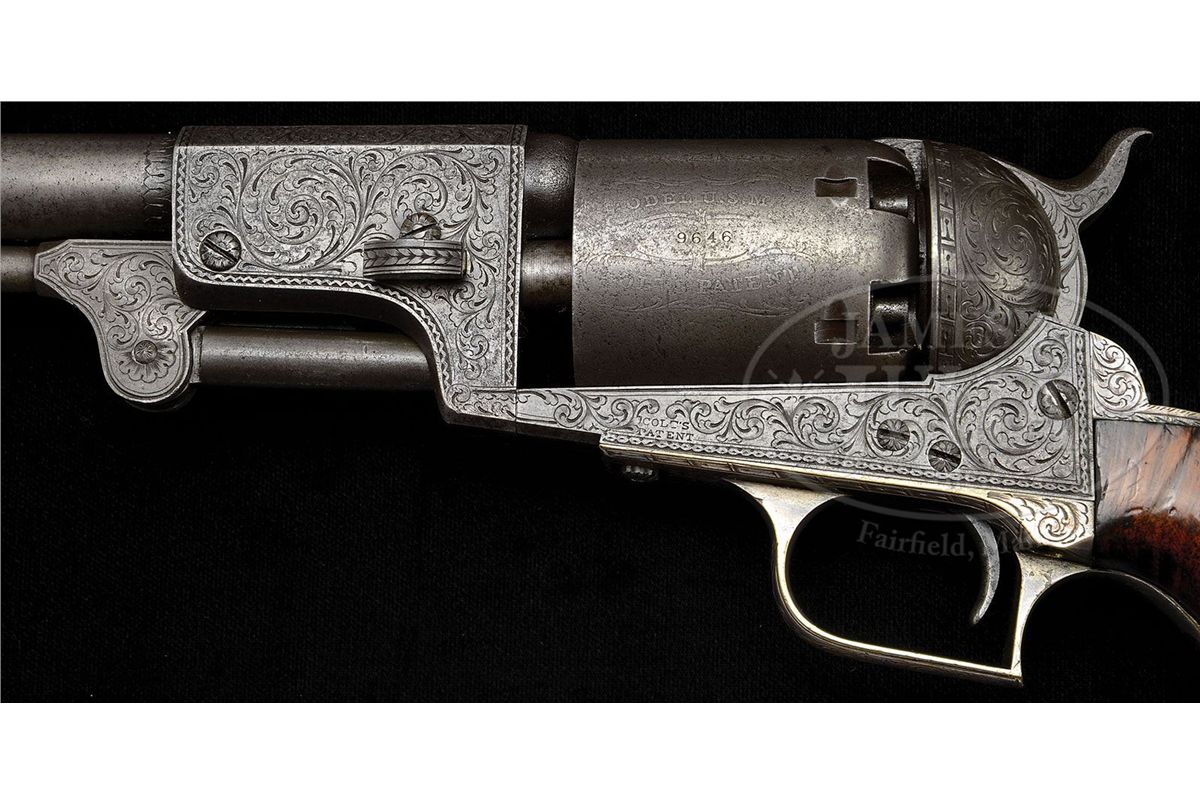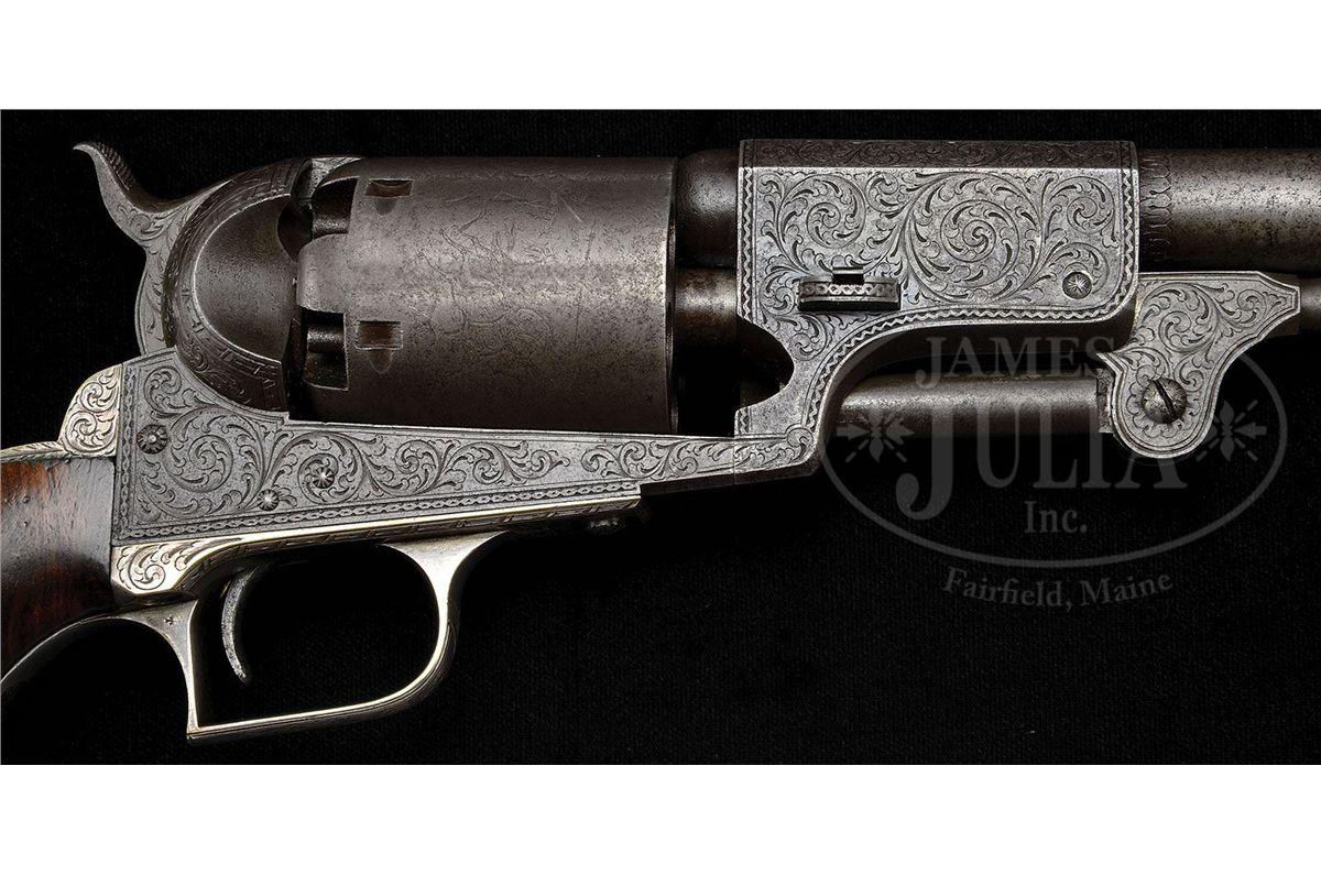 SN 9646. Cal. 44. Usual configuration with 7-1/2" oct to rnd bbl, German silver front sight and 1 line New York City address. Frame is marked with a tiny "COLT'S PATENT". Cylinder is usual 6 chambers with dragoon/indian fight scene and "MODEL U.S.M.R. / COLT'S PATENT" and 2 panels around the SN. The silver plated brass square back trigger guard and backstrap contain an exceptional, highly figured, burl walnut 1-pc grip matching numbered to this revolver. Revolver is engraved in vine style scrolls with a wolf's head on either side of the hammer nose and fish scale patterns on the top edge and hand checkered spur. Matching engraving extends over the bbl lug and top side flats with zig-zag border. Matching engraving is also on the rammer pivot with wide borders at the muzzle and on the transition. Screw heads and ends to the wedge are also engraved. Accompanied by an early English style, orig, brass-bound walnut casing with a brass medallion in the lid engraved with old English initials that appear to be "F.J." Case is burgundy velvet lined and compartmented in the bottom for the revolver, an early double sided COLTS PATENT trophy of flags and arms, flask with plunger spout, adjustable to 35 to 40 grains of powder with a swinging lid ball compartment on top. Flask has low mounted triangle shaped hangers. Also included is an orig brass "COLTS PATENT" 2-cavity bullet mold with sprue cutter and "L" shaped nipple wrench, a tin for Joyce caps with red top & side labels and a pewter oil bottle. Case is English style, however revolver does not have English proof marks. This revolver is illustrated on page 48 of Colt Pistols, Hable & Wilson. Also accompanied by a letter from renowned Colt authority, historian and author R.L. Wilson wherein he states that only about 2,700 2nd model Dragoons were produced and that "The 2nd model is one of the most difficult of dragoons for the collector to acquire, and of those specimens known today only a handful are engraved". He relates that Colt dragoon #9623 is in the Windsor Castle Armory Collection and is believed to have been presented by Col. Colt to H.R.H. Prince Albert. He states "It is possible that No. 9646 had been a display revolver used by Col. Colt at the Great Exhibition in 1851, in London, where his products were introduced---". In a following paragraph Mr. Wilson relates that in addition to dragoon #9623, that #9625, identically engraved, is in the Tower of London Armouries and that this revolver #9646 is identically engraved to both of them in style, quality and other details and he believes that they were all done by the same hand. The Second Model Dragoon is of greater rarity than either the First or Third Models. And to find an engraved one is almost an impossibility. PROVENANCE: R.E. Hable Collection; John B. Solley III Collection. Michael Leff Estate Collection. CONDITION: Fine to very fine, all matching including wedge and grip. Overall the steel parts retain a even grey metal patina with some scattered fine pitting on the bbl and cyl. It appears that this revolver may have suffered poor storage in the very distant past and was carefully cleaned. Cylinder is a matching patina with all 6 safety pins intact and shows 60-70% dragoon/indian fight scene. Trigger guard retains virtually all of its orig silver and the backstrap about 60-70% orig silver. Grip is sound with good edges and a few light nicks and scratches and retains about 60-70% bright orig varnish. Mechanics are fine. Bright shiny bore with scattered light pitting. Case is extremely fine with usual storage and handling nicks and scratches and retains most of its orig varnish. Interior is lightly to moderately faded with wear and soil from contact with a revolver. Flask has a few small nicks and dings and retains a medium mustard patina. Mold is very fine as are the other accessories. Altogether an exceptional and rare, desirable set suitable for the most advanced collection or museum exhibit. In a unique historical joint project, The Royal Armouries H.M. Tower of London authorized The Royal Armouries Colonel Samuel Colt Dragoon to be issued as a limited edition commemorative by the United States Historical Society in 1989. Because of the scarce vine style engraving, the U.S. Historical Society requested the use of Michael Leff’s revolver. In another letter from Mr. R.L. Wilson, Chairman at that time of the Antique Arms Committee, he states,”This is to express the thanks of the U.S. Historical Society, and myself, for the loan of your Second Model Dragoon, with its fine early vine style factory engraving, NO. 9646. The engraving of the Society prototype revolver has been completed by Alvin White- the results were superb!” No one can dispute that this is truly a remarkable revolver with an undeniable history, comparable in stature to only two other Engraved Second model dragoons that were owned by the English Royalty. 4-49623
