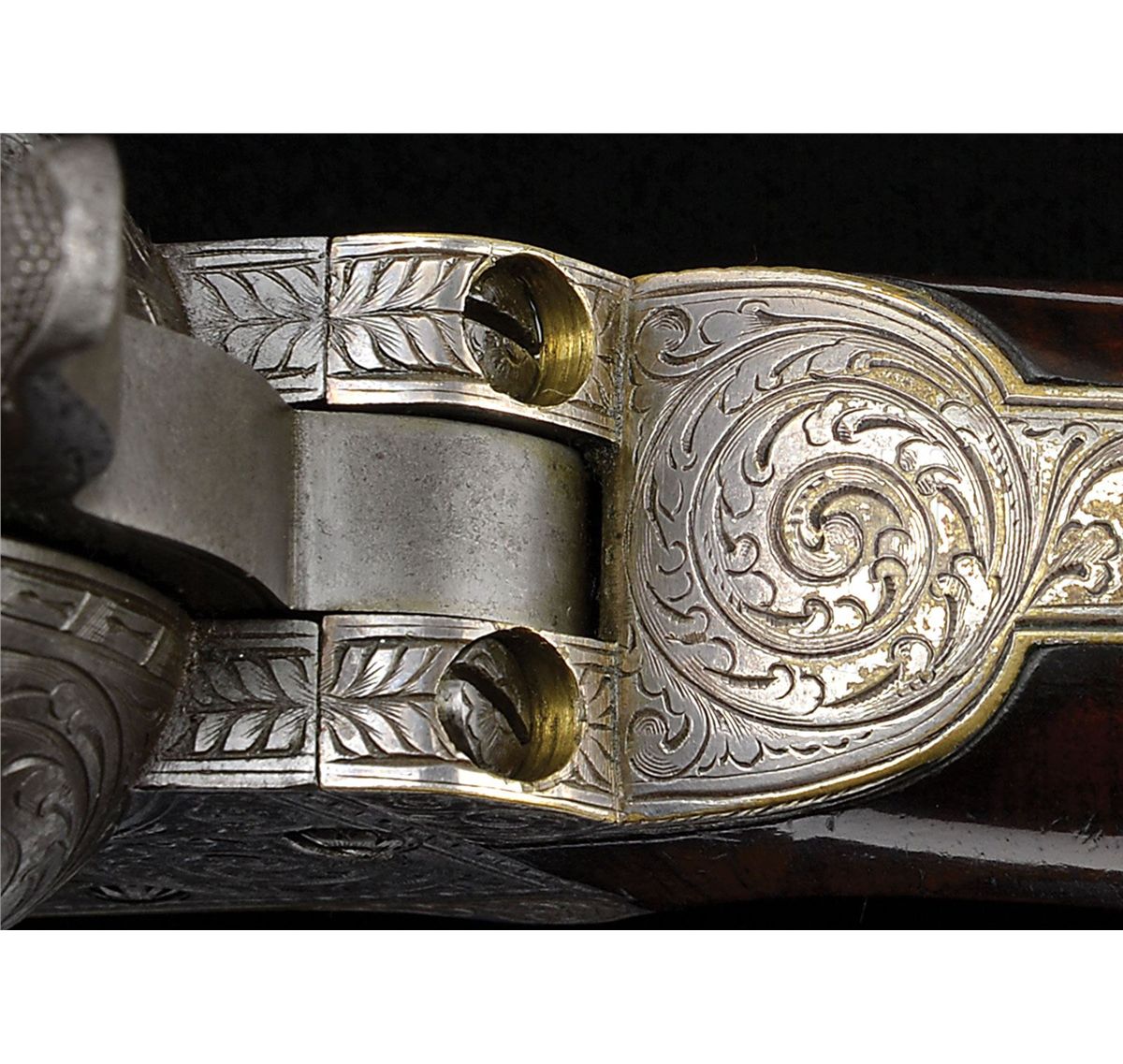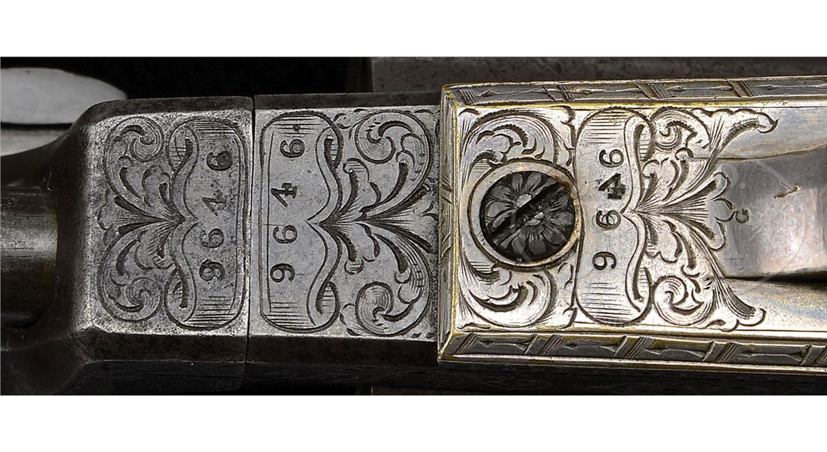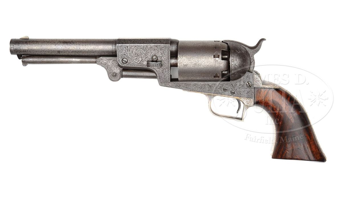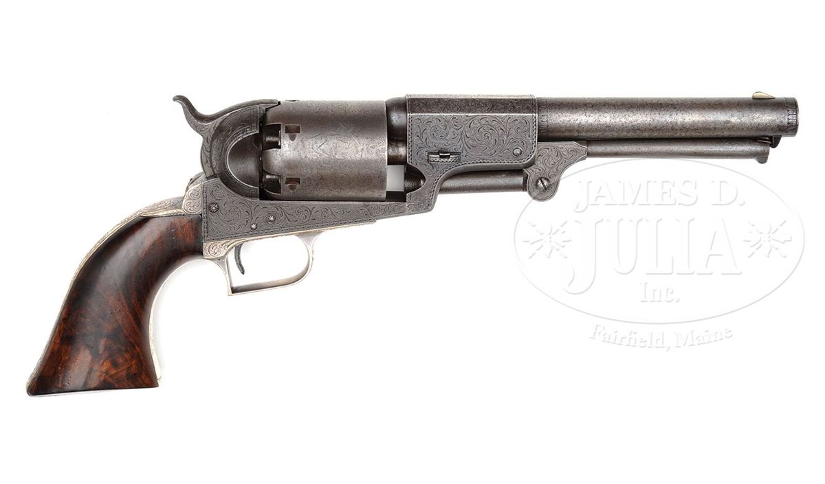 SN 9646. Cal. 44. Usual configuration with 7-1/2" oct to rnd bbl, German silver front sight and 1 line New York City address. Frame is marked with a tiny "COLT'S PATENT". Cylinder is usual 6 chambers with dragoon/indian fight scene and "MODEL U.S.M.R. / COLT'S PATENT" and 2 panels around the SN. The silver plated brass square back trigger guard and backstrap contain an exceptional, highly figured, burl walnut 1-pc grip matching numbered to this revolver. Revolver is engraved in vine style scrolls with a wolf's head on either side of the hammer nose and fish scale patterns on the top edge and hand checkered spur. Matching engraving extends over the bbl lug and top side flats with zig-zag border. Matching engraving is also on the rammer pivot with wide borders at the muzzle and on the transition. Screw heads and ends to the wedge are also engraved. Accompanied by an early English style, orig, brass-bound walnut casing with a brass medallion in the lid engraved with old English initials that appear to be "F.J." Case is burgundy velvet lined and compartmented in the bottom for the revolver, an early double sided COLTS PATENT trophy of flags and arms, flask with plunger spout, adjustable to 35 to 40 grains of powder with a swinging lid ball compartment on top. Flask has low mounted triangle shaped hangers. Also included is an orig brass "COLTS PATENT" 2-cavity bullet mold with sprue cutter and "L" shaped nipple wrench, a tin for Joyce caps with red top & side labels and a pewter oil bottle. Case is English style, however revolver does not have English proof marks. This revolver is illustrated on page 48 of Colt Pistols, Hable & Wilson. Also accompanied by a letter from renowned Colt authority, historian and author R.L. Wilson wherein he states that only about 2,700 2nd model Dragoons were produced and that "The 2nd model is one of the most difficult of dragoons for the collector to acquire, and of those specimens known today only a handful are engraved". He relates that Colt dragoon #9623 is in the Windsor Castle Armory Collection and is believed to have been presented by Col. Colt to H.R.H. Prince Albert. He states "It is possible that No. 9646 had been a display revolver used by Col. Colt at the Great Exhibition in 1851, in London, where his products were introduced---". In a following paragraph Mr. Wilson relates that in addition to dragoon #9623, that #9625, identically engraved, is in the Tower of London Armouries and that this revolver #9646 is identically engraved to both of them in style, quality and other details and he believes that they were all done by the same hand. The Second Model Dragoon is of greater rarity than either the First or Third Models. And to find an engraved one is almost an impossibility. PROVENANCE: R.E. Hable Collection; John B. Solley III Collection. Michael Leff Estate Collection. CONDITION: Fine to very fine, all matching including wedge and grip. Overall the steel parts retain a even grey metal patina with some scattered fine pitting on the bbl and cyl. It appears that this revolver may have suffered poor storage in the very distant past and was carefully cleaned. Cylinder is a matching patina with all 6 safety pins intact and shows 60-70% dragoon/indian fight scene. Trigger guard retains virtually all of its orig silver and the backstrap about 60-70% orig silver. Grip is sound with good edges and a few light nicks and scratches and retains about 60-70% bright orig varnish. Mechanics are fine. Bright shiny bore with scattered light pitting. Case is extremely fine with usual storage and handling nicks and scratches and retains most of its orig varnish. Interior is lightly to moderately faded with wear and soil from contact with a revolver. Flask has a few small nicks and dings and retains a medium mustard patina. Mold is very fine as are the other accessories. Altogether an exceptional and rare, desirable set suitable for the most advanced collection or museum exhibit. In a unique historical joint project, The Royal Armouries H.M. Tower of London authorized The Royal Armouries Colonel Samuel Colt Dragoon to be issued as a limited edition commemorative by the United States Historical Society in 1989. Because of the scarce vine style engraving, the U.S. Historical Society requested the use of Michael Leff’s revolver. In another letter from Mr. R.L. Wilson, Chairman at that time of the Antique Arms Committee, he states,”This is to express the thanks of the U.S. Historical Society, and myself, for the loan of your Second Model Dragoon, with its fine early vine style factory engraving, NO. 9646. The engraving of the Society prototype revolver has been completed by Alvin White- the results were superb!” No one can dispute that this is truly a remarkable revolver with an undeniable history, comparable in stature to only two other Engraved Second model dragoons that were owned by the English Royalty. 4-49623