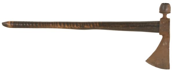 Eastern Woodlands Pipe Tomahawk. A very fine Tomahawk with it's original striped tiger or early maple handle. Cast iron head with some hand tooling on the tulip shaped head. A nice early example with a rich old Patina, excellent condition some light rusting/pitting to head.