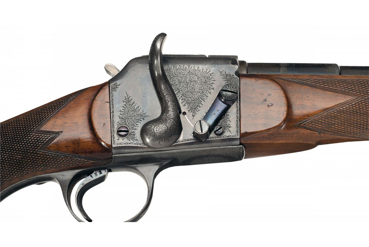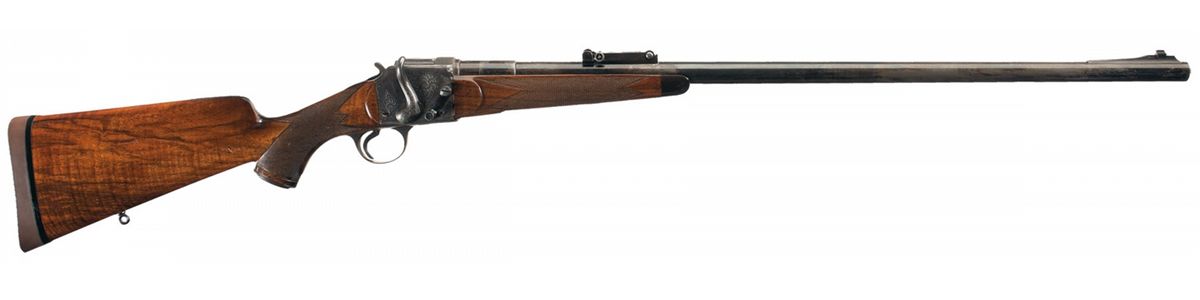 Ramp beaded blade front sight and adjustable notch rear sight with "45-70" marked on the replacement barrel at the breech. The fine scroll engraved receiver is marked "HOLLAND & HOLLAND" on the left side, has an extended upper tang tapped for a sight and with the receiver ring matted. Matching numbers (1327) on the front of the frame and on the trigger with the forearm numbered "4503". Nicely figured pistol grip stock with multi-point checkering, engraved grip cap, horn forend tip and solid Pachmayr recoil pad.