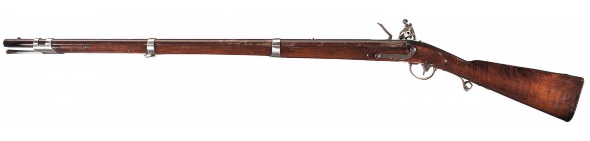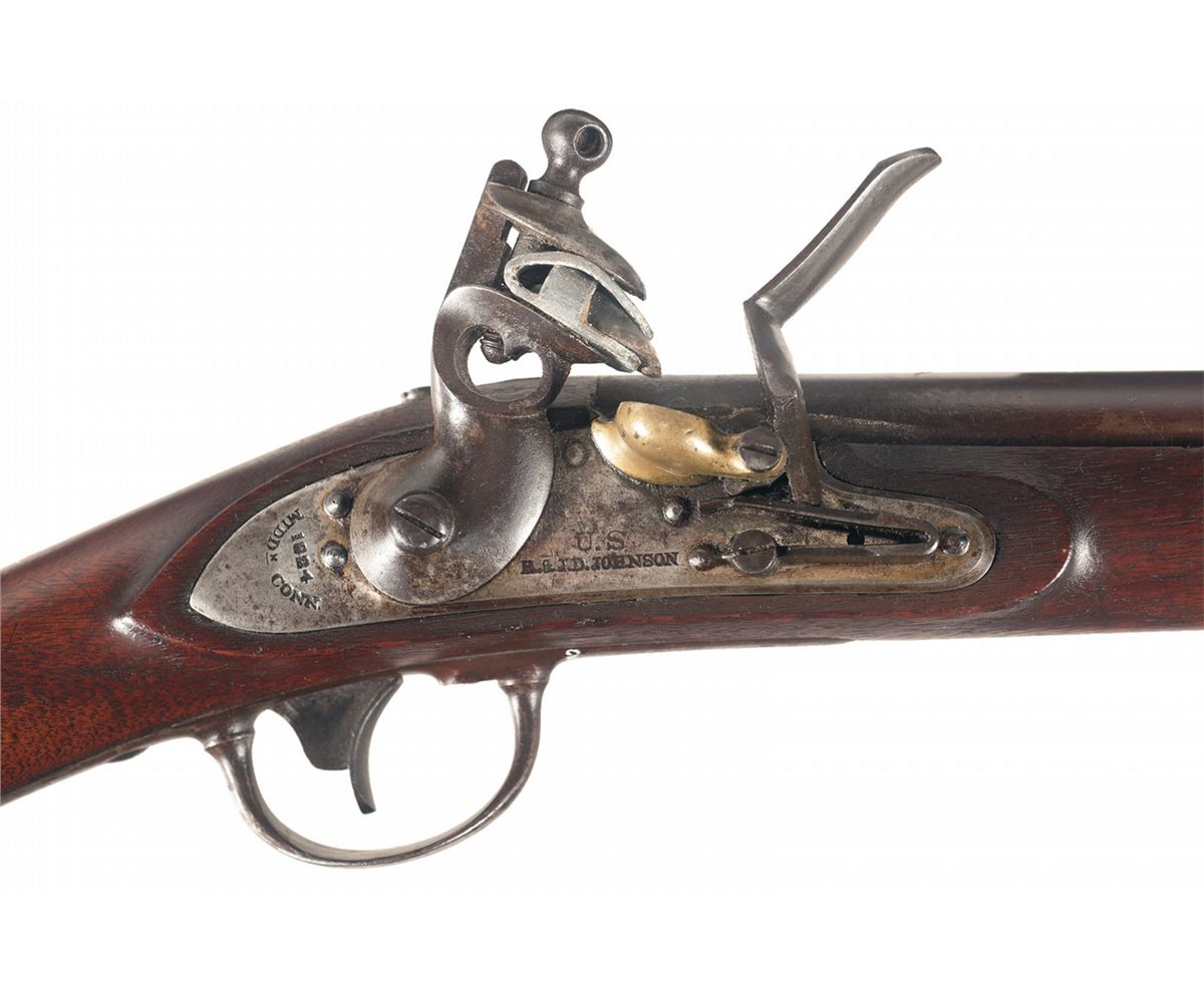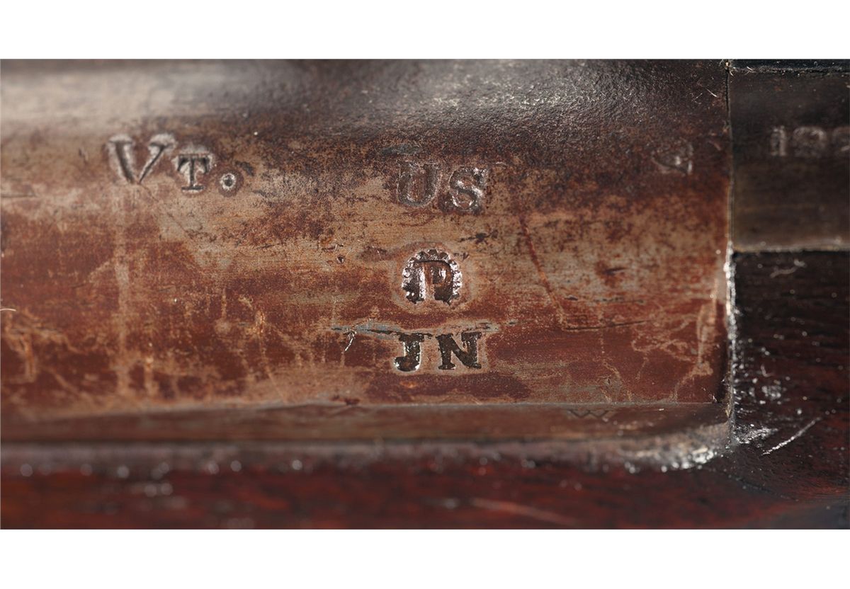 This is an excellent example of a U.S. Model 1817 "Common Rifle" that was manufactured by Robert and John D. Johnson in Middletown, Connecticut, in 1824. This rifle was manufactured during the first year of Johnsons' five year U.S. contact for 3,000 Model 1817 rifles. The lock plate is stamped with the early style markings that consist of the date "1824" over "MIDDn CONN" in a curve behind the hammer and "U.S./R & J.D. JOHNSON" in two lines in front of the hammer. The barrel tang is dated "1824". The barrel is stamped with "US" over an indented "P" proof mark and the Ordnance sub-inspector's initials "JN" perpendicular to the axis of the bore. A "VT." (Vermont) property mark is stamped just ahead of the proof and inspection marks. A small "W" sub-inspection mark is stamped on the left barrel flat and on the rear of the left stock flat. An Ordnance final inspection mark consisting of two script initials with an oval border is stamped on the left stock flat. "U.S." is stamped on the heel of the buttplate. An asterisk is stamped on the underside of the stock behind the trigger guard finial. The rifle has a round barrel with dove-tail mounted iron front sight and dove-tail mounted fixed v-notch rear sight. The lock plate has a rounded rear and beveled front with detachable brass pan and reinforced hammer. The rifle has the distinctive iron trigger guard with trigger guard plate that forms a pistol grip which supports the sling swivel and large oval iron patch box. The stock is secured by three spring fastened barrel bands. The rifle has an iron ramrod with brass trumpet-head. The barrel, trigger guard, patch box and buttplate have a brown lacquer finish. The lock plate, hammer and frizzen are casehardened. The barrel bands, band springs and side plate are bright. Known as the "Common Rifle" to distinguish it from the Hall breech-loading flintlock rifle, the Model 1817 Flintlock Rifle was the standard U.S. infantry rifle from 1817 until the adoption of the U.S. Model 1841 Rifle around the time of the Mexican War. Many Model 1817 rifles were converted to percussion during the 1850s and both flintlock and percussion Model 1817 Rifles were still in service with state militias at the outbreak of the Civil War in 1861.