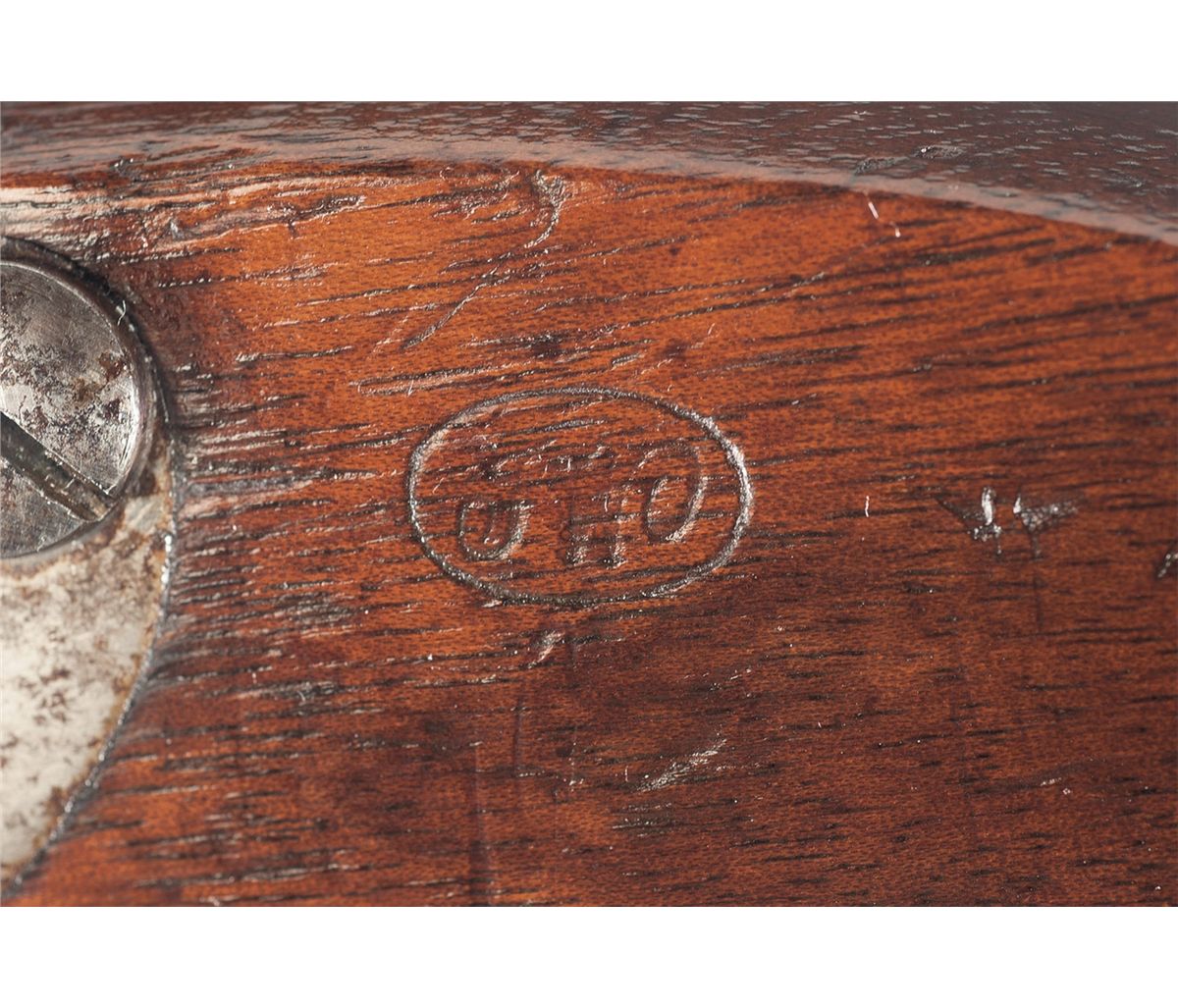 Condition: Excellent. The unissued rifle is in the original flintlock configuration and retains nearly 80% of the original brown and casehardened finish with scattered light scratches and some minor finish flaking. There is light-moderate flash pitting on the right side of the barrel surrounding the flash hole and light pitting and discoloration on adjacent areas of the hammer and lock plate. The lock plate retains strong amounts of the color casehardened finish. The hammer and frizzen have a dark patina. The nicely figured black walnut stock has sharp edges surrounding the lock plate. The edges of the left flat and barrel channel are sharp, The markings on the lock plate, barrel and stock flat are all crisp. This is an exceptional example of a Model 1817 Common Rifle in original flintlock configuration. Most of the 38,200 Model 1817 Common Rifles were issued during the rifle's long period of service and many rifles were converted to percussion. Model 1817 Common Rifles in original flintlock configuration with large amounts of original finish, like this rifle, are hard to find.