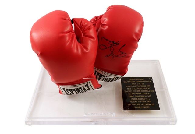 George Foreman autographed laced boxing gloves. Gloves are displayed in a plexiglass display case. (Glove approx. 12" x 7") (Case approx. 15" x 15" x 11") Display has tape glue adhered to the outside.