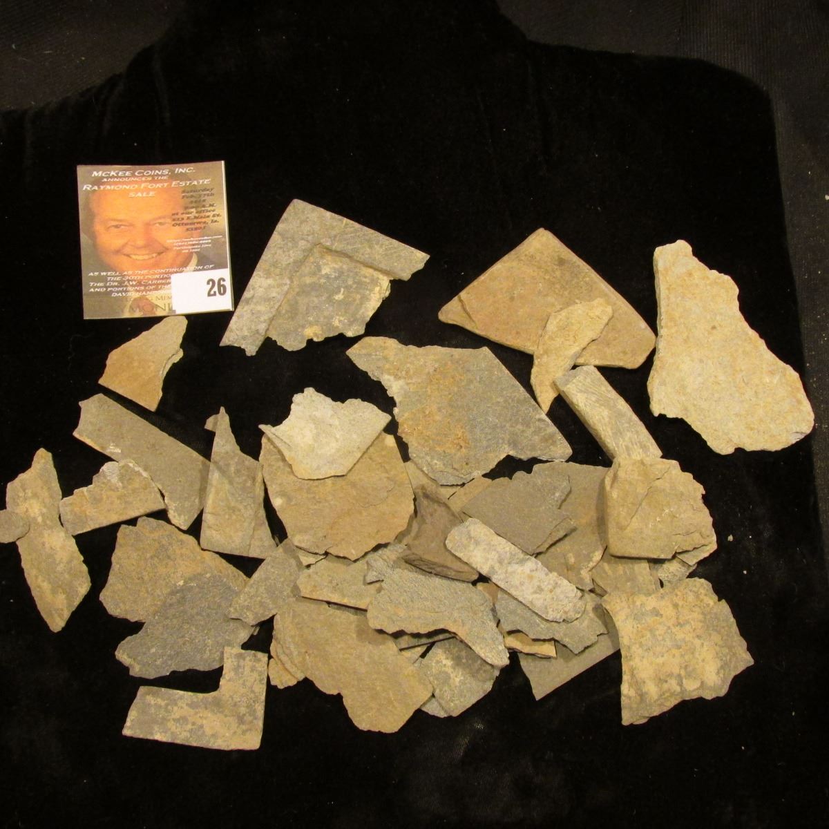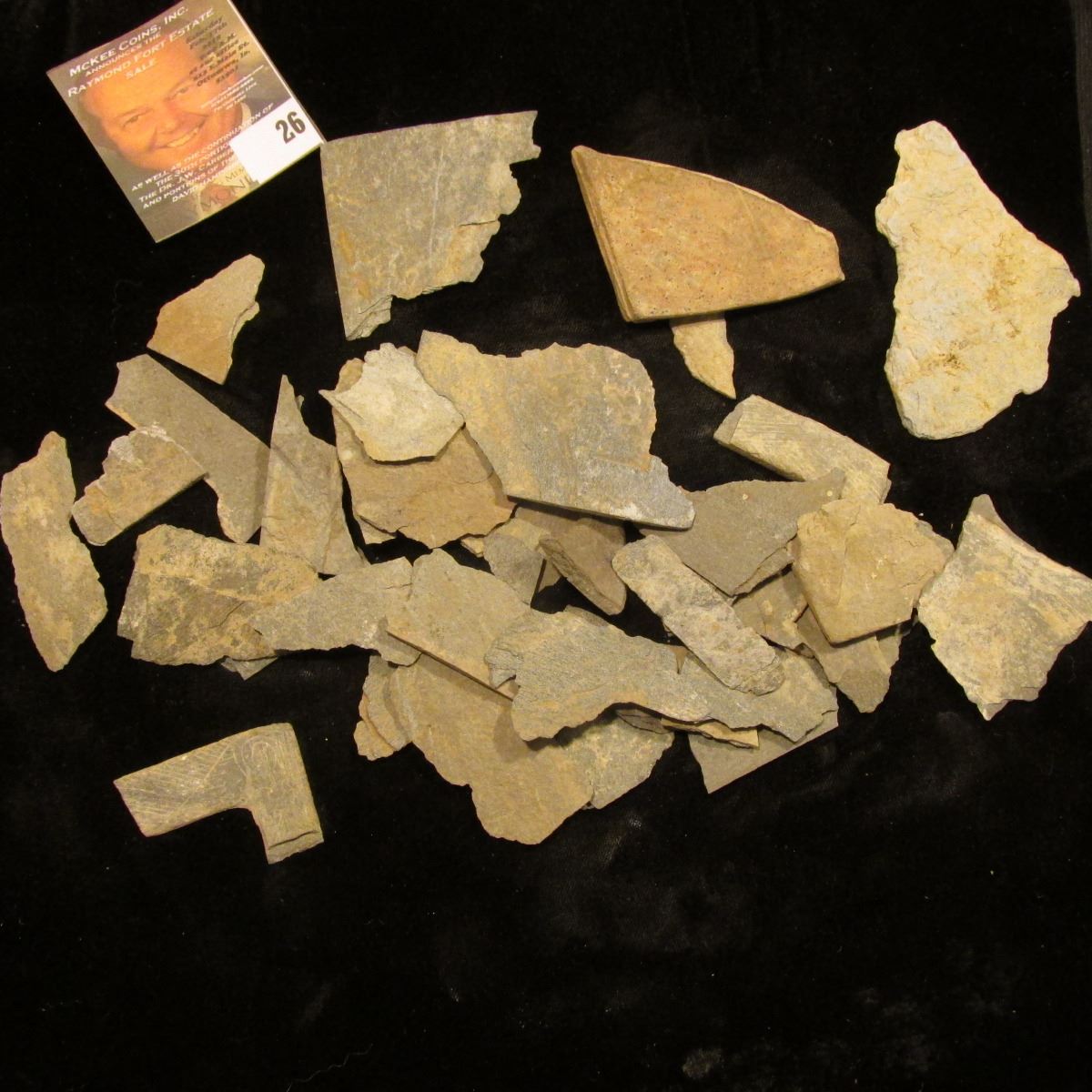 Group of field pick up or sieved slate artifacts and fragments from the Pre-Columbian era. Several exhibit incise etchings.