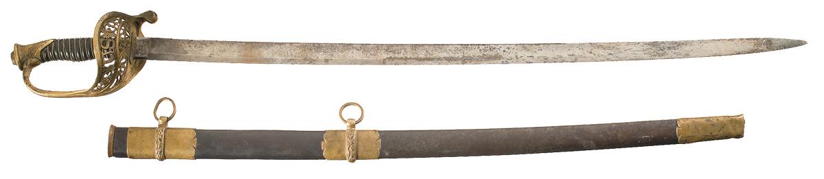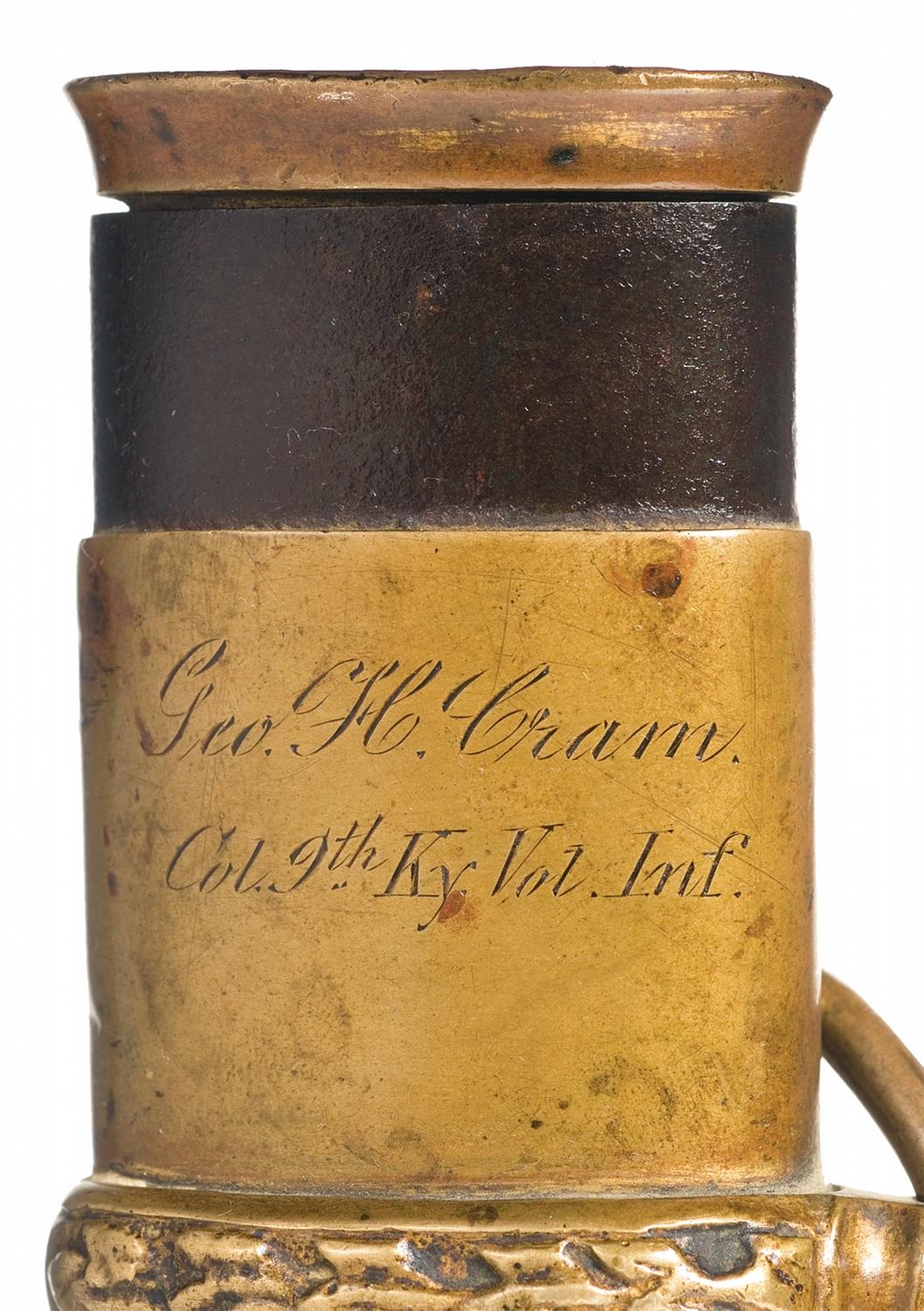 Model 1850 Staff & Field Officer's Sword with inscribed scabbard. The scabbard throat is engraved with the inscription: "Geo. H. Cramm/Col.9th Ky. Vol. Inf." in two lines. The sword has a regulation pattern 31 1/2-inch blade decorated with acid etched floral designs on the obverse and an eagle with shield on a sunburst background on the reverse. The retailer's marking: "FLETCHER/BENNETT/LOUISVILLE/KY" is etched on the reverse with the trademark "MONITOR" etched below the retailer mark on the ricasso. The sword has a regulation pattern, gold-plated, brass, two-branch guard and pommel. The outer branches of the guard have "US" and pierced floral decorations. The grip has a black leather wrapped with two strands of twisted brass wire. The regulation pattern scabbard has a browned steel body with brass throat, suspension bands and drag. The 9th Kentucky Volunteer Infantry Regiment was mustered into service in November 1861 and fought in the battles of Shiloh, Perryville, Stone's River, Chickamauga, Missionary Ridge, Kenesaw Mountain, the Siege of Atlanta and numerous smaller engagements. It was mustered out of service on December 15, 1864. The 9th Kentucky Infantry lost 8 officers and 96 enlisted men killed or mortally wounded and 3 officers and 250 enlisted men died of disease