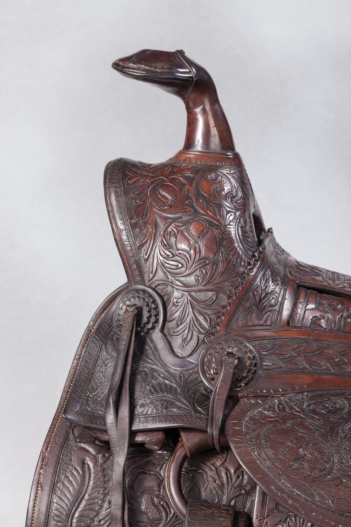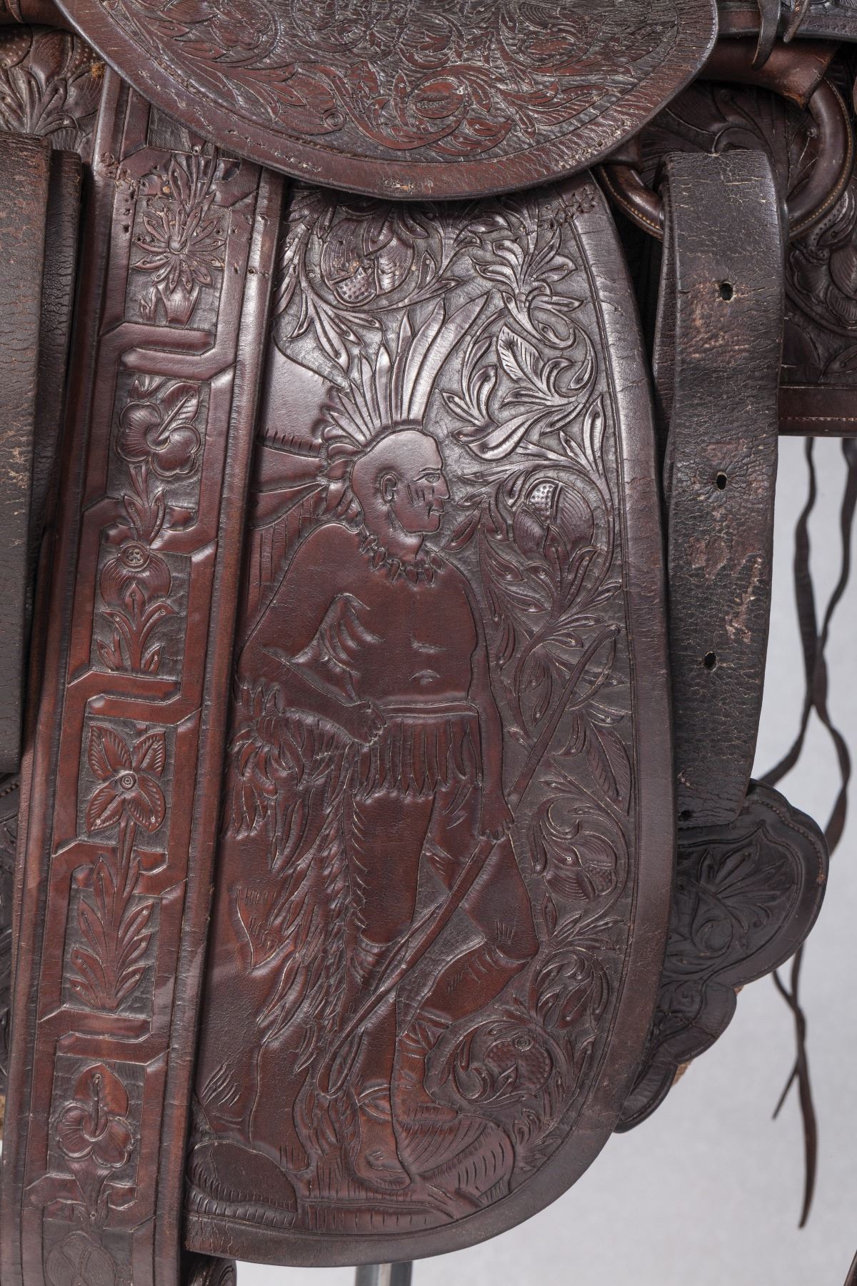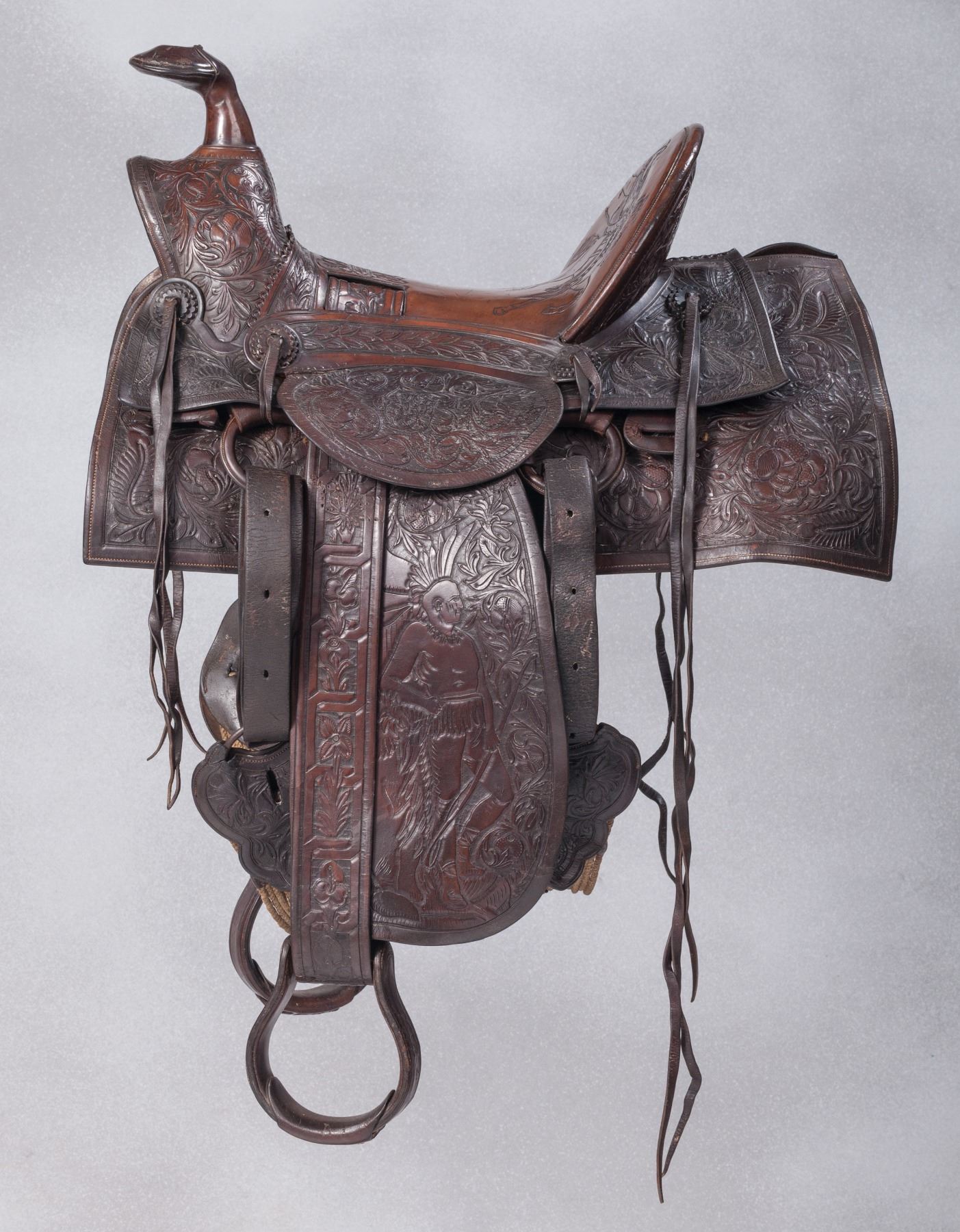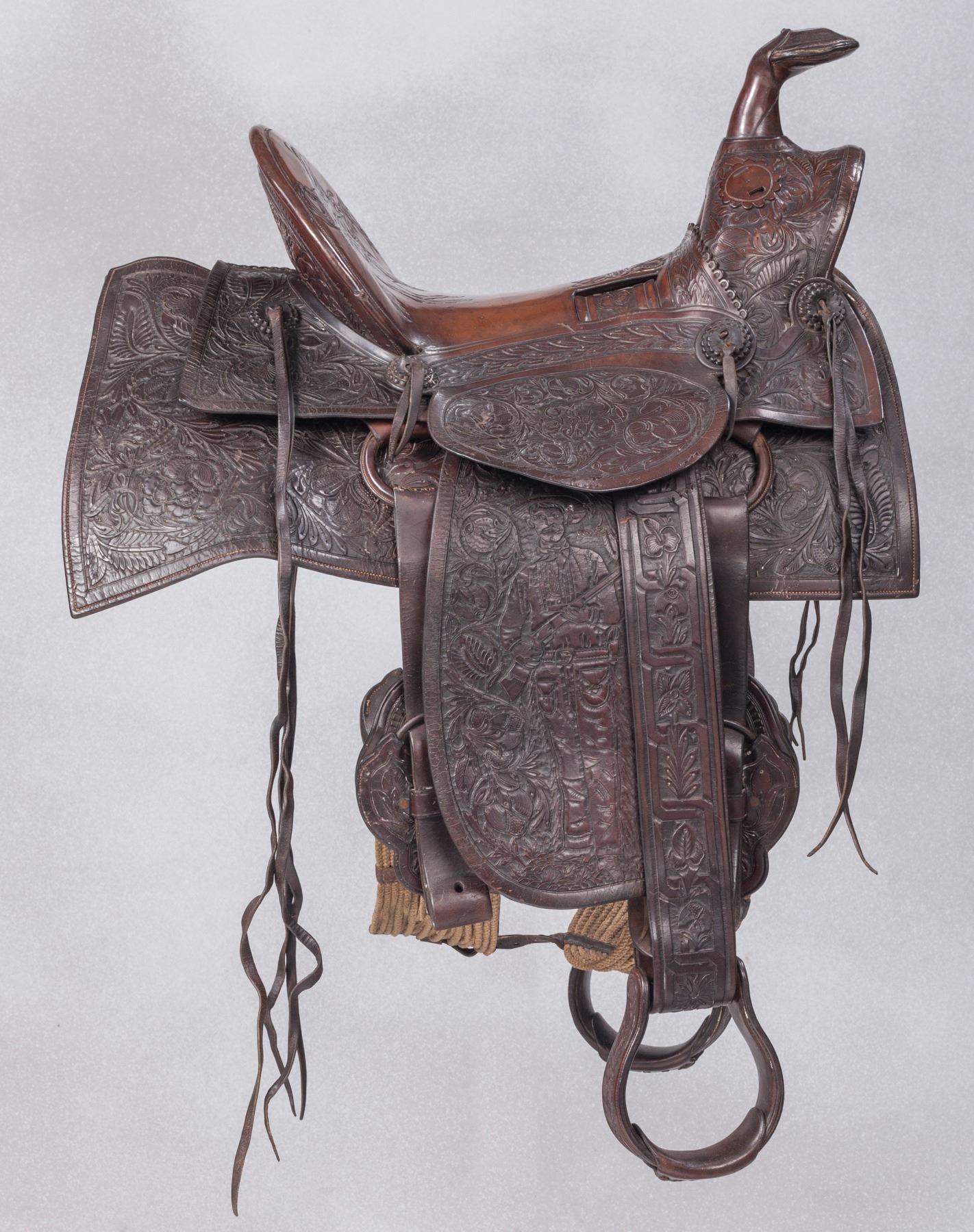 A true Territorial loop seat saddle by Moran Bros. (Miles City, Montana Territory). Exhibition quality, with beautifully carved leather. Floral and vine tooled just about everywhere, with a well-outfitted cowboy with rifle tooled on one fender, and a regal Indian with bear claw necklace on the other fender. A roping cowboy is carved on the 15" seat. Every place they could tool, they did, and this magnificent showpiece is the result. Covered oxbows, and original double horsehair cinches with covered rings. Cartouche of “MORAN BRO’S / MILES CITY. M.T." An important piece of Montana history, Buffalo Bill history, and Western collecting history. A truly special saddle.