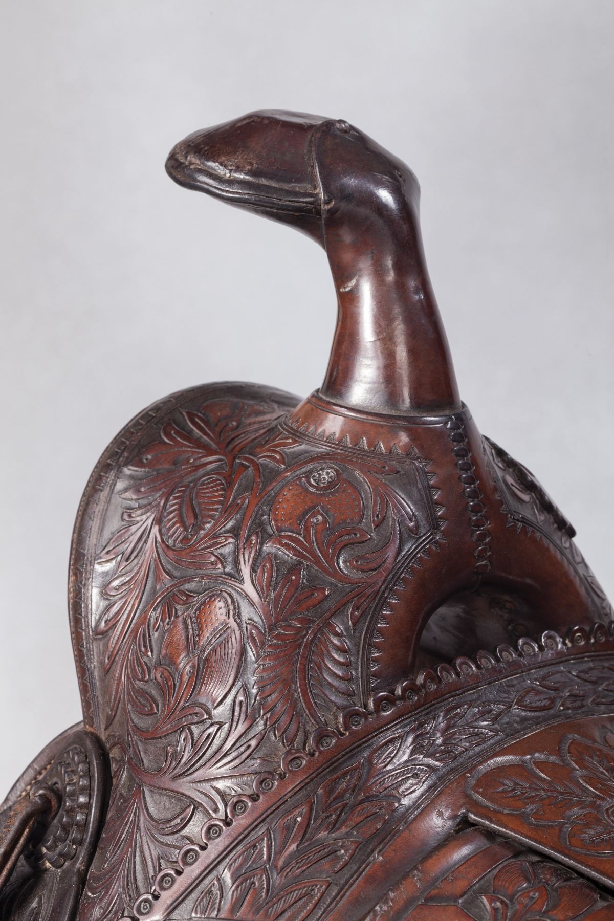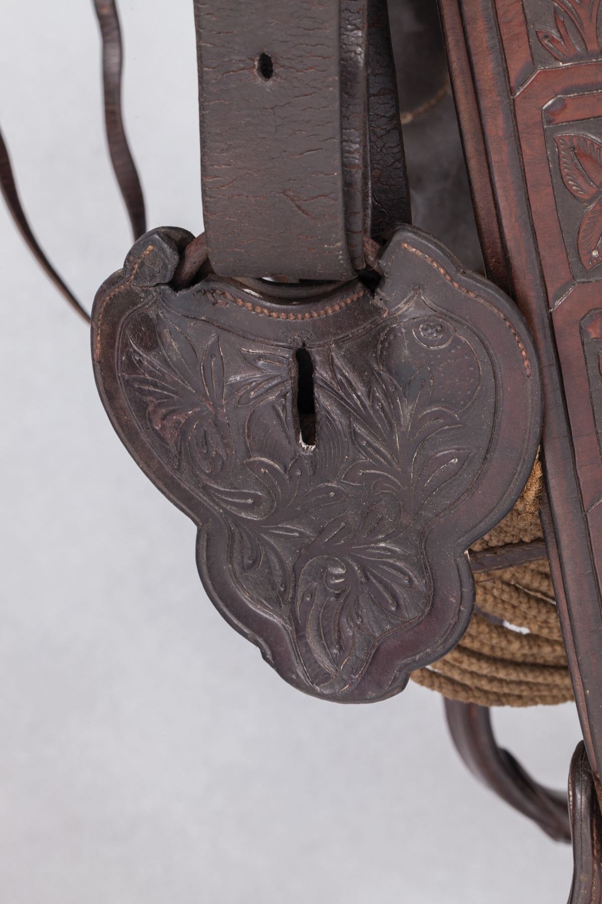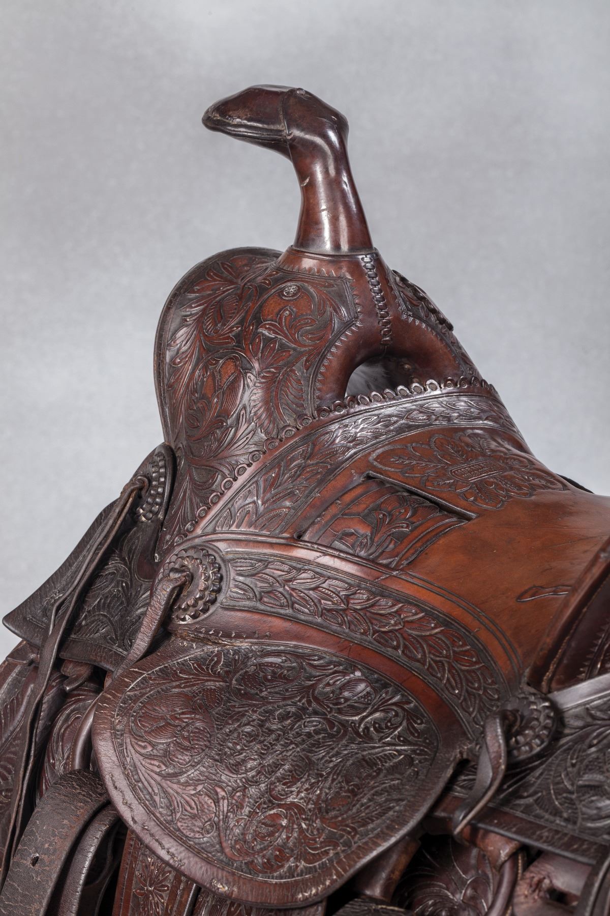 A true Territorial loop seat saddle by Moran Bros. (Miles City, Montana Territory). Exhibition quality, with beautifully carved leather. Floral and vine tooled just about everywhere, with a well-outfitted cowboy with rifle tooled on one fender, and a regal Indian with bear claw necklace on the other fender. A roping cowboy is carved on the 15" seat. Every place they could tool, they did, and this magnificent showpiece is the result. Covered oxbows, and original double horsehair cinches with covered rings. Cartouche of “MORAN BRO’S / MILES CITY. M.T." An important piece of Montana history, Buffalo Bill history, and Western collecting history. A truly special saddle.