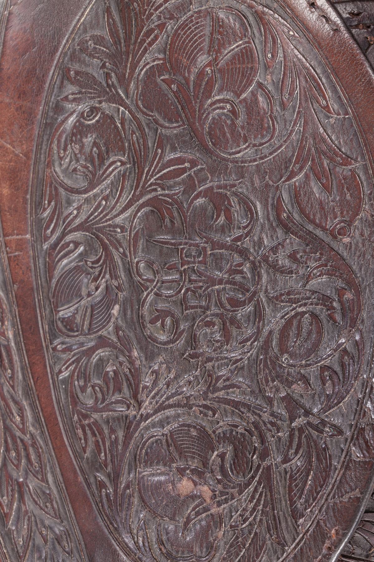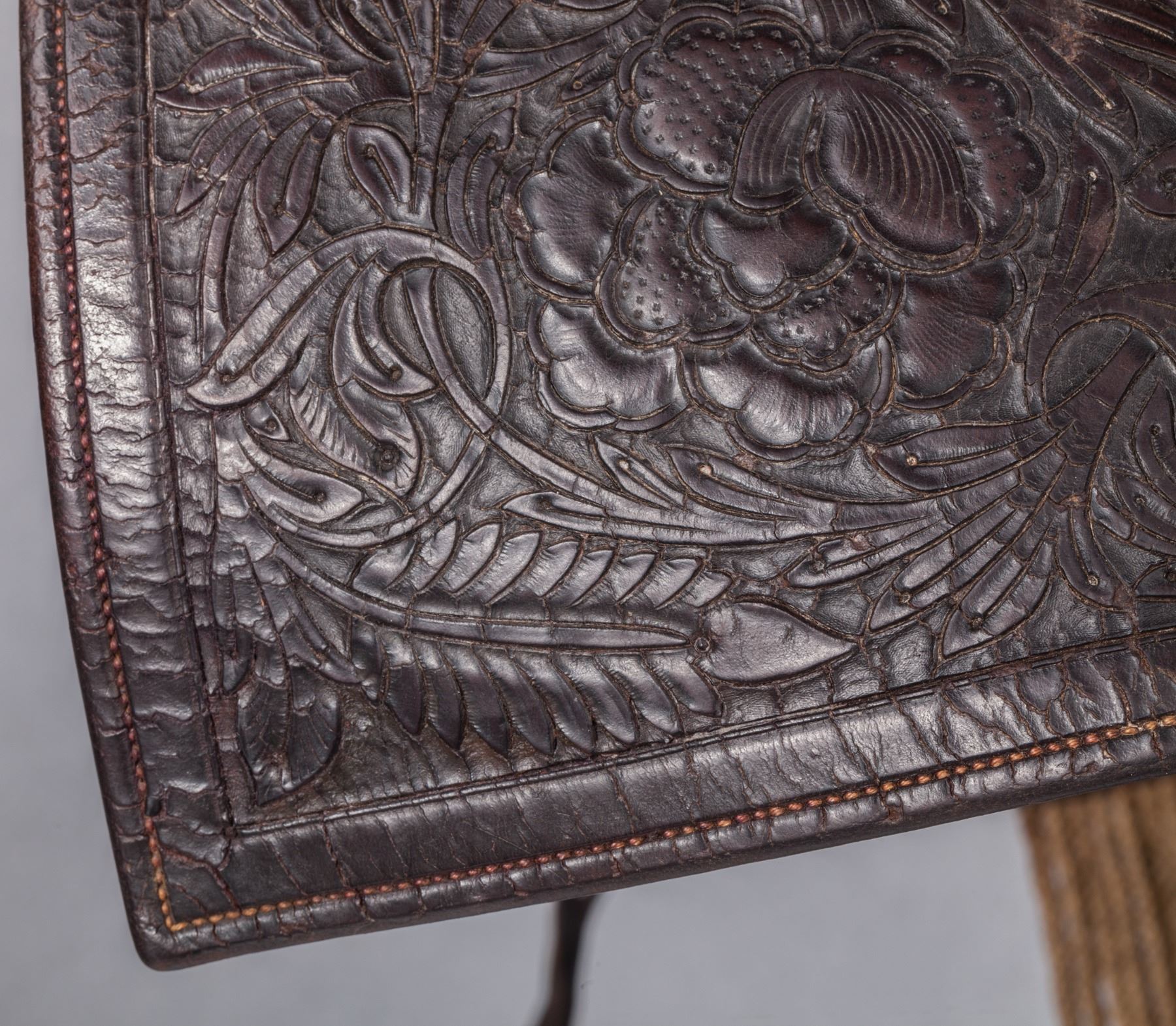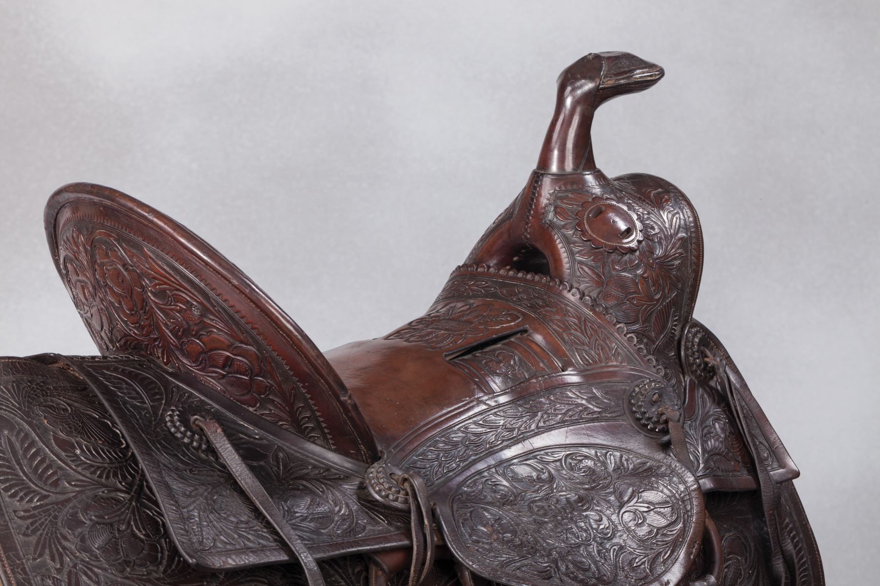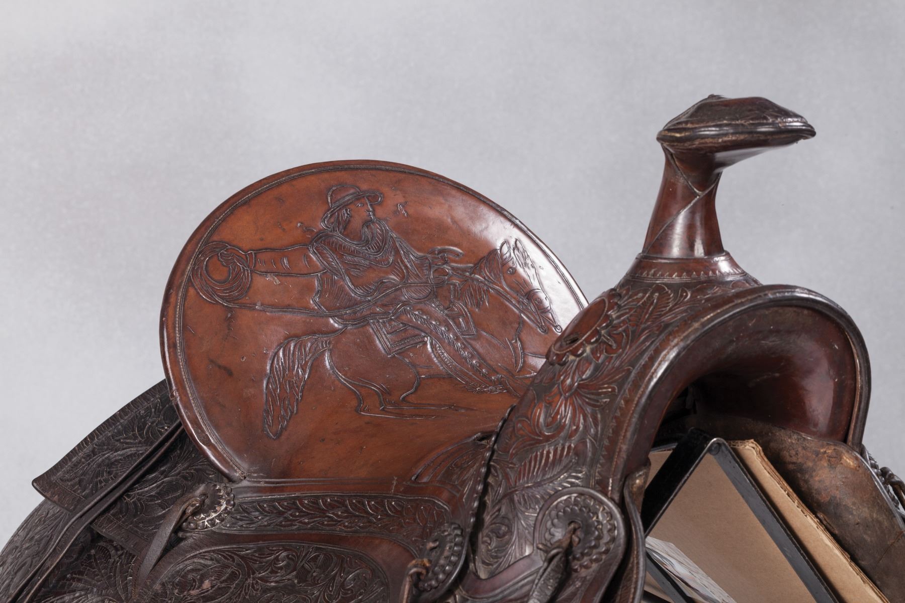 A true Territorial loop seat saddle by Moran Bros. (Miles City, Montana Territory). Exhibition quality, with beautifully carved leather. Floral and vine tooled just about everywhere, with a well-outfitted cowboy with rifle tooled on one fender, and a regal Indian with bear claw necklace on the other fender. A roping cowboy is carved on the 15" seat. Every place they could tool, they did, and this magnificent showpiece is the result. Covered oxbows, and original double horsehair cinches with covered rings. Cartouche of “MORAN BRO’S / MILES CITY. M.T." An important piece of Montana history, Buffalo Bill history, and Western collecting history. A truly special saddle.
