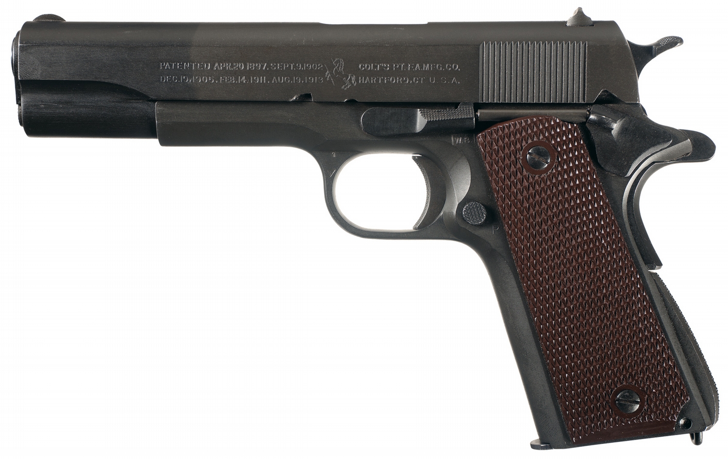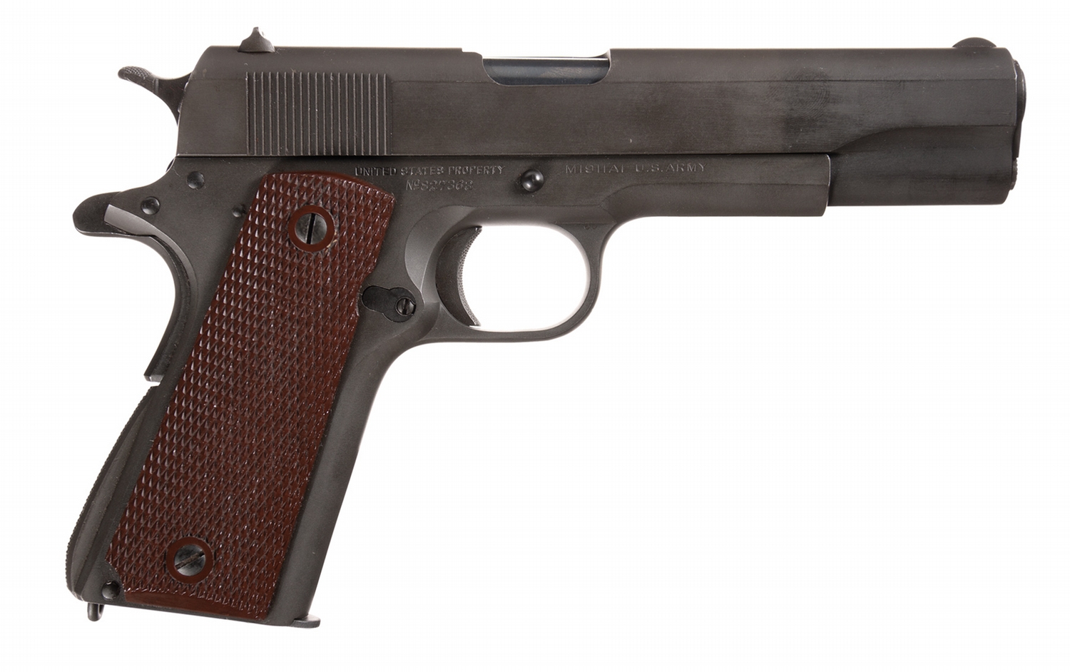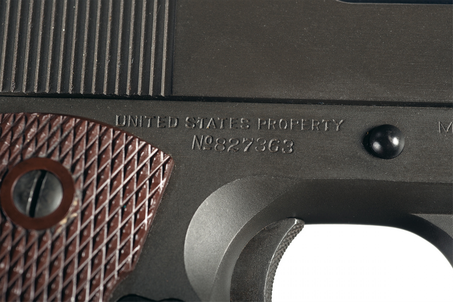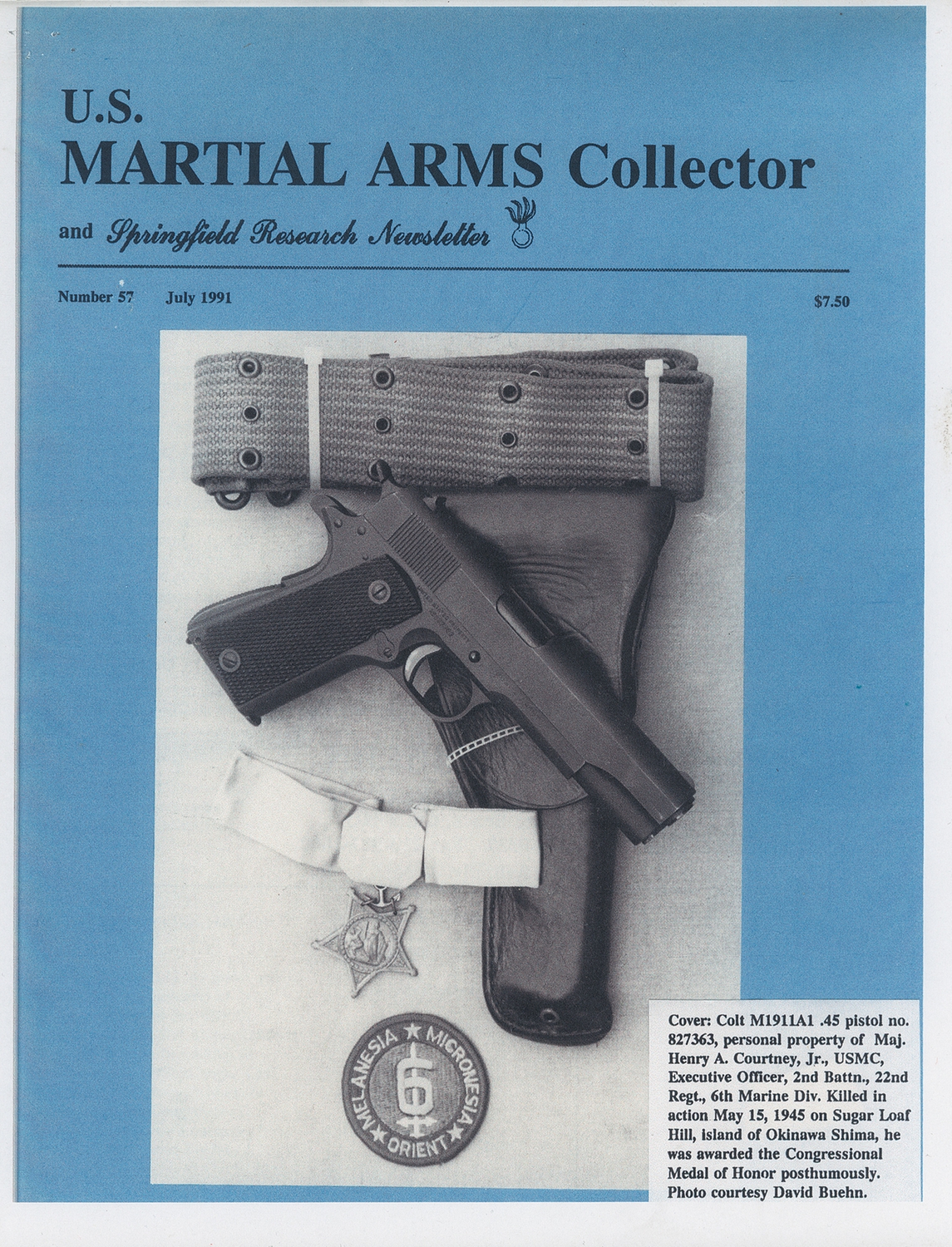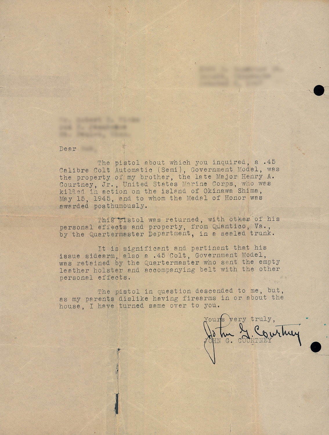 Delivered by Colt to Springfield Armory during October of 1942, this pistol was the property of United States Marine Corps Major Henry Alexius Courtney, Jr, and was delivered to his family along with his other personal effects. Born in Duluth, Minnesota in 1916, Courtney was a lawyer in civilian life before joining the Marine Reserves in 1940. Originally in charge of a reserve company from his hometown, Courtney would lead a Company of the 1st Marine Division in the Guadacanal Campaign, and become Executive Officer of the 2nd Battalion, 22nd Regiment, 6th Marine Division for the Battle of Okinawa. During this battle, Major Courtney led a night attack on Sugar Loaf Hill, a critical strong point in the Japanese defenses and one of the most hotly contested locations on the island, taking a small contingent of men to disrupt a potential Japanese counterattack during the night of May 14, 1945. During this attack, Maj. Courtney personally destroyed a large number of enemy defensive positions before cresting Sugar Loaf and discovering a large gathering of Japanese soldiers, whom he promptly attacked. While organizing his men and assisting casualties, Maj. Courtney was struck down by enemy mortar fire. From the Medal of Honor citation: "Although instantly killed by a hostile mortar burst while moving among his men, Maj. Courtney, by his astute military acumen, indomitable leadership, and decisive action in the face of overwhelming odds, had contributed essentially to the success of the Okinawa campaign". Fixed sights, with the two line, two block Colt markings on the left side divided by the Rampant Colt, "P" ahead of the rear sight, and matching number around the firing pin. "W.B" inspected frame, with "60" and "1/ VP" on the trigger guard, "P" near the magazine catch, and "UNITED STATES PROPERTY M1911A1 U.S.ARMY" on the right side over the serial number. Equipped with a checkered wide hammer, milled trigger, checkered slide catch and thumb safety, long grip safety, arched checkered mainspring housing with lanyard loop, reinforced Colt grips, a full blue commercial magazine, and a blue "COLT 45 AUTO/ P" marked barrel. Included with the pistol are a green canvas web belt and a brown leather "BOYT/ 44" holster, a letter from John C. Courtney, Henry Courtney's brother, who identifies the pistol, holster and belt as the Major's personal items, and a large number of other papers, including a photocopy of the July 1991 edition of U.S. Martial Arms Collector and Springfield Research Newsletter, which featured this pistol, a copy of the Medal Citation from the Commandant of the Marine Corps, copies of several articles related to the Major and his assault on Sugar Loaf Hill, and the books "Okinawa: Victory in the Pacific" by Major Chas. Nichols and "History of the Sixth Marine Division" by Bevan Cass, both with pages relevant to the Major flagged. Please note that while Marine Corps records confirm this as being Major Courtney's pistol, the sidearm he had with him during the Sugar Loaf attack was retained by the Marine Corps.