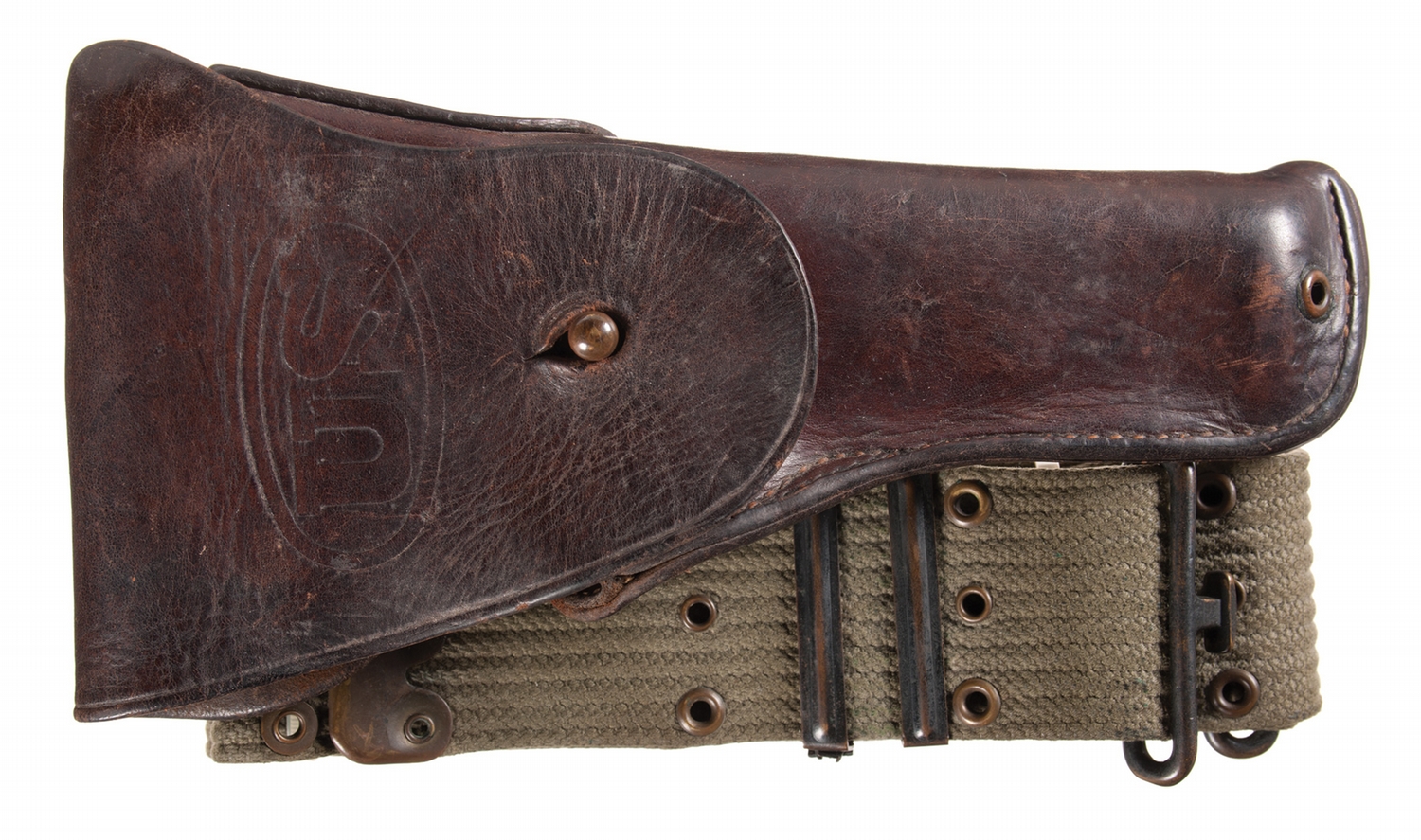 Condition: Excellent plus, showing 99% plus original parkerized finish, with only minor holster wear. The barrel shows a minimal amount of cycling wear, with over 97% of the original blue finish. Grips are excellent, with sharp checkering. The holster has been oiled, with a medium russet color overall, minor scuffs, and strong markings, with the web belt in similar condition. Mechanically excellent. A superb example of a "WB" inspected 1911A1 pistol, with immeasurable value as an artifact from the Battle of Okinawa.