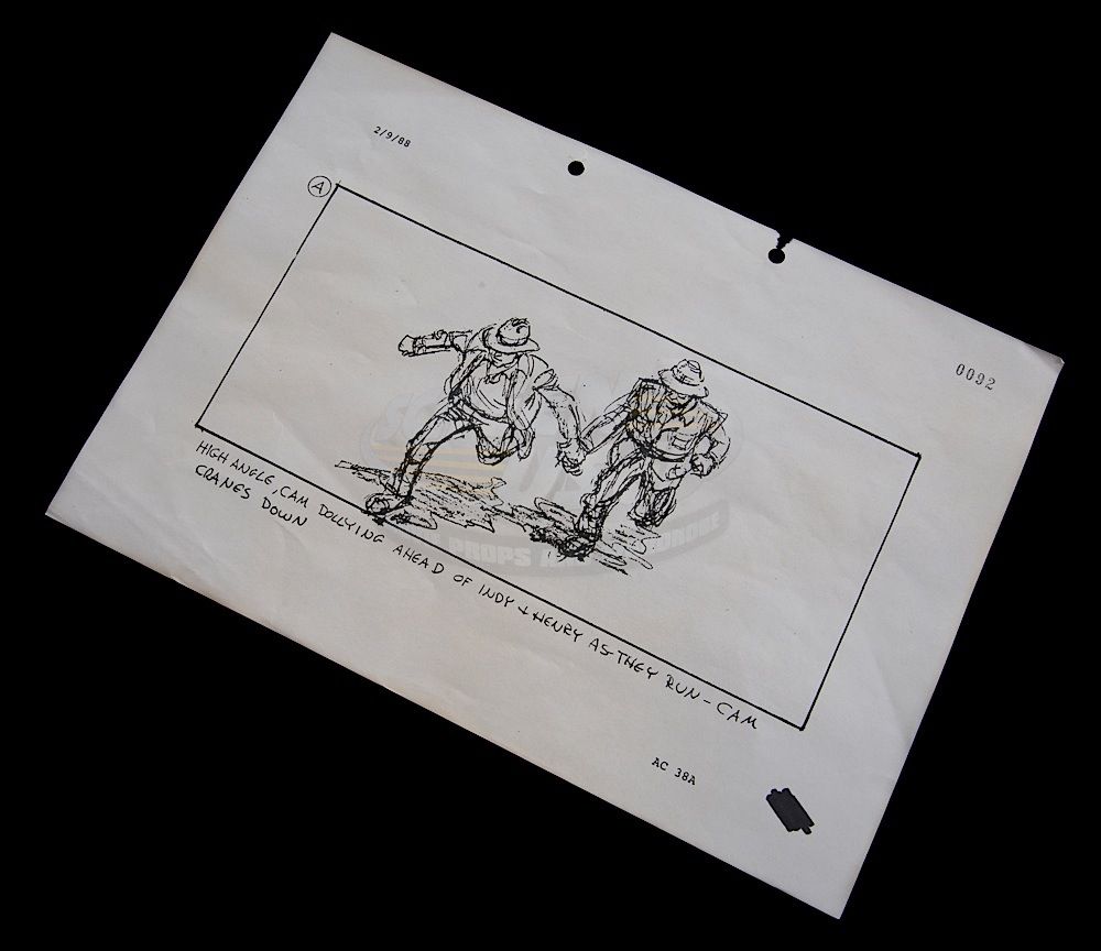 (Paramount Pictures, 1989) This original production used storyboard page depicts Indy and Henry Jones running. The description of the shot and date are in the margins. Wear from use is present, measures 8.5" x 11".