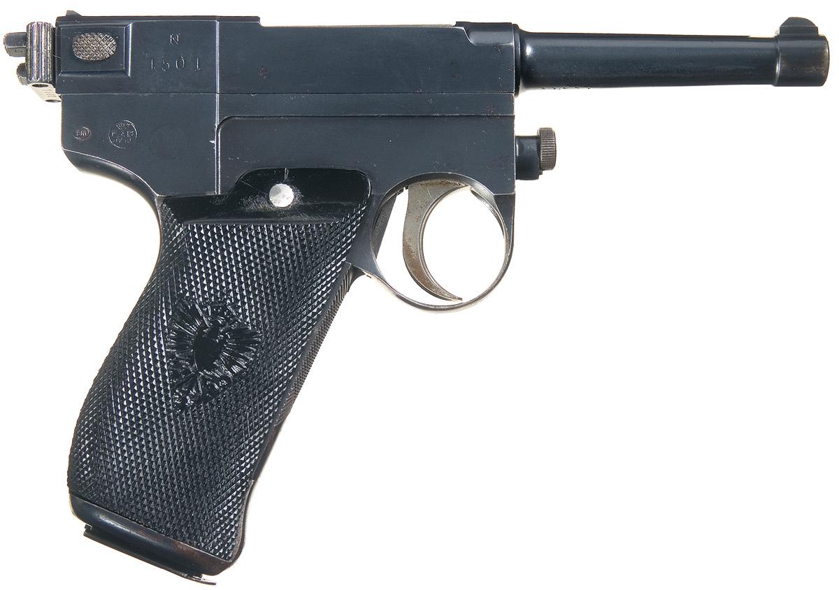 Condition: Very fine. The pistol retains 85% faded original blue finish with some thinning and wear on the muzzle, some edge wear and some minor spotting on the grip straps, grip safety and trigger guard. There is a small amount of scattered minor pitting on the slide. The replacement grips are very good with a repair at the top of the right panel, the left panel is a little loose and overall there are light handling marks with sharp checkering. Crisp and clear markings. The action is fine.