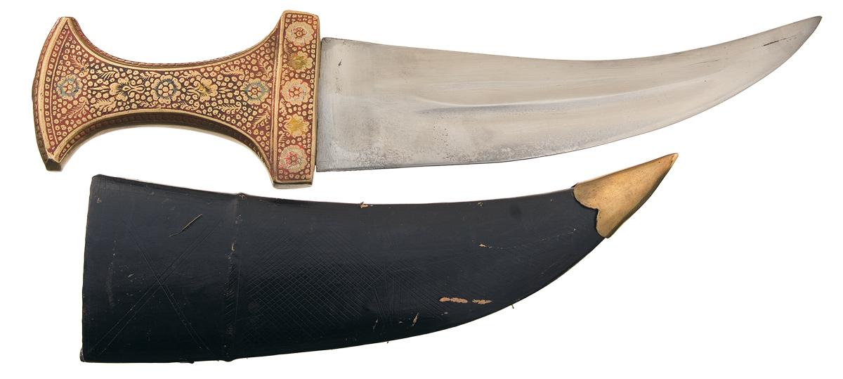 Curved double fuller blade, measuring 8 1/2" long and 2 1/4" wide at the base, with no visible maker's marks. The hilt is solid brass, with raised engraved floral and dot patterns, white, yellow and blue enamel accents on the floral sections and red enamel fill overall. OAL: 13" With a black leather sheath covered with crosshatched designs, with brass tip and leather belt hanger.