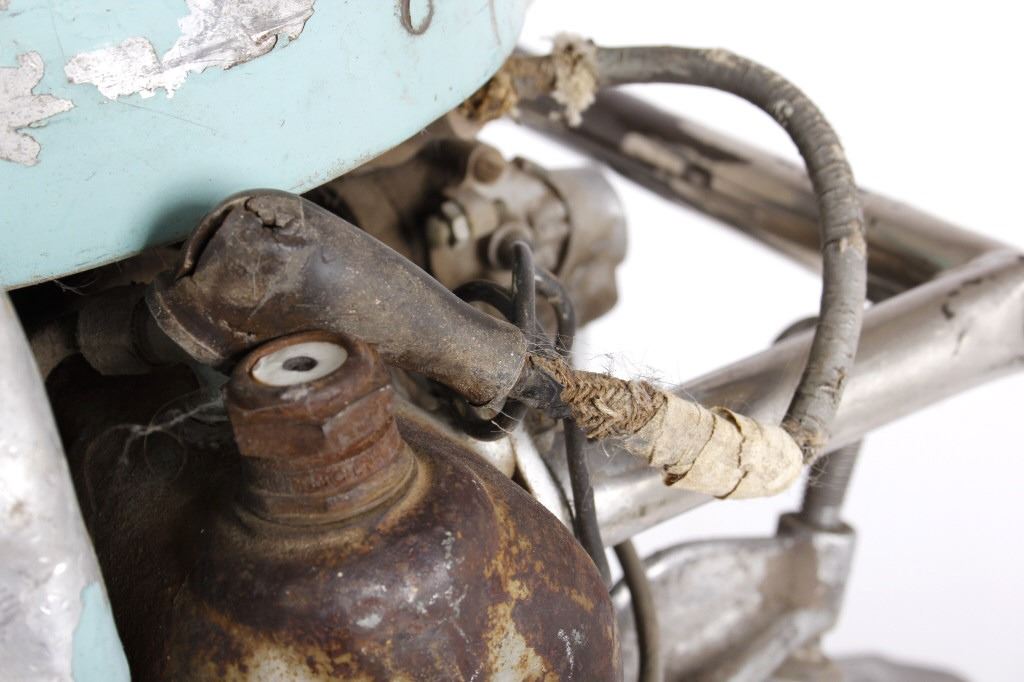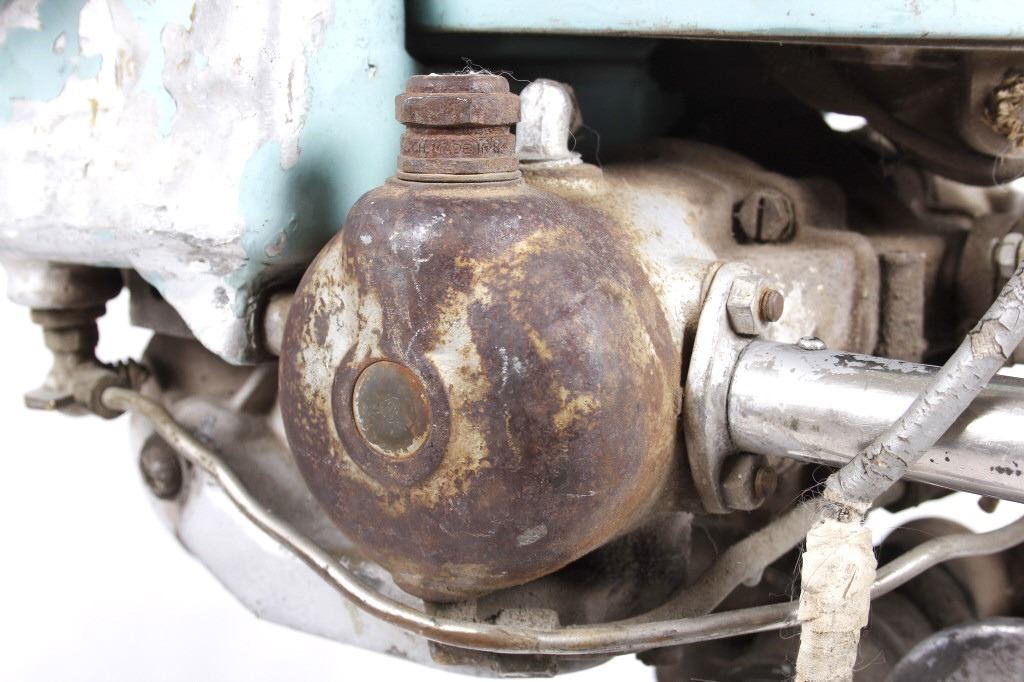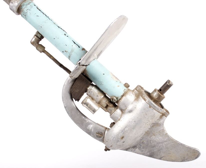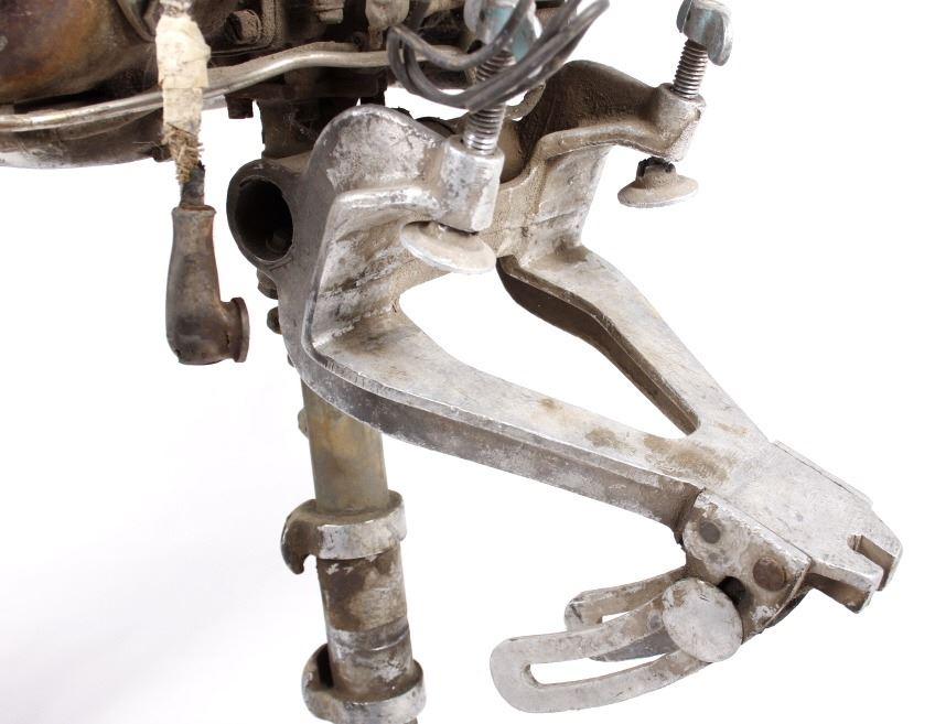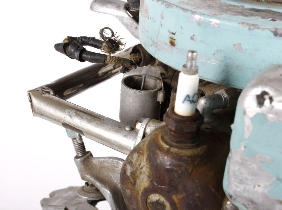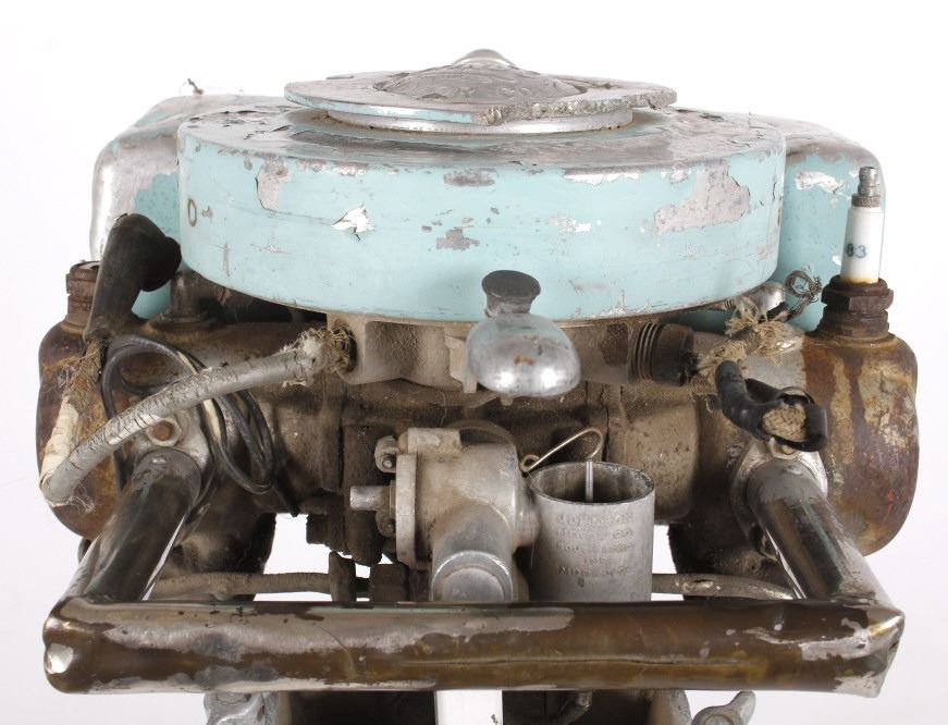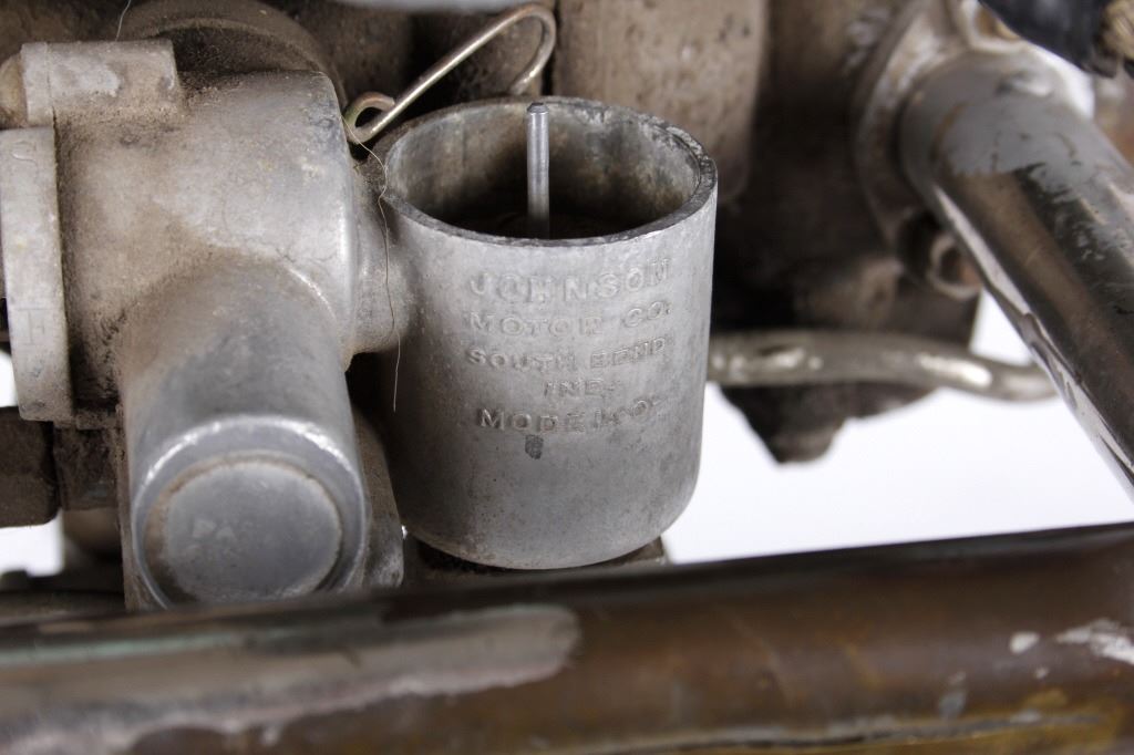 This item is a circa 1926 Johnson Motor Company, Model A-25 Outboard Motor. This is the successor to the first outboard series ever created by Johnson Outboards and it came with many innovative features like rope starting and a reliable flywheel magneto from the Quick Action Magneto Co.. Additionally, the outboard features 360 degree steering, and manual tilt for shallow water, and beaching. The motor is stamped on the top; "Model A-25 - South Bend, IND. U.S.A. - JOHNSON Motor CO. - Serial 31754". Overall, the outboard is in fair condition, it is absent of a prop, and shows other cracked and broken components. The outboard measures 35" tall, approximately 18" deep, and 11 1/2" wide.