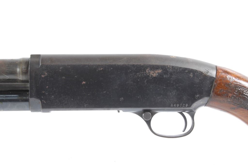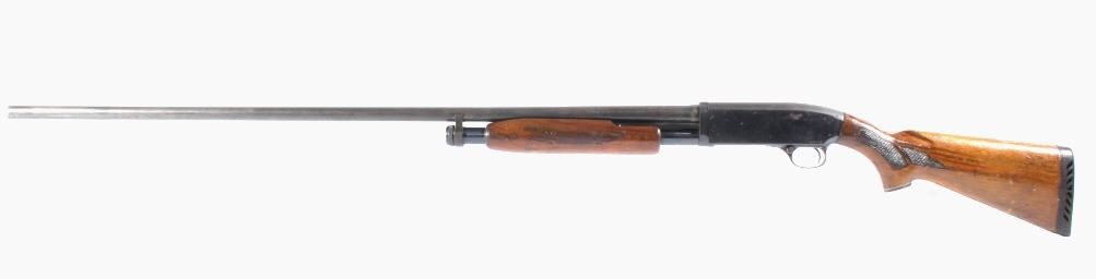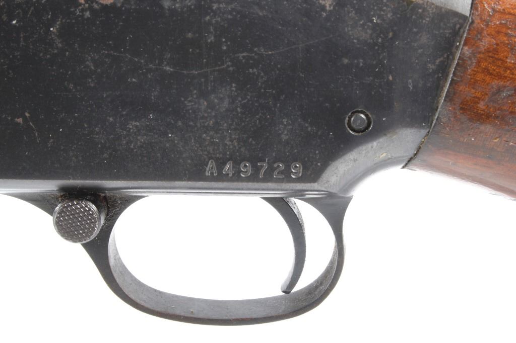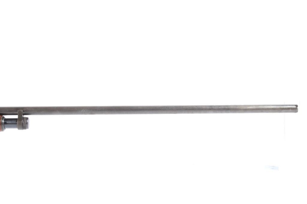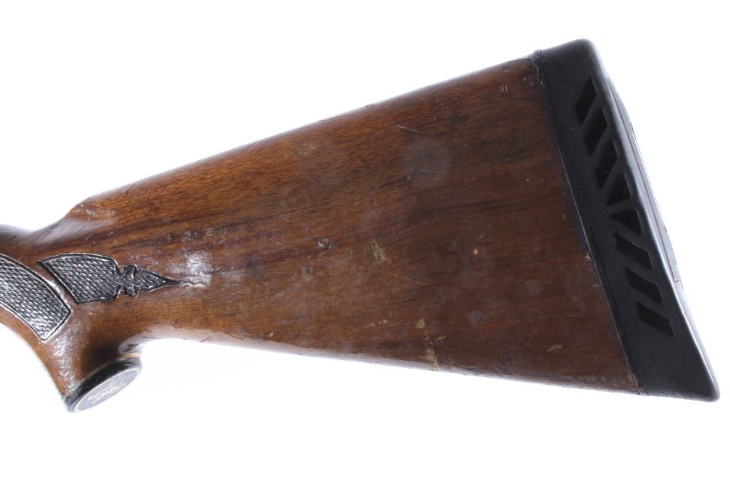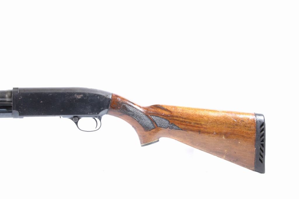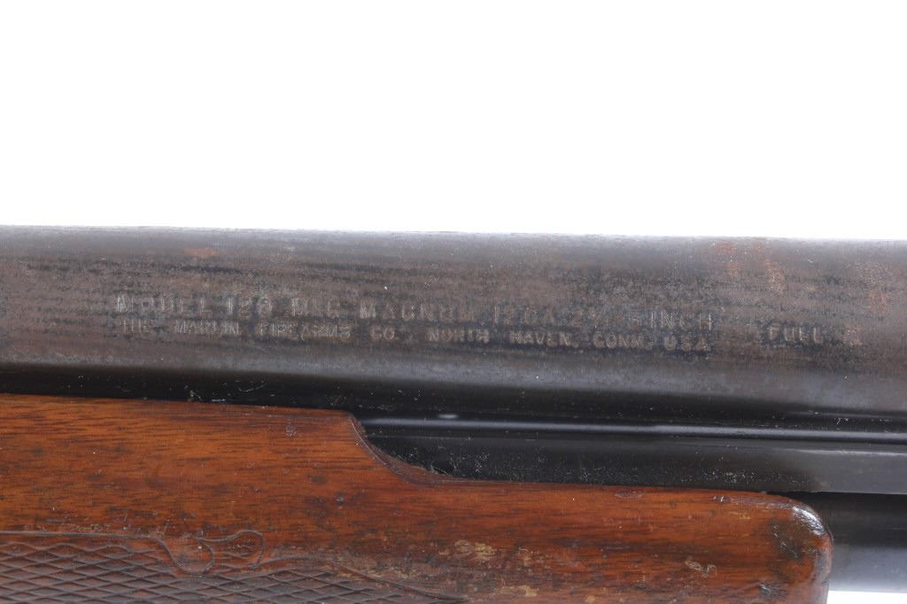 This lot features a Unique Scarce Marlin Model 120 MXR Magnum 12 Gauge 40" Barrel Shotgun. The shotgun features a 40" barrel, fixed full choke, walnut stock, cross bolt safety, and a blue'd finish. The Marlin Model 120 MXR Magnum shotgun was made from 1974 to 1975. There were a total of 6,984 of the 40 inch barreled guns made at that time. It sold for $158.95 in 1974. The 40 inch barrel was advertised by Marlin to "reach out for the long ones, and shoots quieter and balances surprisingly well." The shotgun shows good condition, with wear to the finish and handling marks. The mechanics are smooth and tight. The bore is shiny. This is a Modern firearm. FFL transfer or NICS background check required. The serial number is A49729.