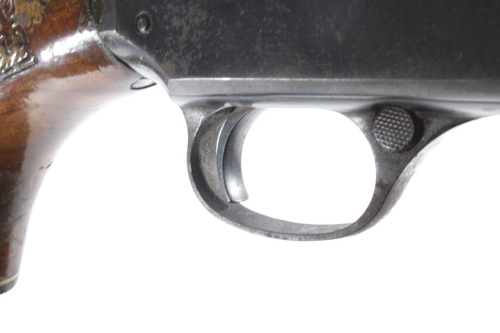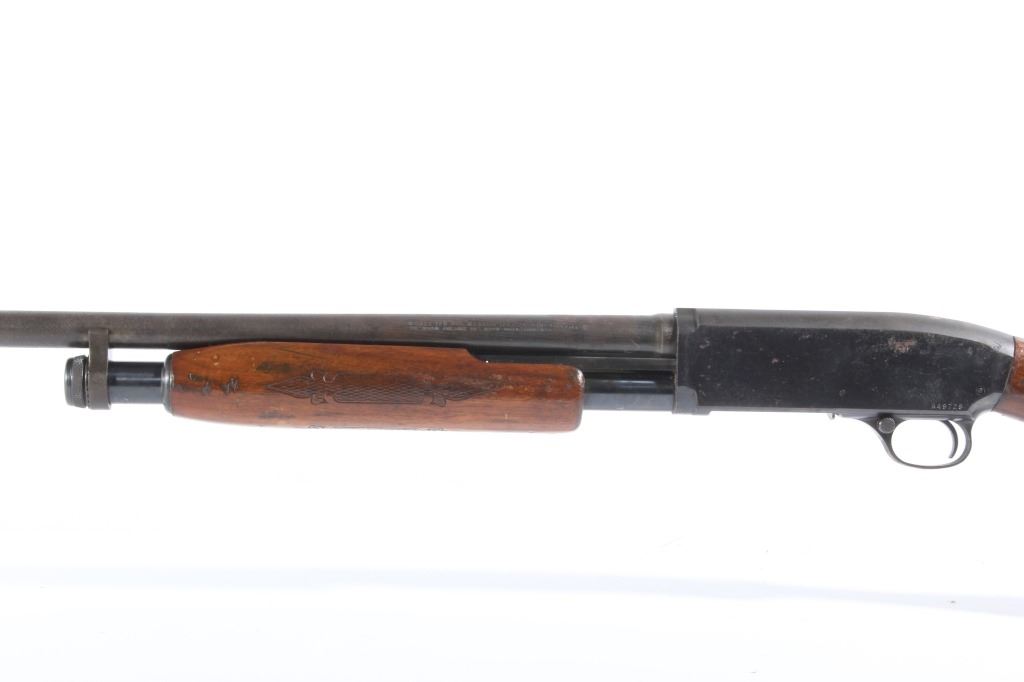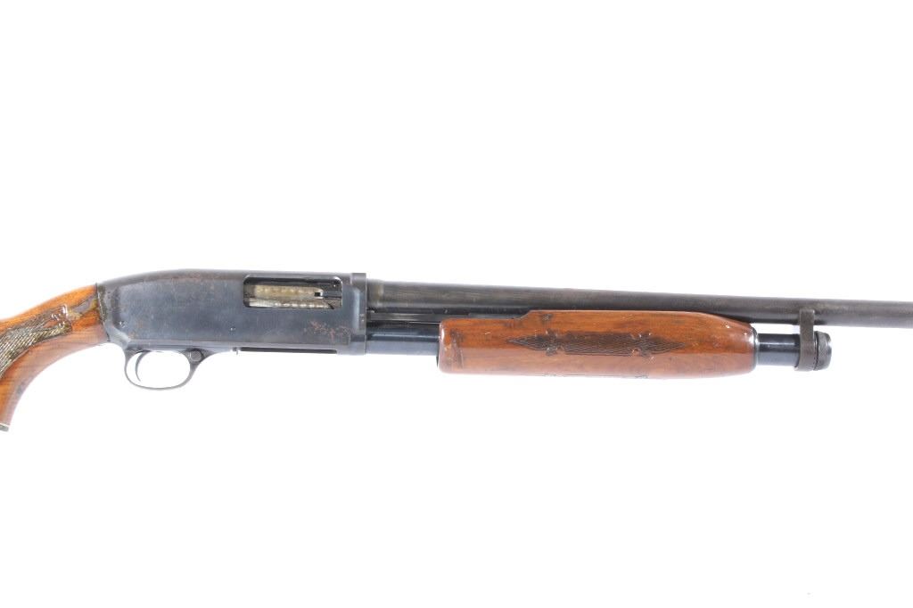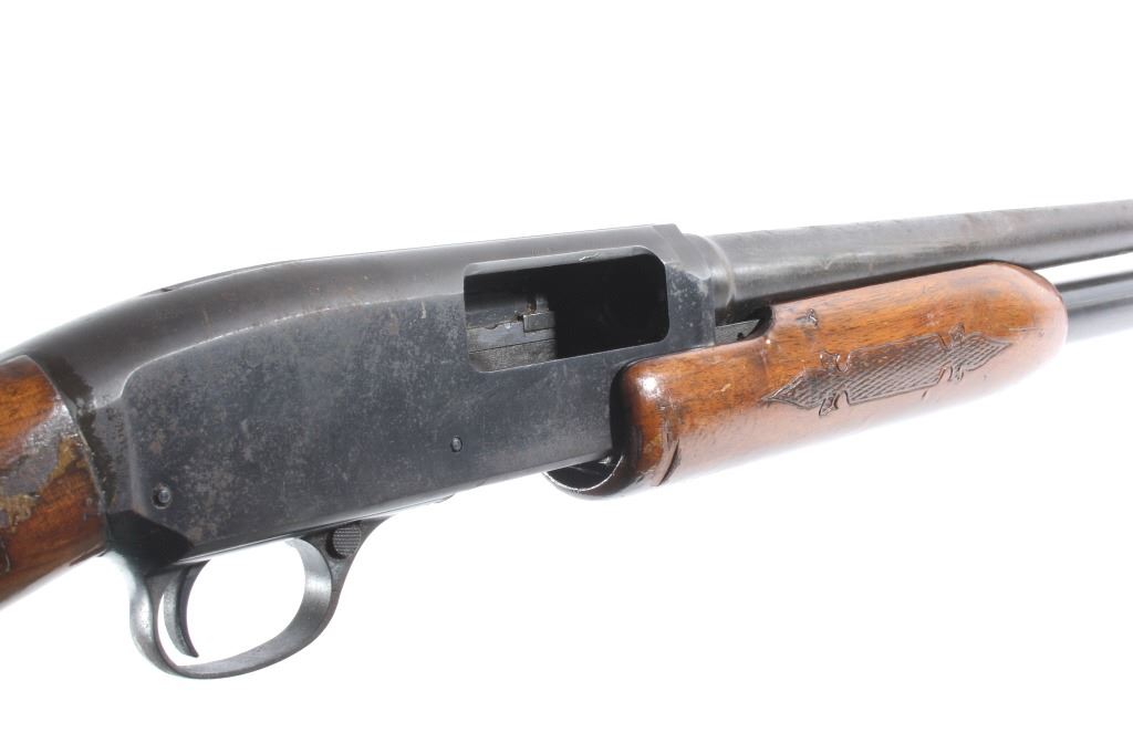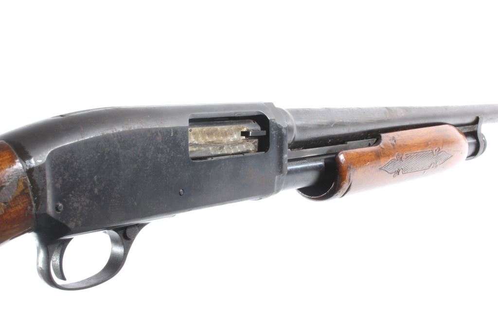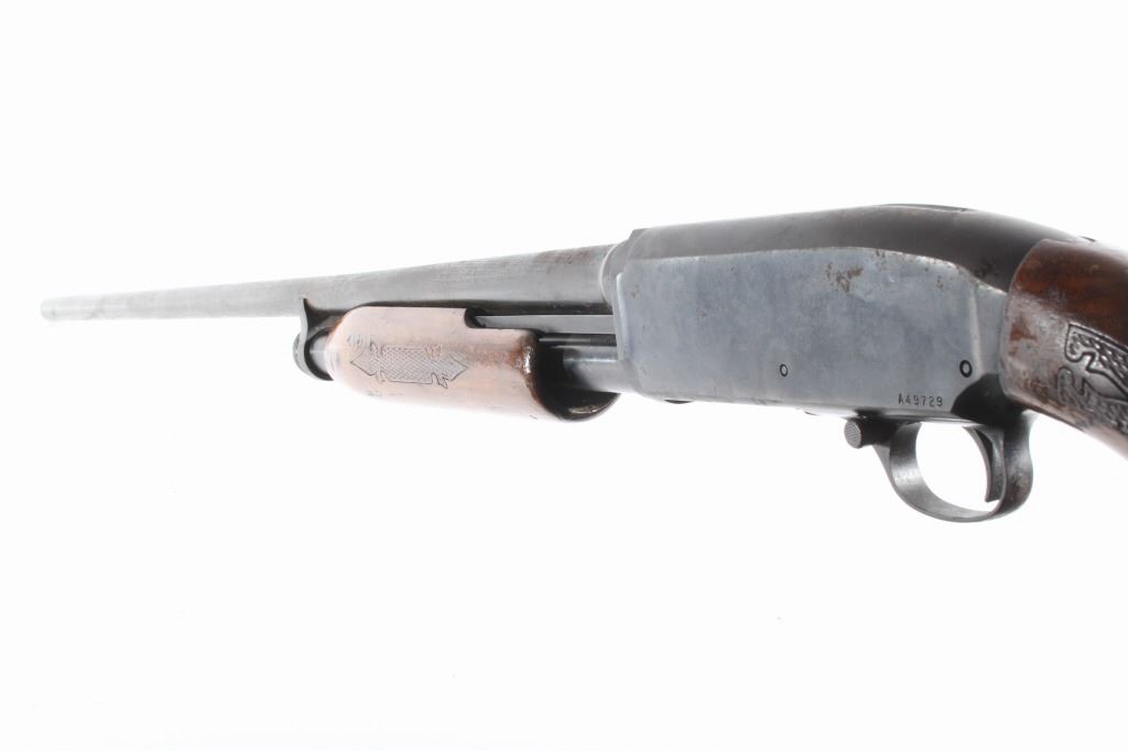 This lot features a Unique Scarce Marlin Model 120 MXR Magnum 12 Gauge 40" Barrel Shotgun. The shotgun features a 40" barrel, fixed full choke, walnut stock, cross bolt safety, and a blue'd finish. The Marlin Model 120 MXR Magnum shotgun was made from 1974 to 1975. There were a total of 6,984 of the 40 inch barreled guns made at that time. It sold for $158.95 in 1974. The 40 inch barrel was advertised by Marlin to "reach out for the long ones, and shoots quieter and balances surprisingly well." The shotgun shows good condition, with wear to the finish and handling marks. The mechanics are smooth and tight. The bore is shiny. This is a Modern firearm. FFL transfer or NICS background check required. The serial number is A49729.