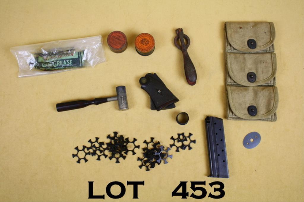 Misc. small lot of collectible items including a triple military canvas pouch for half moon clips for the WW I .45 caliber Smith & Wesson or Colt revolver, a pair of Smith & Wesson checkered wood gold medallion grips for a hand ejector model, two antique percussion cap tins, one by Union Metallic, the other by American Flask & Cap; a tube of Winchester gun grease, several reloading pieces and an unmarked semi-auto pistol magazine. Est.: $100-$150.