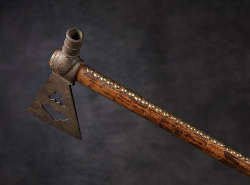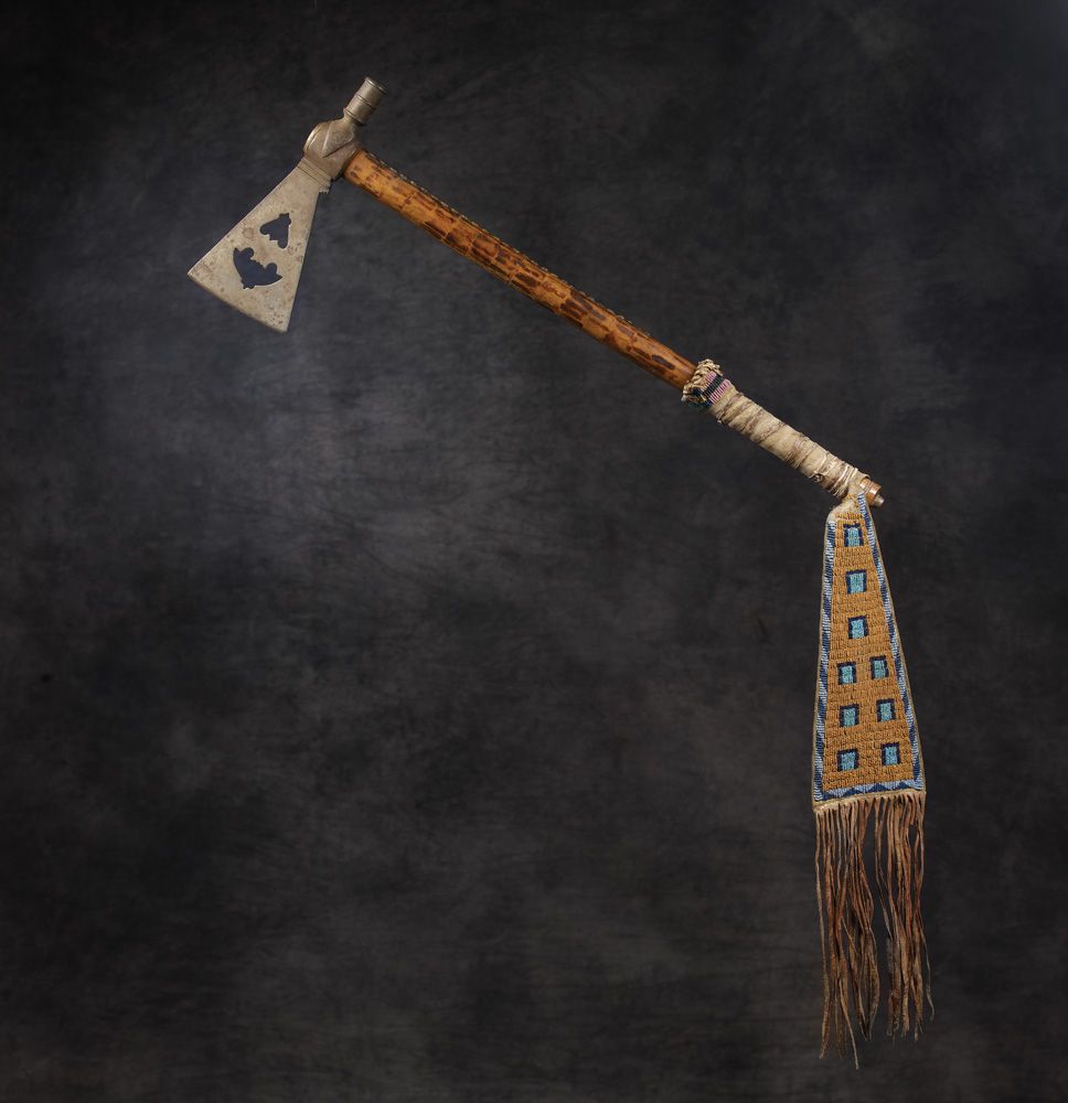 24 1/2" length of shaft with brass tacks, iron file branding, a Double Bat Wing, 10" x 4 1/4" iron head and a 20" beaded drop (including fringe) in three shades of blue, pink, yellow and green. Horse tracks on a pumpkin background and red dyed fringe. Drop made on native tanned buffalo hide. Great patina and condition with a few beads missing at the neck, c 1870. A true Indian Wars Tomahawk