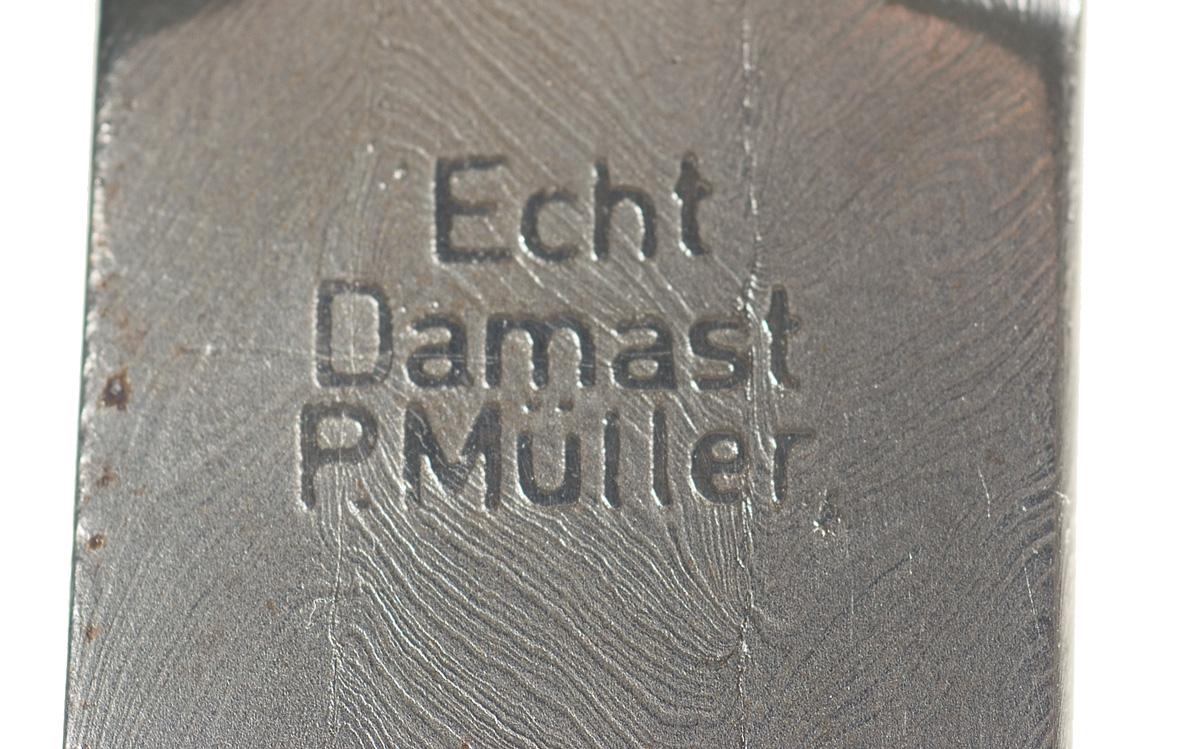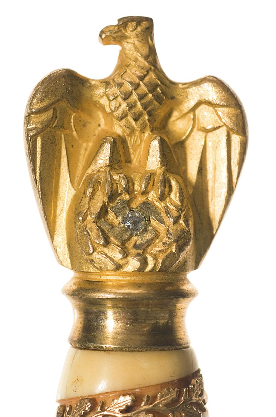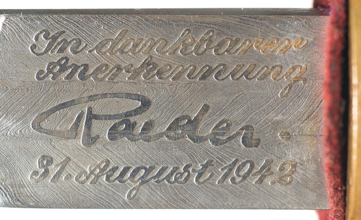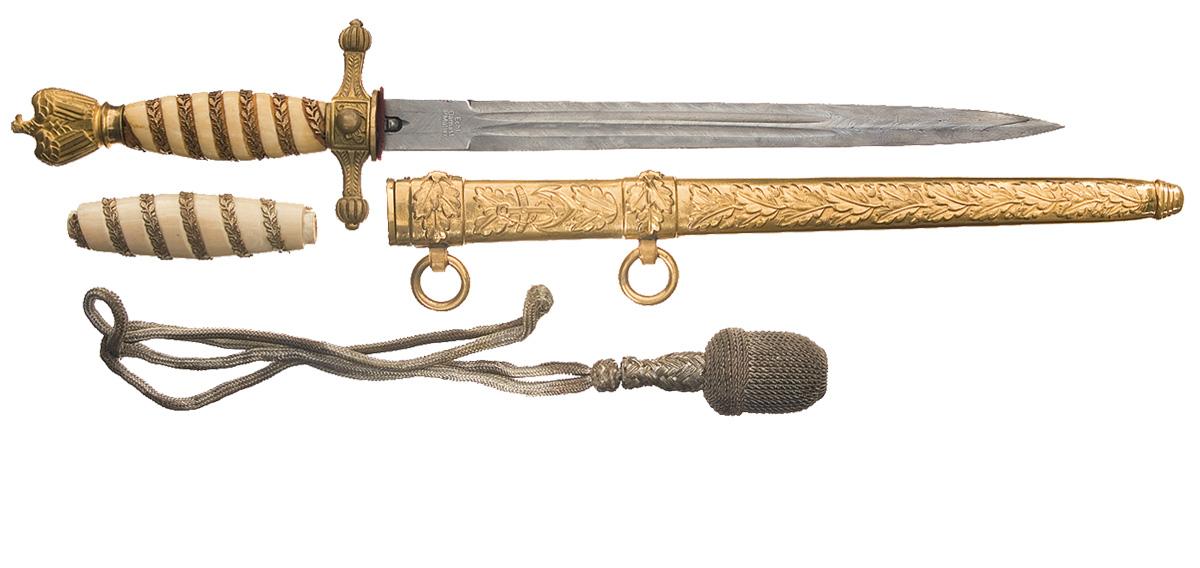 This is just an attractive example of a 2nd model "Naval Presentation" dagger with Admiral Raeder inscription. There were a total number of "6" documented WWII examples produced and presented as noted and described on pages 101-104, in the book "The Dagger and Edge Weapons Of Hitler's Germany" by Atwood. This particular example was made subsequently in the post-war era and has the hand forged, Damascus twist blade, gold washed 2nd model scabbard, one-piece ivory grip with gold leaves wrapped around the grip, with a single diamond (looks to be approximately .15 to .20 carat in size) insert into the center of the Swastika in the pommel head. These daggers were expressly commissioned by Admiral Raeder in 1938 and all six known examples were personally presented by Admiral Raeder to their recipients. Admiral Raeder had been a long time Naval officer starting his career in 1894 when he joined the Imperial German Navy. He rose through the ranks both before and during WWI and later during the Weimar Era. He was a staunch supporter of the rearmament and build up of Germany in the late 1920s and 1930s and was eventually promoted by Adolf Hitler to Gross Admiral in 1939. Of the six known examples the first was presented to Admiral Albrecht in Dec 1939 with two others presented to Admirals in late 1942 and the other three were presented to U-Boat Commanders for their significant Naval accomplishments in either sinking large numbers of allied shipping or specific one-time actions such as Oberleutnant Guenther Prien of U-47 who sank the British battleship Royal Ark in Scapa flow. It has been reported that all of the presentation daggers were produced by the Eickhorn firm however this specific presentation dagger is made by "P. Mueller" and so marked on the blade. A series of unsuccessful naval engagements in late 1942 lead to the demotion of Admiral Raeder in January 1943 and the appointment of Admiral Carl Donitz. Admiral Raeder eventually resigned in May 1943. This specific dagger as noted has the hand forged Damascus twist blade with a double fuller in the center of the blade on each side with the inscription on the upper hilt: "In dankbarer/Anerkennung/Raeder/ 13. August 1942", which loosely translate to "In Grateful Acknowledgement/Raeder/ 31 August 1942", with the obverse marked "Echt/Damast/P. Muller", which translates to "Genuine Damascus". The dagger is accompanied with the original gold washed Naval scabbard that is adorned with a Large Naval Anchor at the top intertwined with Germanic Oak leaves and two hanger/suspension rings a the top. This dagger is complete with a second grip that appears to also be made of ivory or bone that also has oak leaves wrapped around the grip and a silver braided Portepee. The dagger, scabbard, second grip and portepee are all housed in a very nice hand made (custom) presentation or display case.