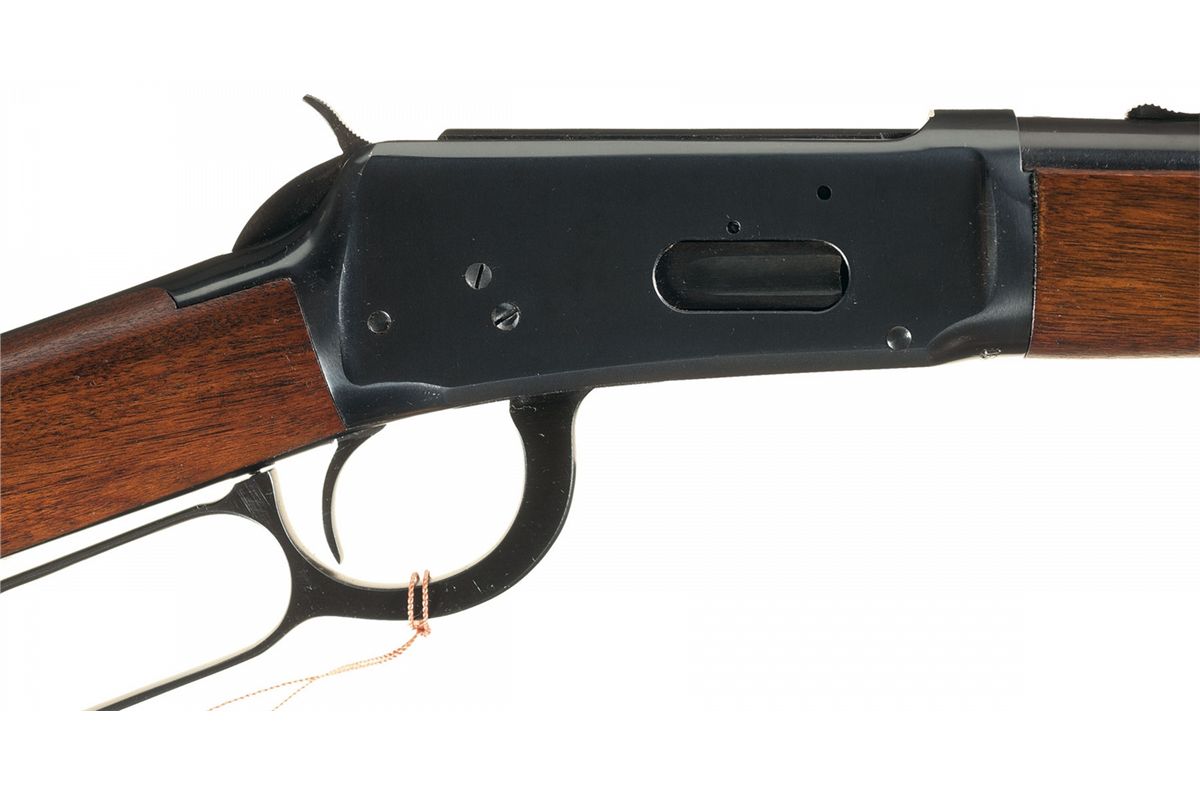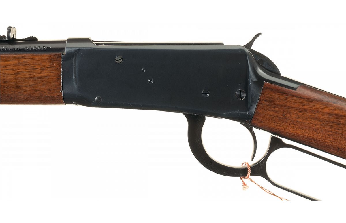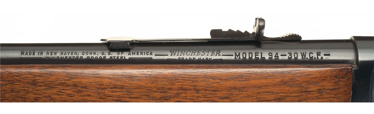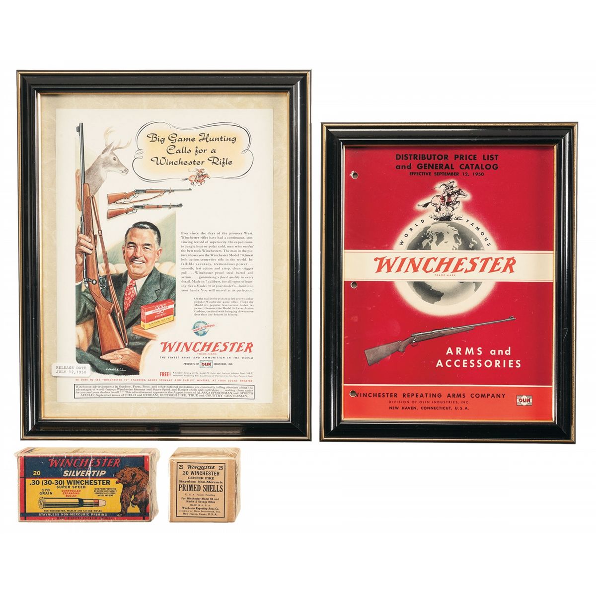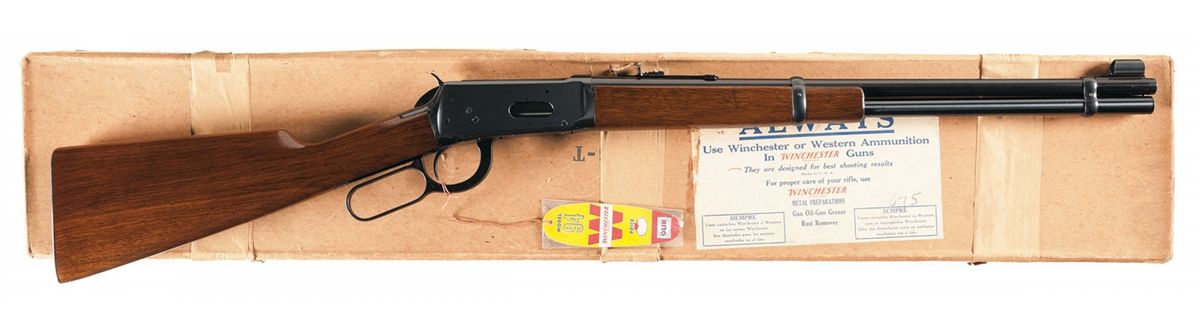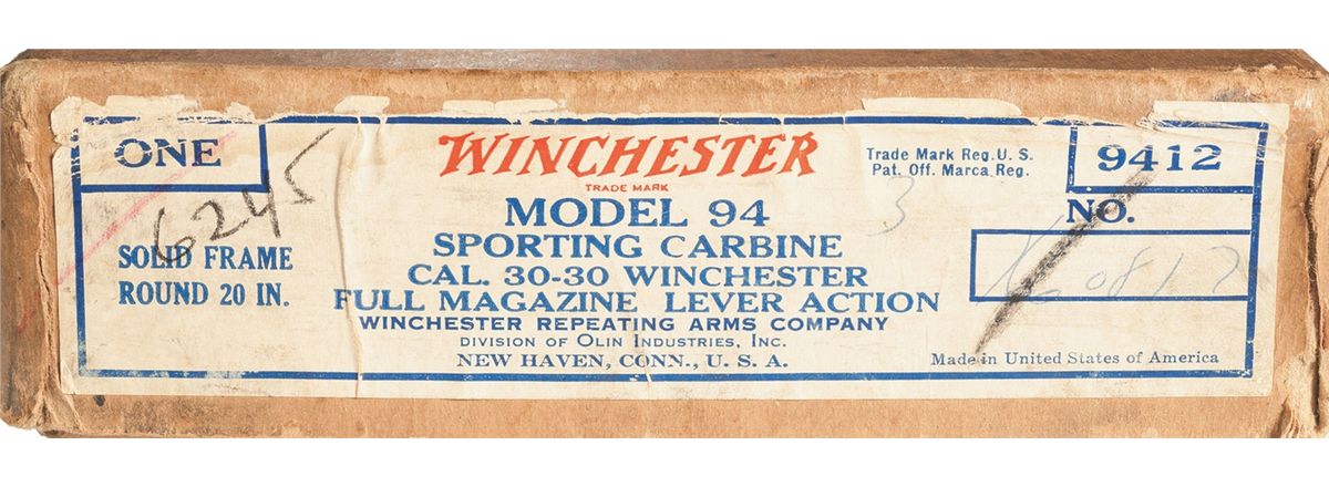 Manufactured in 1950 when the original purchase price was $68.70. Standard Winchester markings including the factory oval proof on top of the barrel and receiver at the breech. Equipped with a beaded front sight mounted on a ramp with a removable cover and a Winchester 22 K sporting rear sight. Smooth forearm and straight grip stock with a checkered steel shotgun type buttplate. The carbine has the hanging tag. The carbine has the instructions pamphlet and a 1950 Winchester retail price list. The factory box is numbered to the gun and has the cardboard partitions and protective paper. With the carbine are the following Winchester items: one box of Winchester .30-30 cartridges (box has bear illustration), one box of Winchester .30-30 primed shells, a 1950 Winchester ad and a Winchester 1950 distributor price list/general catalog.