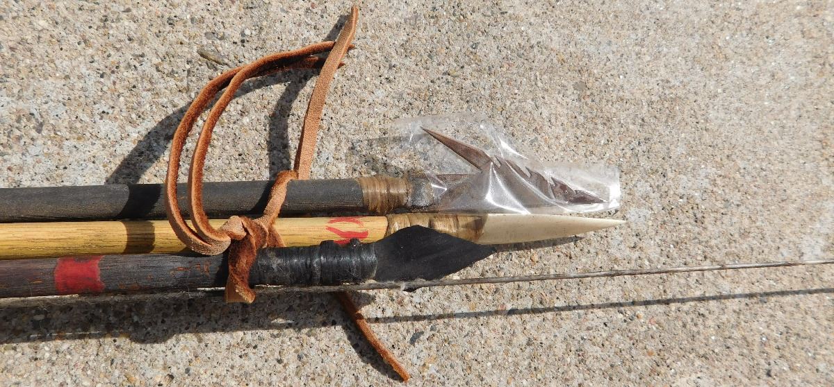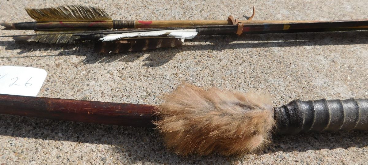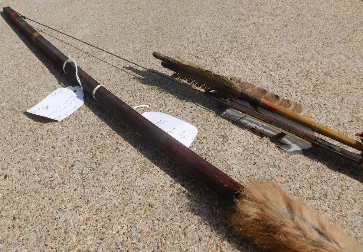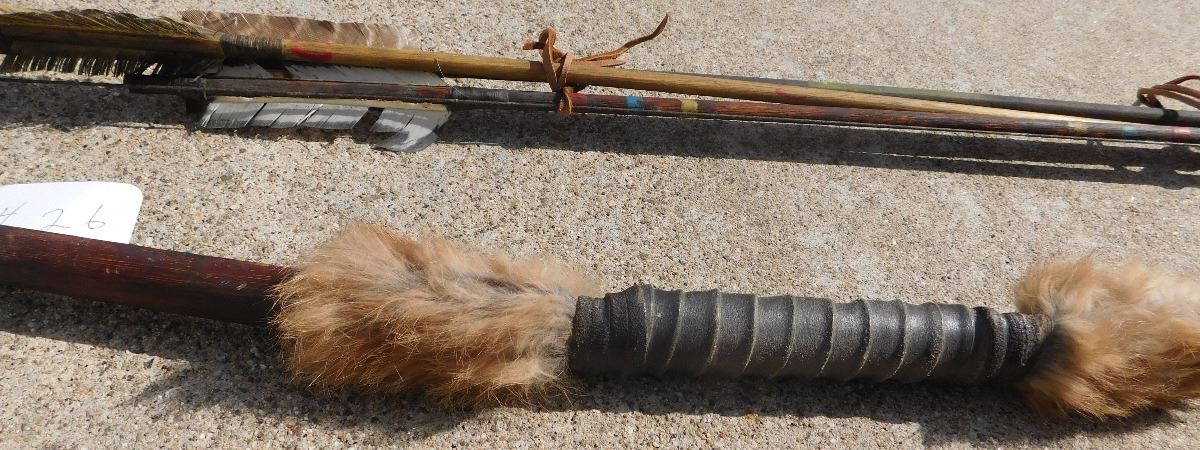 Plains Bow and 3 Arrows, item is mid-20th Century. This lot is made from wood, leather, fur, bone and steel. The bow is 47 x 1 x 1 and the arrows are 25" long. One arrow has bone point. Condition: There is some wear but overall good condition, see images. Shipping: $55 (USA estimate, bulky item).
