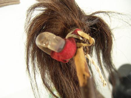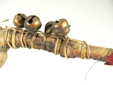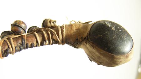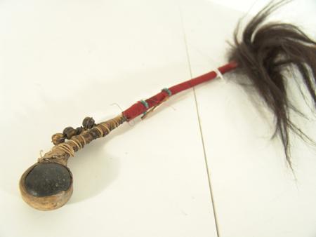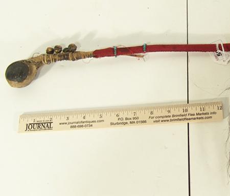 Rare rawhide wrapped stone club with tradecloth casing, sinew, bells, and decorated with horsehair tuft. Purchased from Dewey in 1978 for $950; appraisal value $1,200. Condition: very good, original condition. 29"