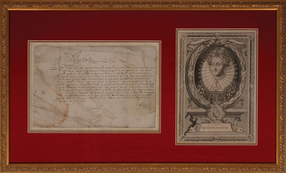 LS signed "Elizabeth I," one page, 12.5 x 8.5, September 1, 1568. Letter to the Count of Winchester, Tresor of England, about payment of 1000 livres to her cousin, the Count of Sussex. Beautifully mounted, double-matted, and framed beside a detailed engraving of the queen to an overall size of 18 x 29. In very good condition, with intersecting folds and overall creasing, scattered soiling, dampstaining to the left side, and slight paper loss to edges; Elizabeth's large, bold signature is largely unaffected. Oversized.
