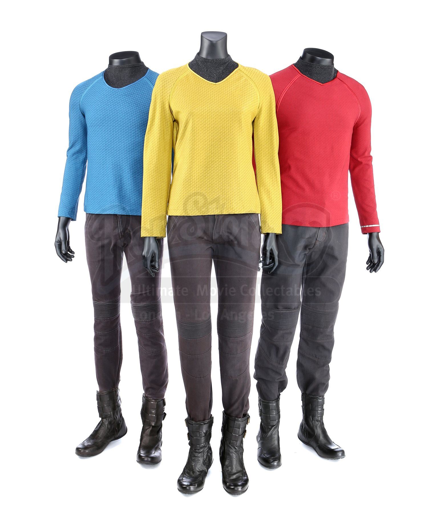 A set of three men's Enterprise uniforms from Star Trek and reused in Star Trek Into Darkness. Enterprise staff wore their uniforms while aboard the Enterprise throughout the first two films. The set includes three tunics (all approximate size medium), three semi-mock turtleneck undershirts (all small), three pairs of pants (two marked size 28, one approximate size 28), and three pairs of boots (marked U.S. sizes 8.5, 10 and 10).