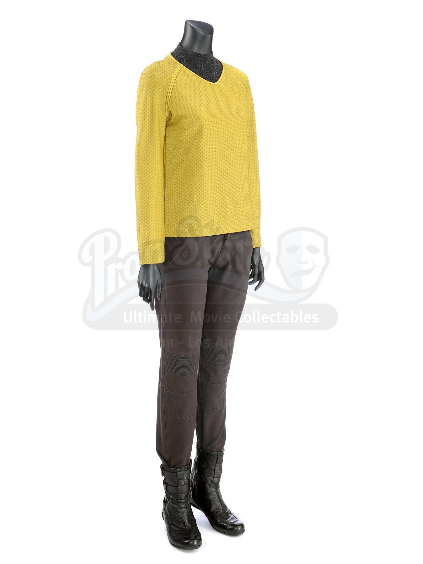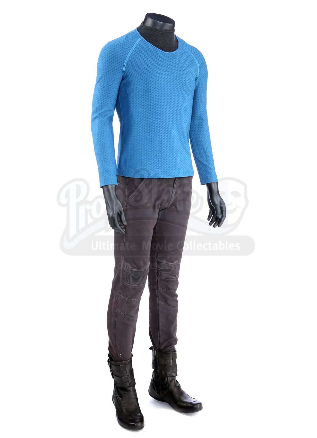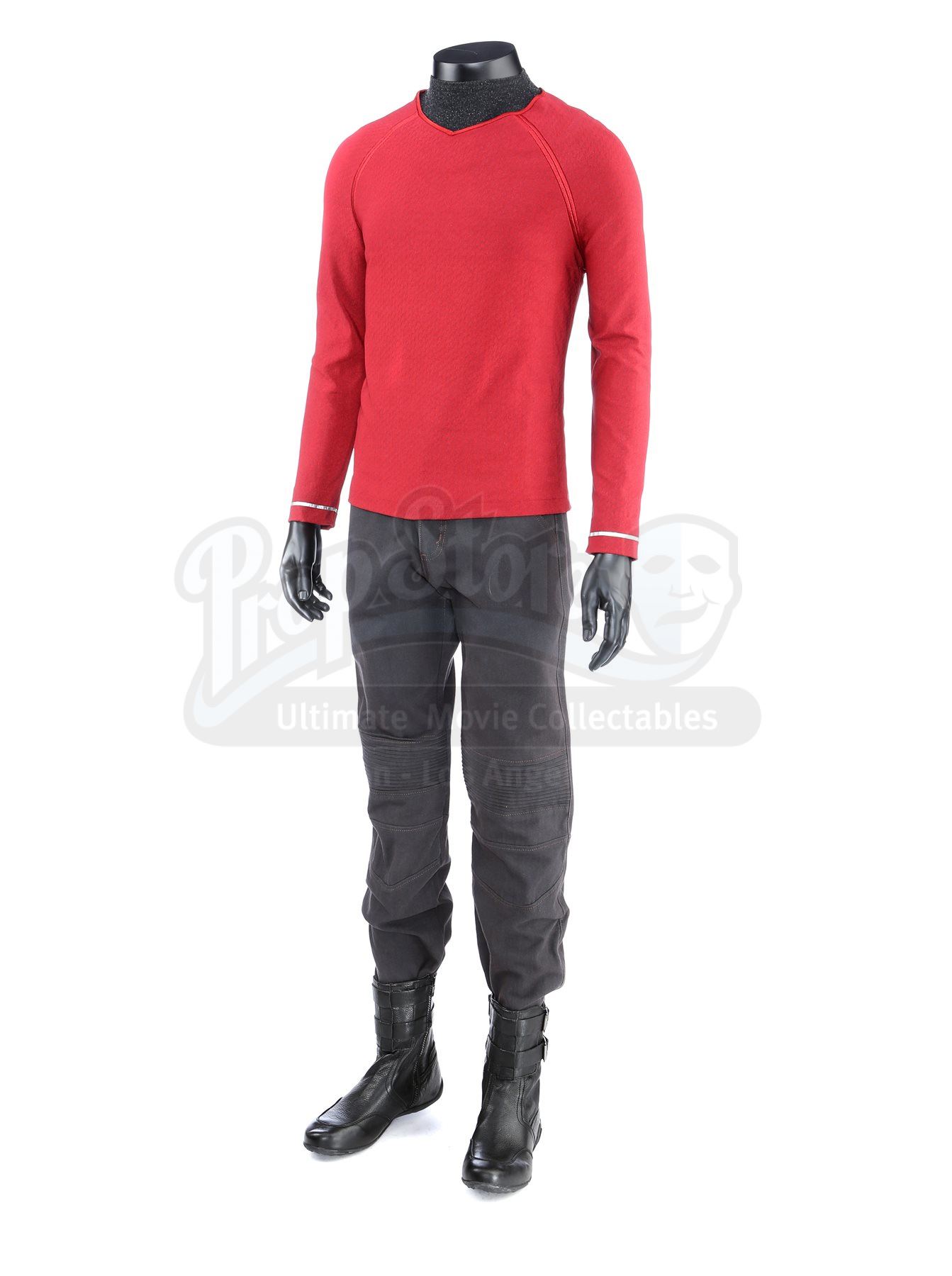 Made for the first film and reused in the sequel, the lot includes operations, sciences, and command long-sleeved officer tunics made of Spandex, each of which have piping around the collar and feature a printed optical repeat Starfleet insignia pattern. The red tunic also has one silver band on the wrists. The three undershirts consist of grey polyester collars that are stitched to the top of modified Spandex sport shirts. The dark grey twill pants have ribbed fabric above the knees. Also included are three pairs of black leather boots with rubber soles.