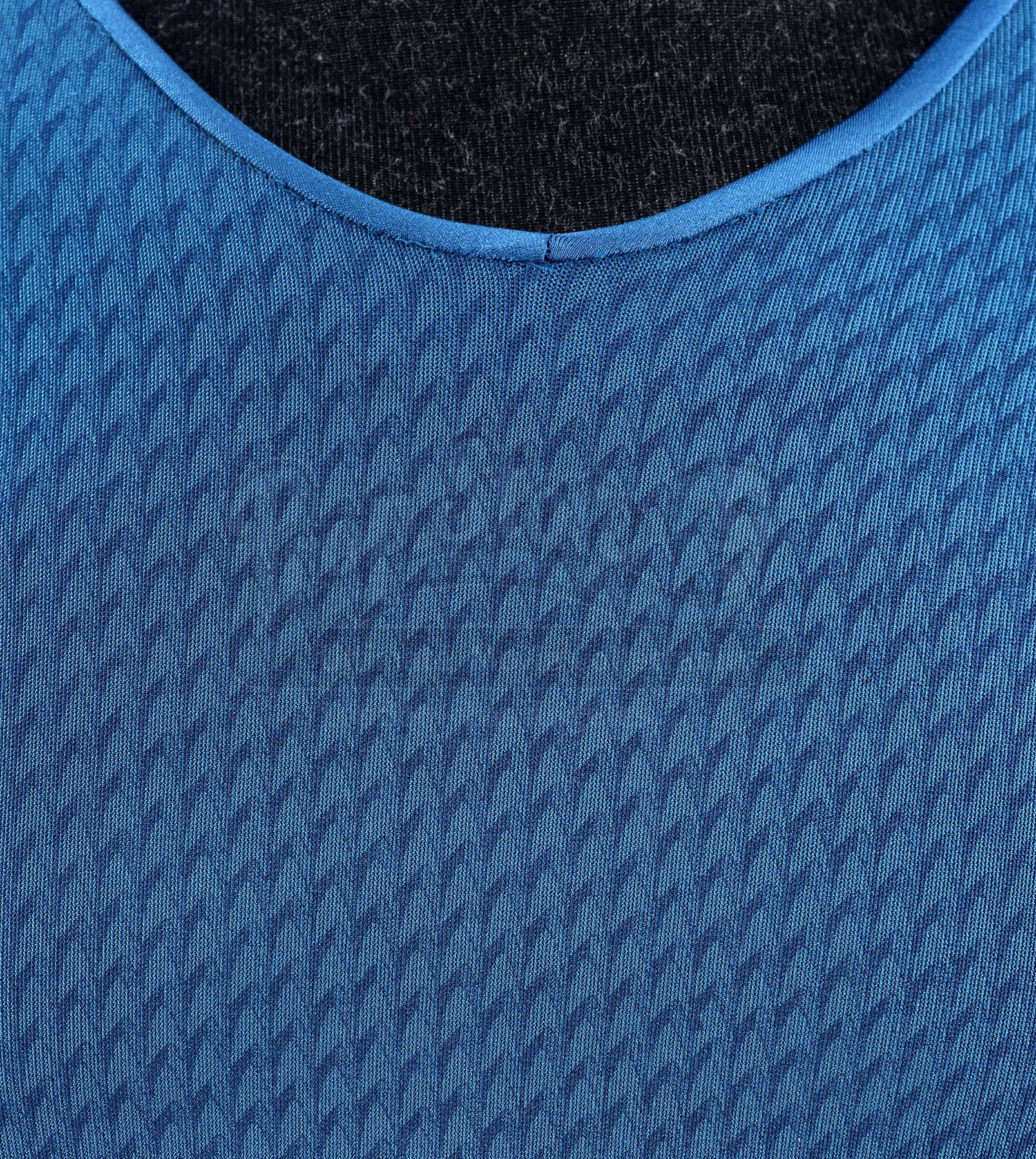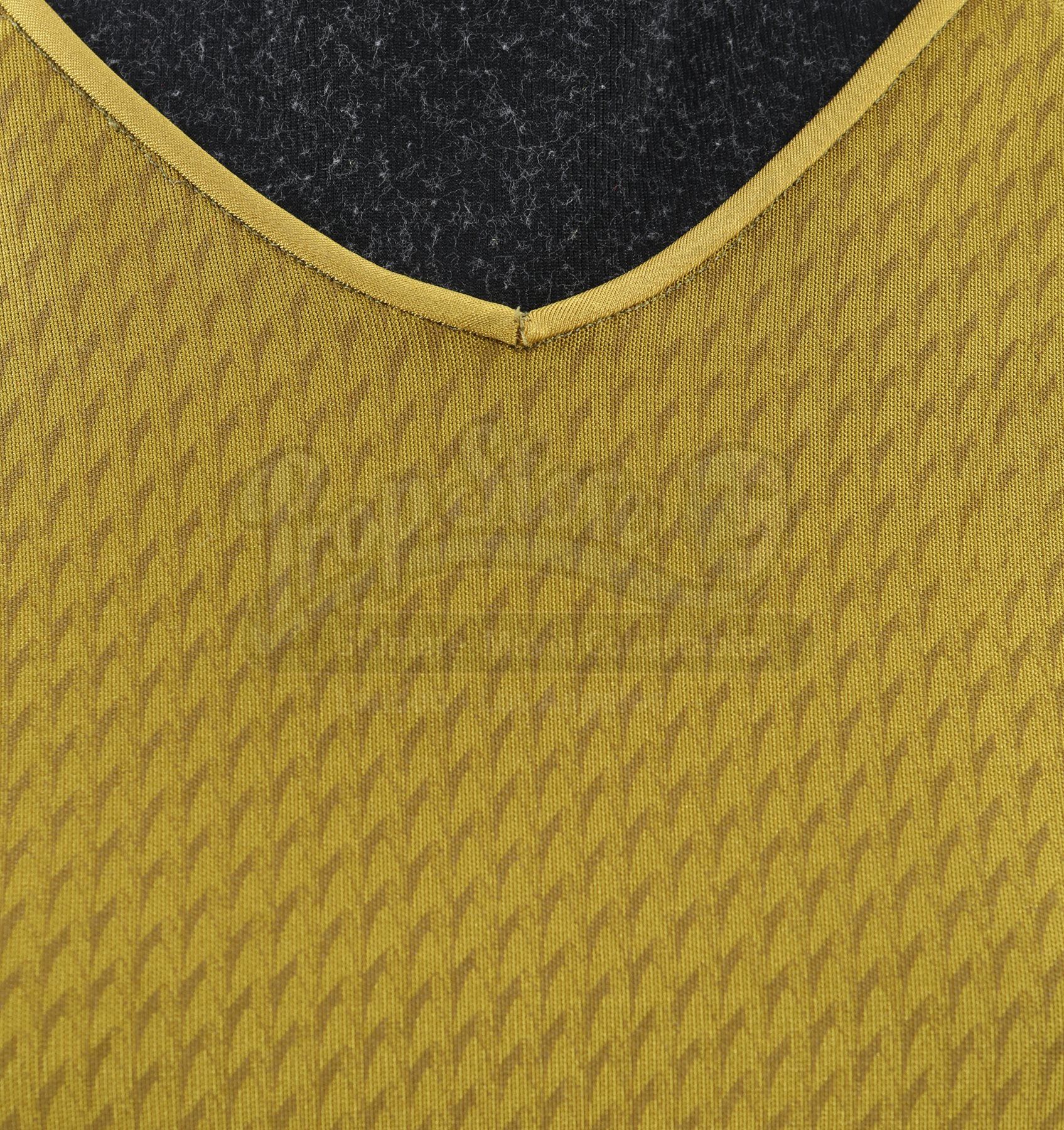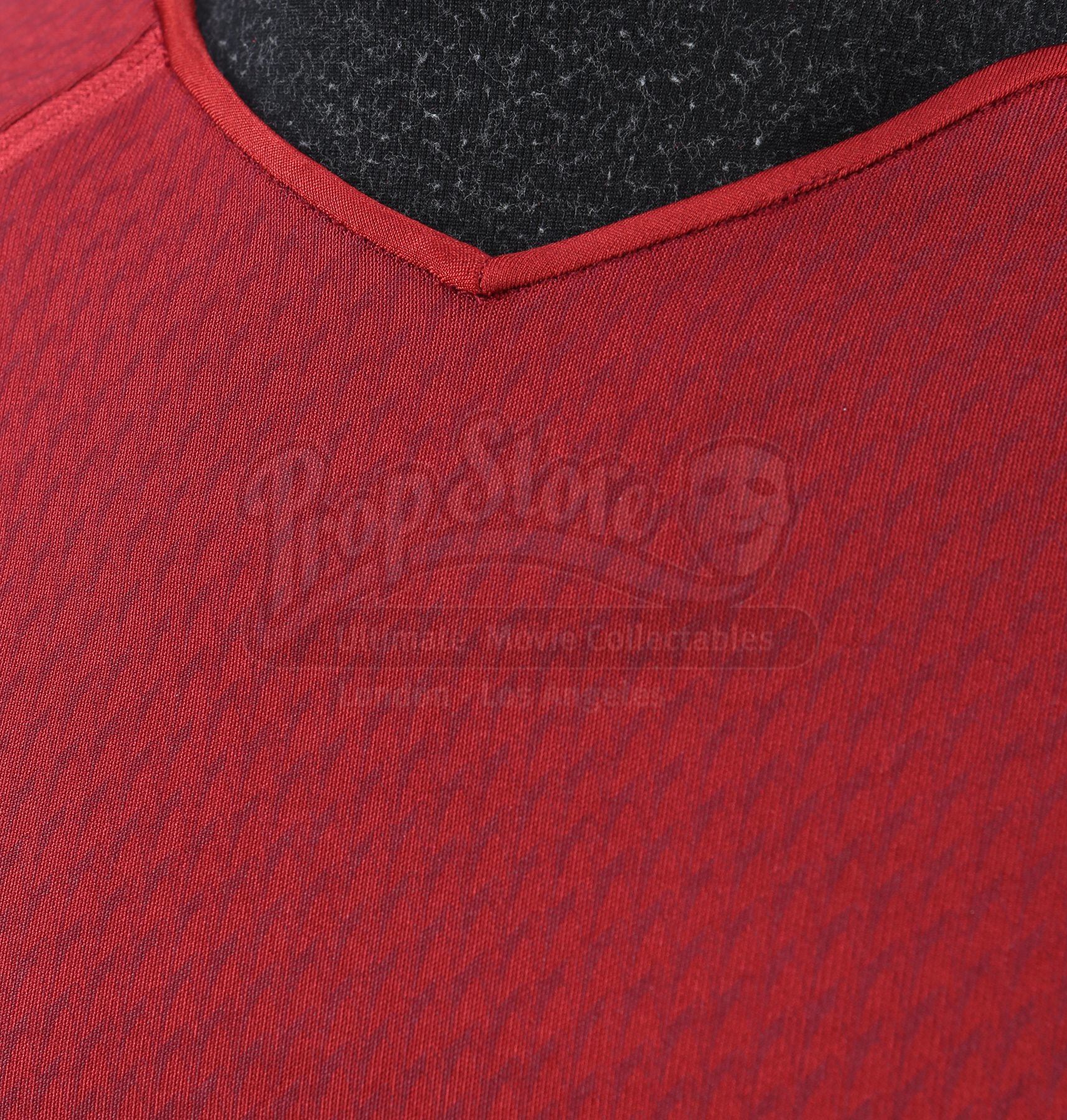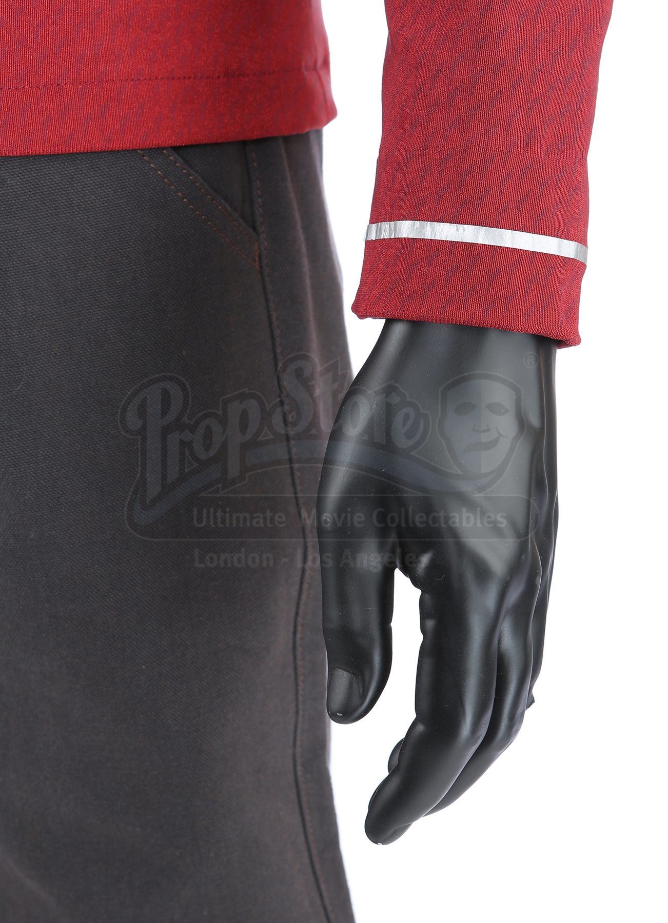 Made for the first film and reused in the sequel, the lot includes operations, sciences, and command long-sleeved officer tunics made of Spandex, each of which have piping around the collar and feature a printed optical repeat Starfleet insignia pattern. The red tunic also has one silver band on the wrists. The three undershirts consist of grey polyester collars that are stitched to the top of modified Spandex sport shirts. The dark grey twill pants have ribbed fabric above the knees. Also included are three pairs of black leather boots with rubber soles.