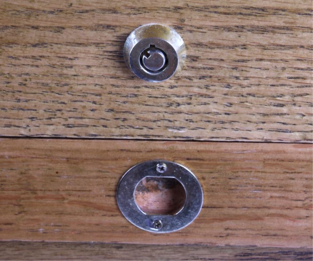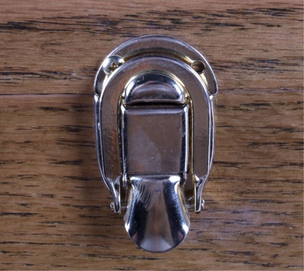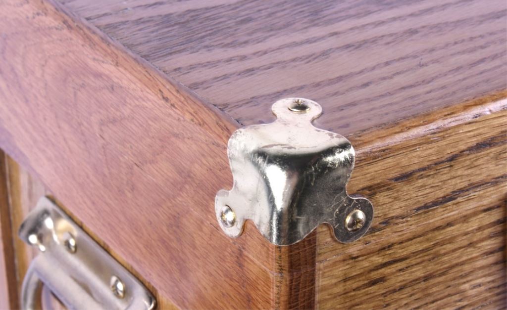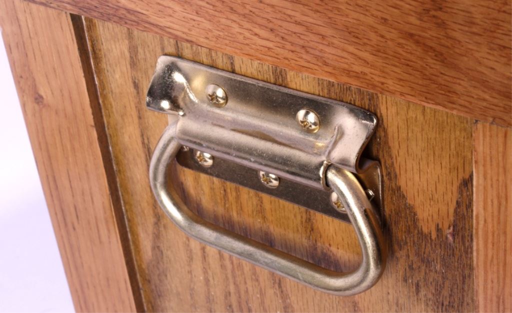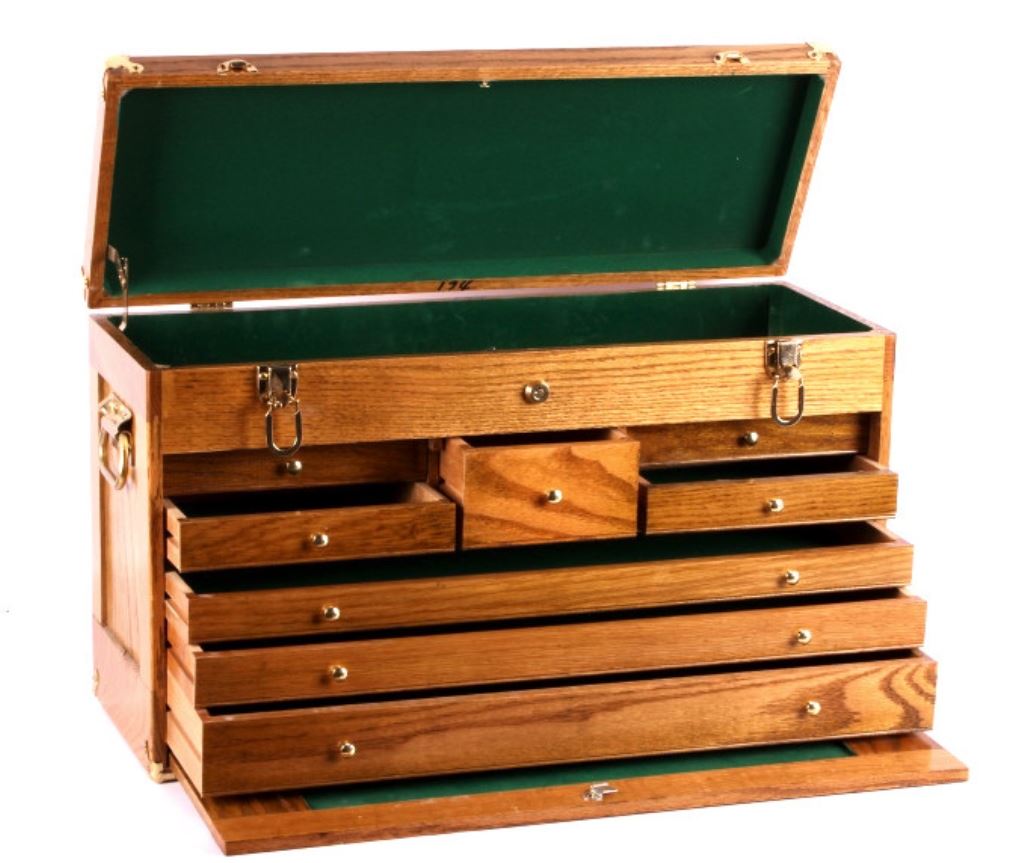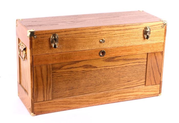 This is a machinist tool chest made from solid oak. The tool chest features eight spacious drawers with additional storage under the lid on top. It is accented by the brass hardware. The machinist tool chest is in good condition. It measures 9.5" x 26" and is 15" tall.