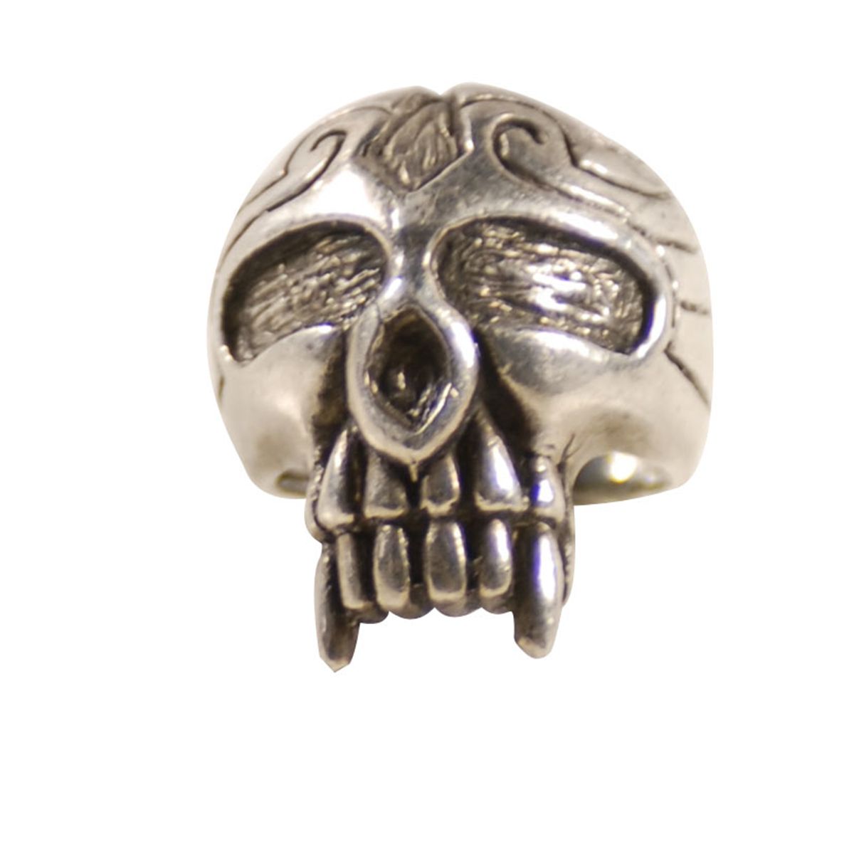 Sterling silver skull ring. The consignor's LOA reads in part: “I am a professional musician whose early career crossed paths with SRV during the years 1987-1991. I played dozens of shows with SRV and Double Trouble as an opening act while a member of the MCA recording act Broken Homes. I came into ownership of this piece of jewelry by accident. We opened the east coast leg of a Double Trouble tour in the late 1980s. One memorable date was staged at the Capital Theater in northern New Jersey, near my parents' home in Philadelphia. My group was a critical favorite and scheduled to be photographed for a future issue of Rolling Stone magazine following Stevie's performance. While visiting my parents while on a break, I left behind a suitcase with my jewelry and stage clothes. It was too late to retrieve it for the show or the photo shoot. Stevie had come off stage and noticed I was upset. He solved my problem by removing his scarves and jewelry and giving them to me for the photo session. It has been a long time but I remember the scarves were wet and there was probably enough DNA to clone a new SRV. I introduced him to my parents and awe-struck friends as he left the building. At the end of the shoot I put Stevie’s stuff into two large Tupperware containers with the intention of returning them to him as soon as possible. The return never happened. When I rang him at the hotel he said to bring the items to the next show, but we weren't scheduled to play together for a few nights and the items ended up sitting forgotten in a road case…until I discovered them 10 years later, still in my Mothers' Tupperware. The ring was owned and worn by the late, great Stevie Ray Vaughan.” In fine condition, with a slightly indented band.