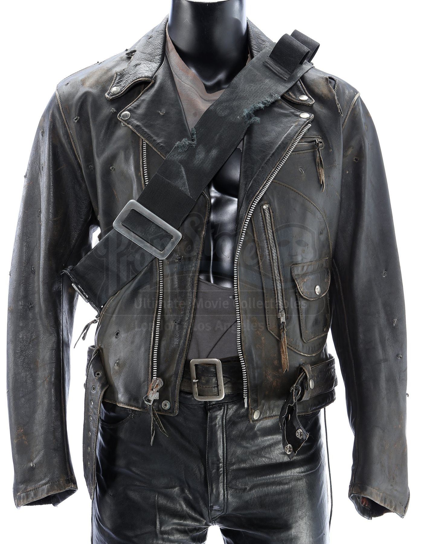 The Terminator's (Arnold Schwarzenegger) costume from James Cameron’s sci-fi action sequel Terminator 2: Judgment Day. The Terminator wore his signature costume throughout the film after he stole it from a biker at a bar. This costume is distressed from the Terminator’s encounter with S.W.A.T. at Cyberdyne Systems near the end of the film.