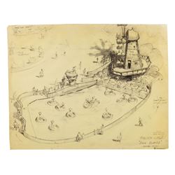 (Disneyland, c.1954) A concept brownline by Imagineer Bruce Bushman. Featuring a "Duck Bumps" water ride in Fantasyland, this concept was ...