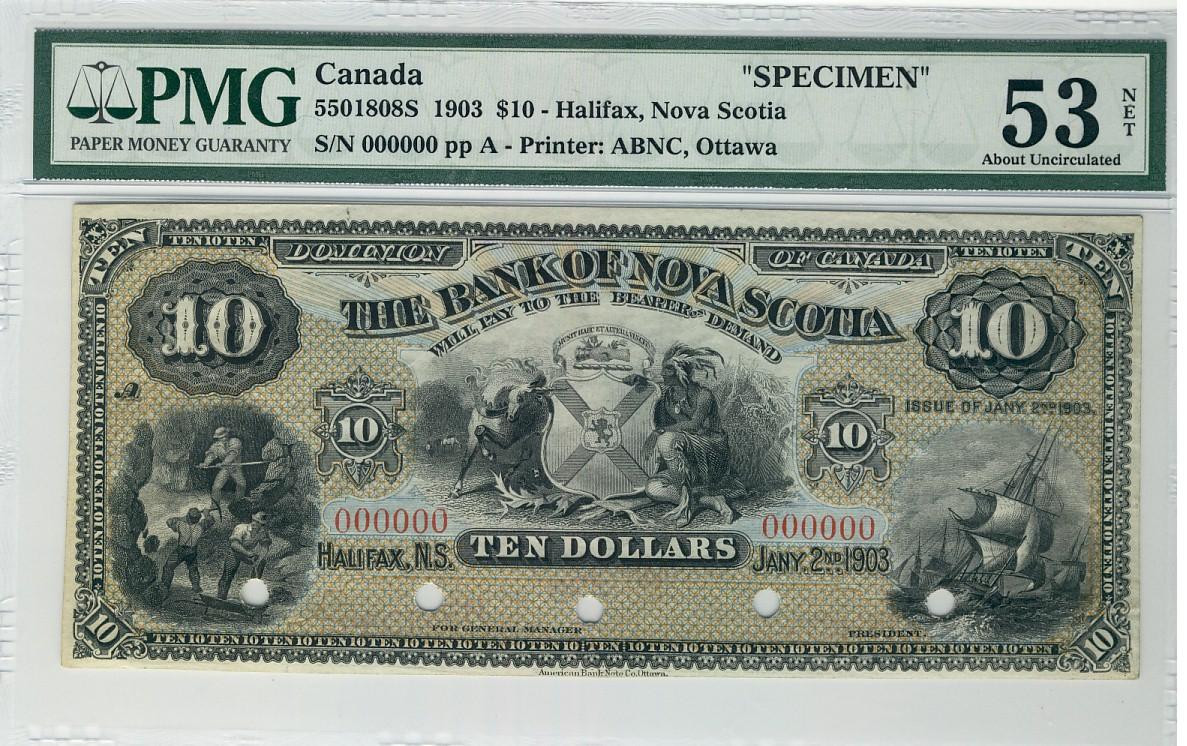 The Bank of Nova Scotia 1903 $10 CH-550-18-08S PCGS AU53. A rather rare and maybe unique example, Unlisted in Charlton, with typical light glue residue on back border of note.