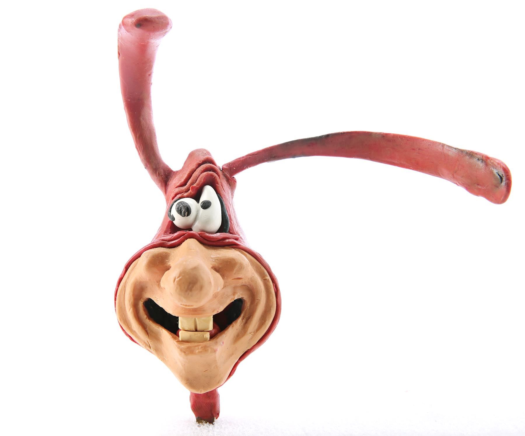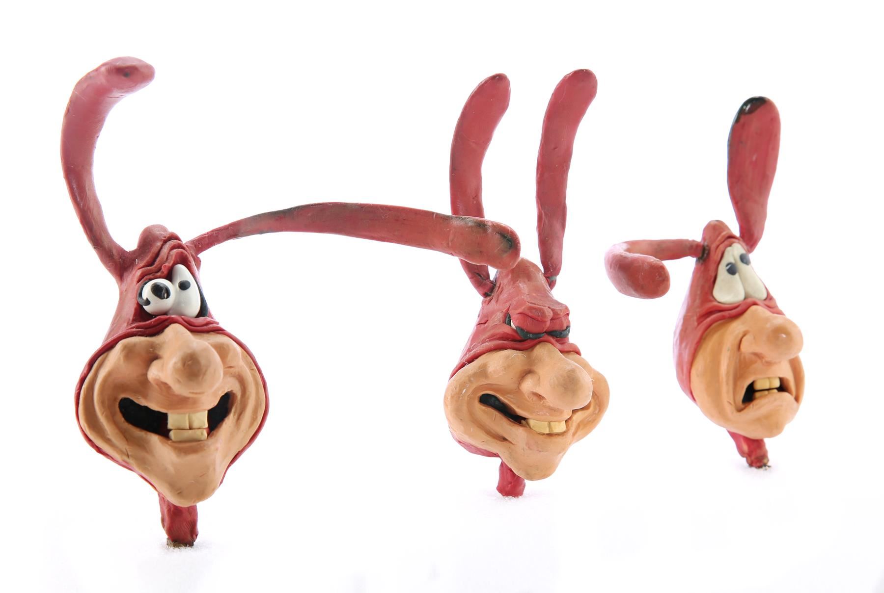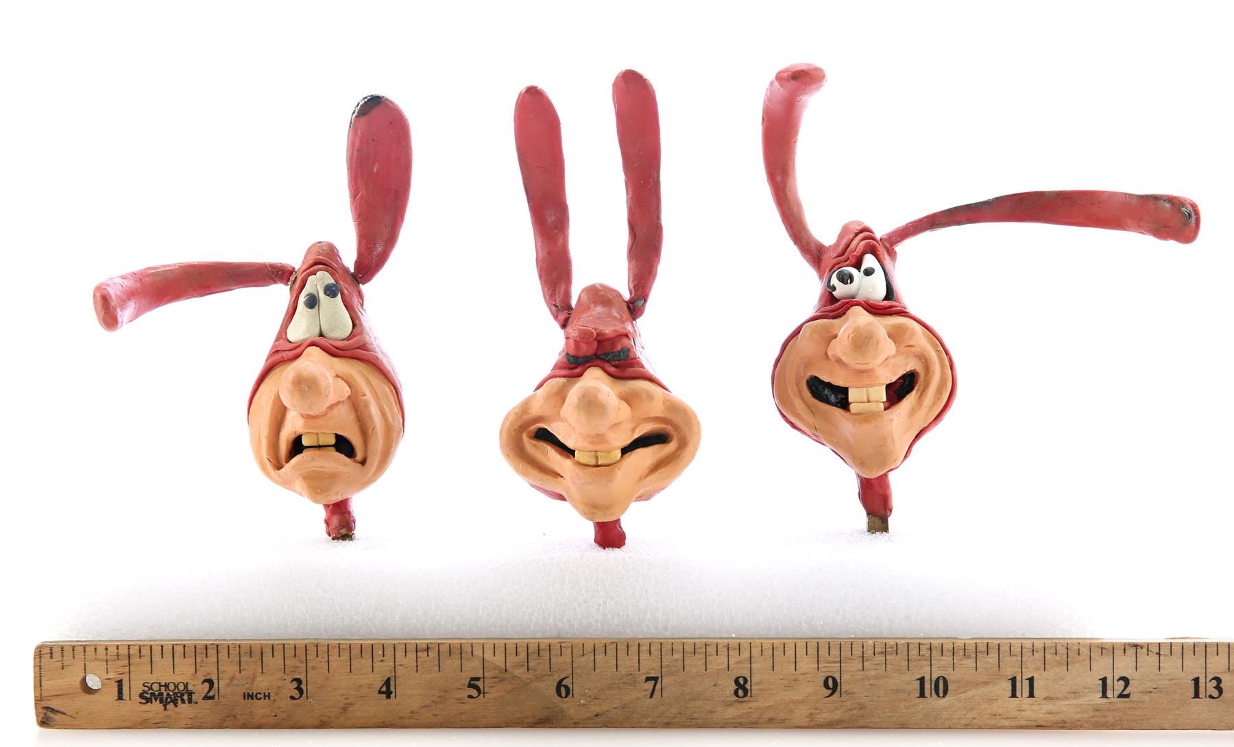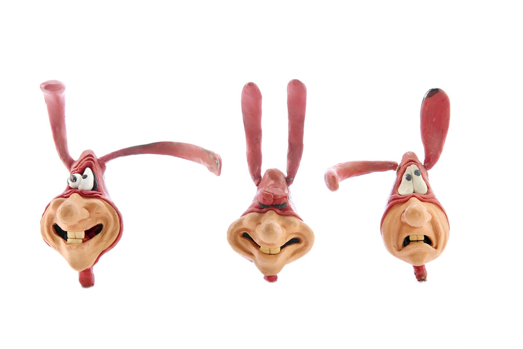 Set of three Noid Claymation peg-registered puppet heads made by creator Will Vinton for Domino’s Pizza television commercials. The clay heads each wear a superhero cowl, are sculpted over a metal armature and are hand-painted red, white, and black with a flesh-colored face grimacing and clenching its teeth. Long rabbit-like ears attach via peg holes in the head, and metal pegs below the neck are exposed, where the head would connect to the puppet body (not present).