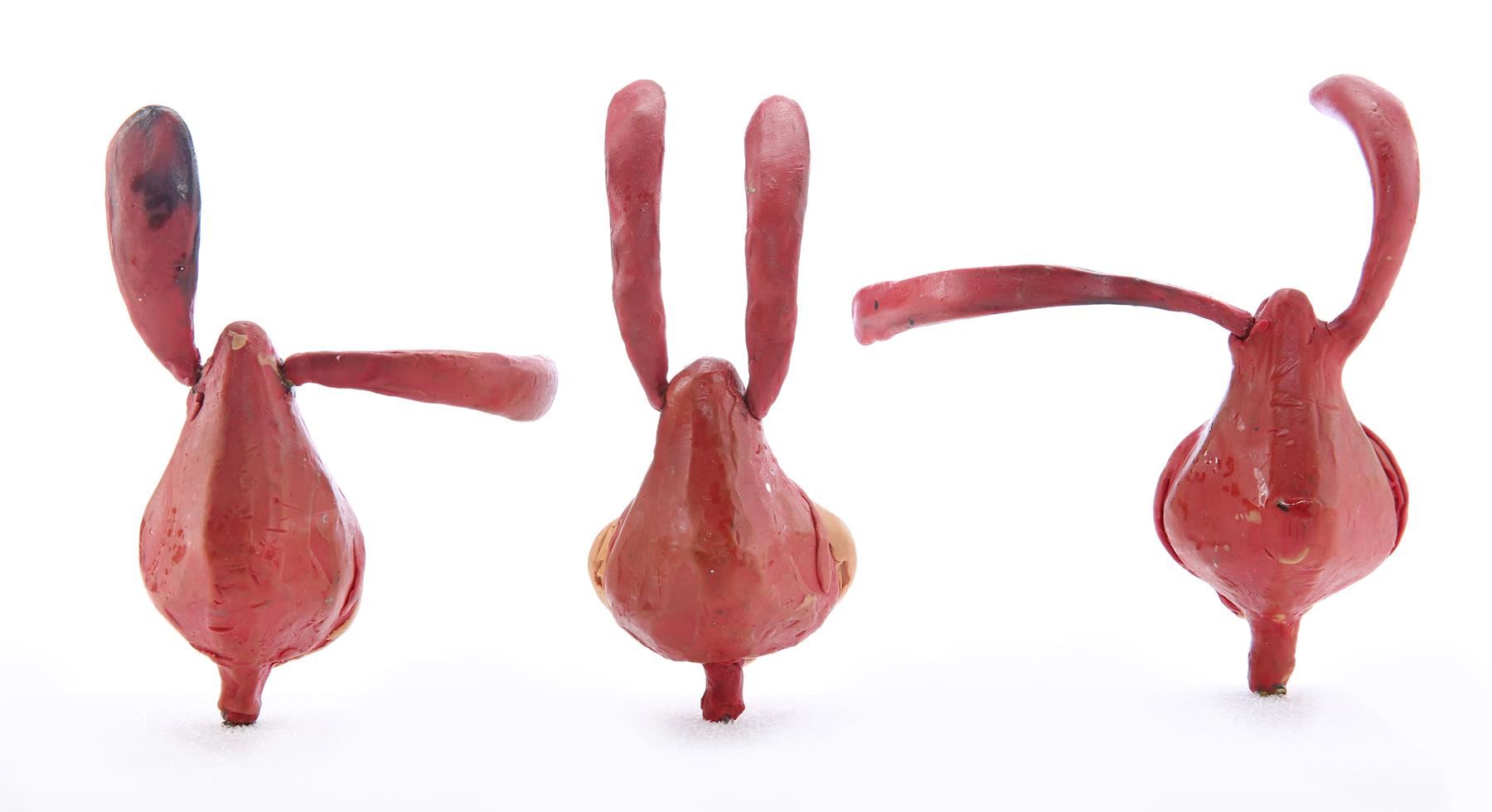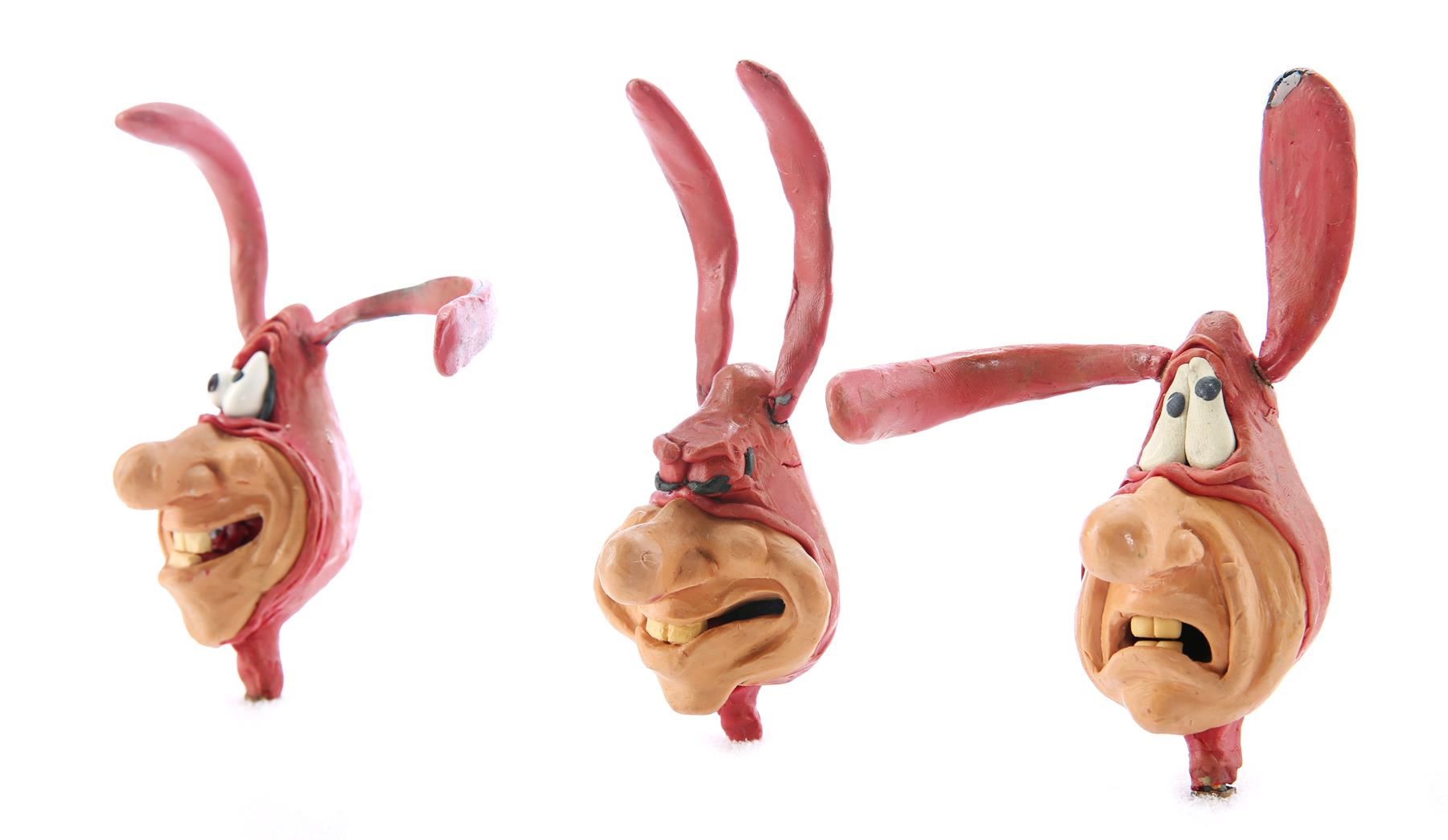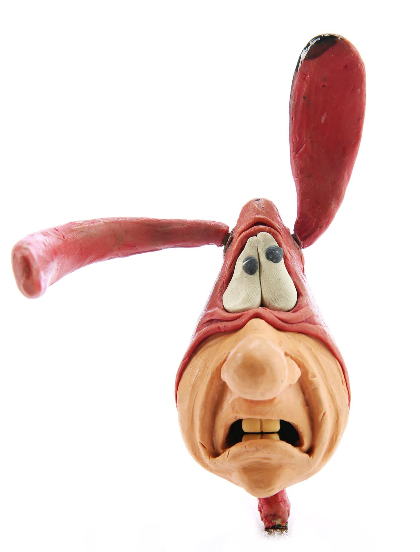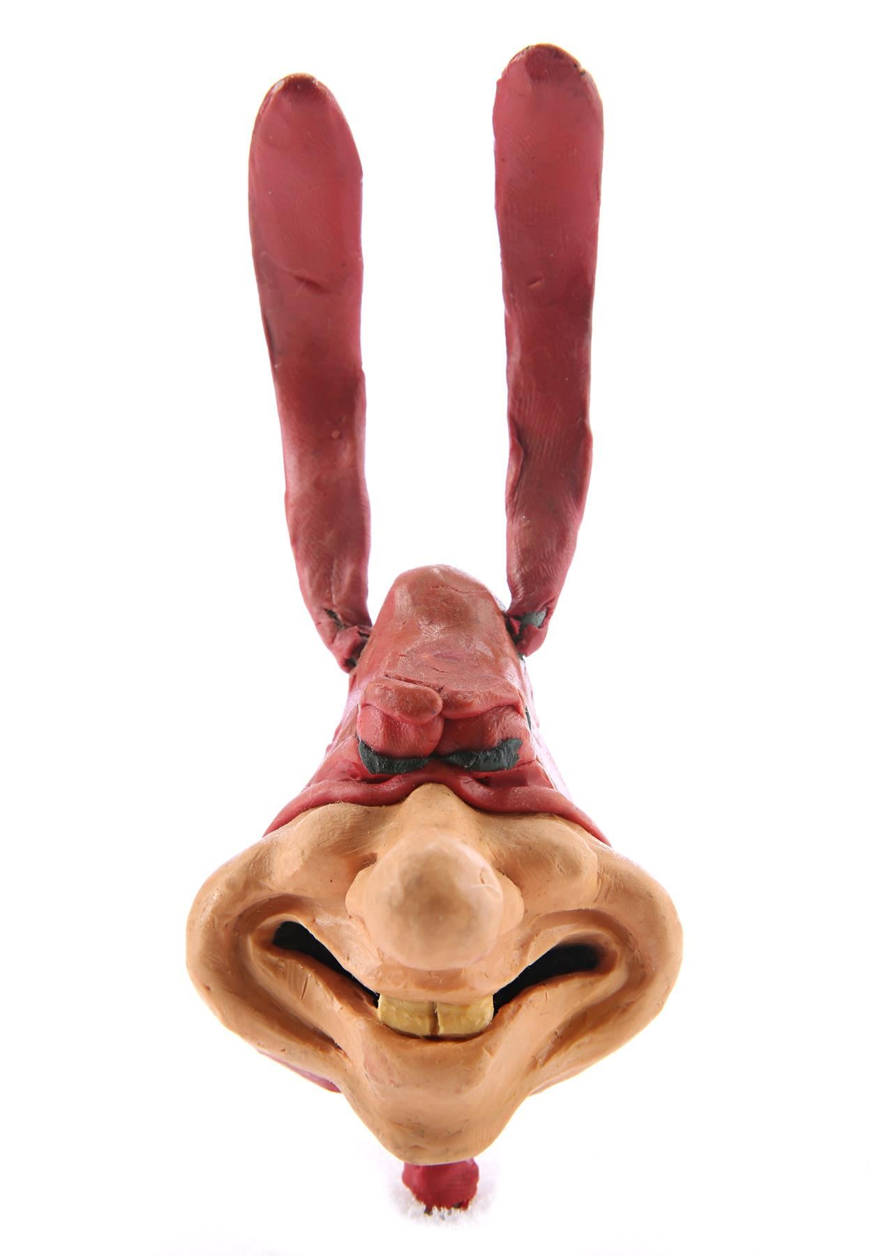 Set of three Noid Claymation peg-registered puppet heads made by creator Will Vinton for Domino’s Pizza television commercials. The clay heads each wear a superhero cowl, are sculpted over a metal armature and are hand-painted red, white, and black with a flesh-colored face grimacing and clenching its teeth. Long rabbit-like ears attach via peg holes in the head, and metal pegs below the neck are exposed, where the head would connect to the puppet body (not present).