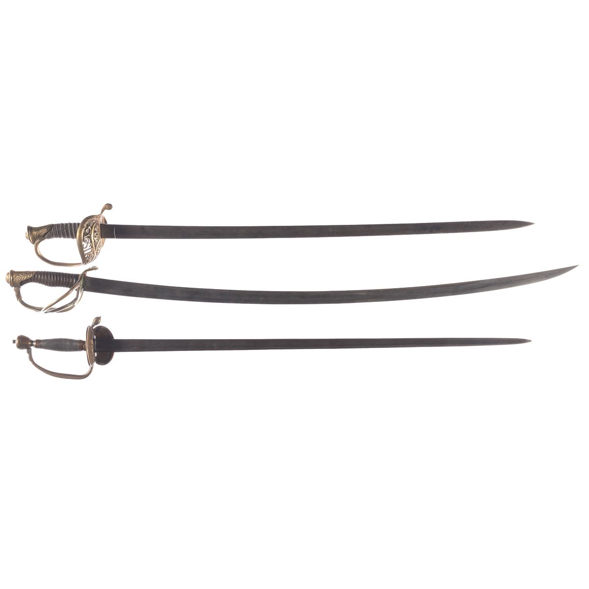 1) Schuyler, Hartley & Graham/Clauberg (New York/ Solingen) officer's saber, 32" double fuller blade with etched ricasso, "IRON PROOF" on the spine, cut-through brass guard and rayskin grip. Fair, with pitting. 2) French saber, 36 1/2" double fuller blade with 1882 dated spine, leaf engraved brass guard and wire wrapped horn grip. Good. 3) British sword, 32 1/4" engraved blade, brass guard, folding counterguard and metal grip. Counterguard damaged, otherwise good.