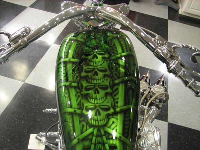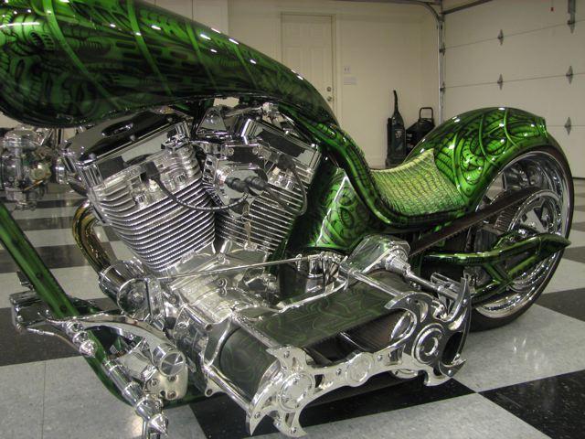 It rides well with adjustable air ride suspension and has a 5” Hi-tech open primary belt that is also free hand air brushed in Giger art. Everything was done top of the line with Accutronix forward controls, P M Brake systems and of course an Alligator seat.