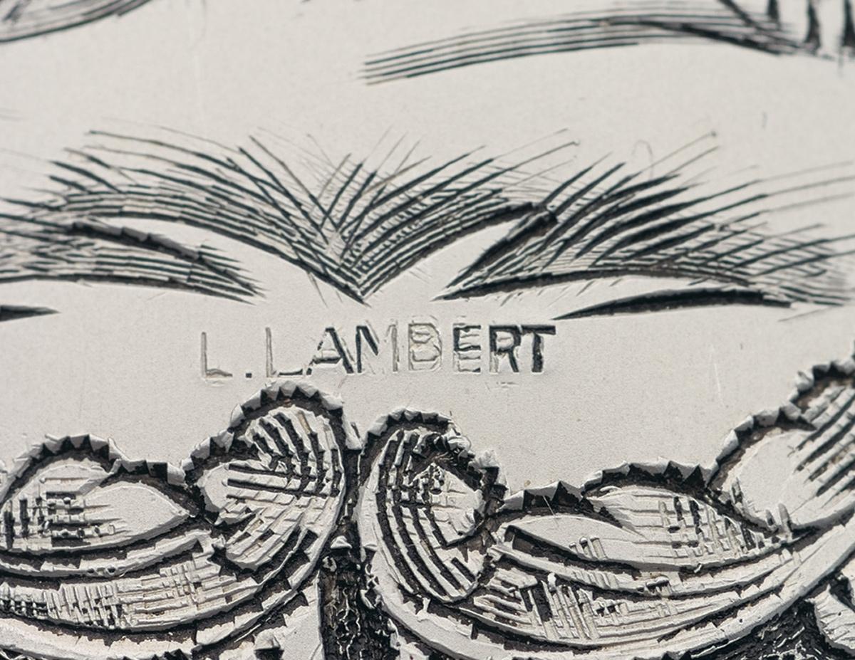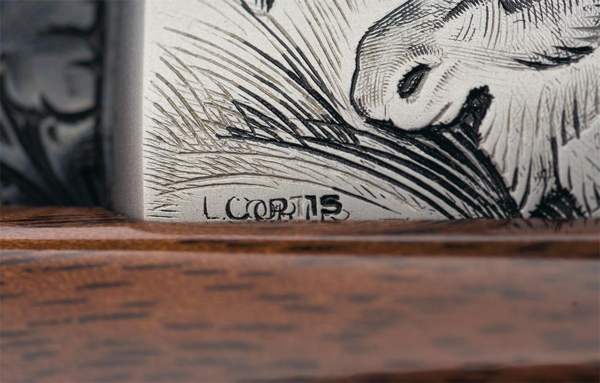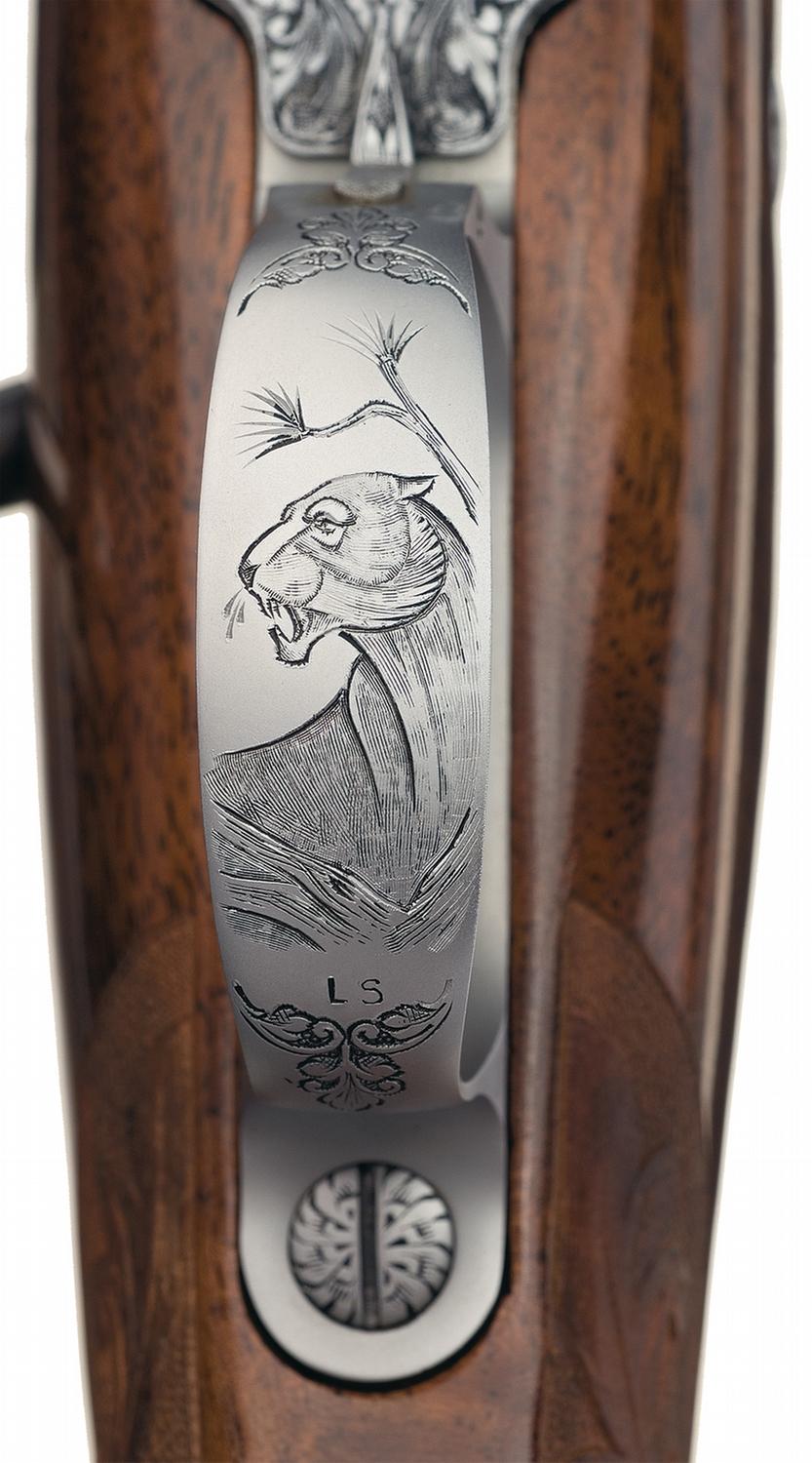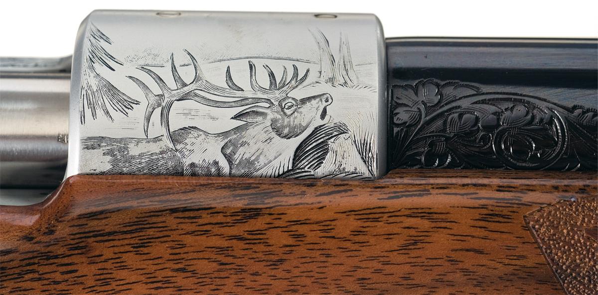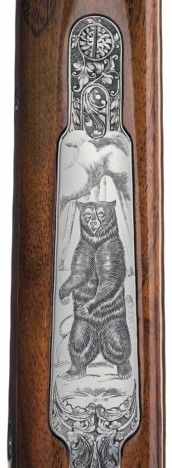 Manufactured in 1972. This rifle has a blue barrel manufactured without sights, a gold trigger, a polished bolt and the remaining surfaces French gray. The top of the receiver is factory drilled and tapped for scope mounting. The breech end of the barrel has a 2 inch floral scroll and punch dot engraved wedge on either side. The front receiver ring is engraved with a buck moose on the left side and bugling elk on the right side, with the remainder of the receiver featuring a scroll leaf and punch dot engraving. The hinged floor plate is engraved with a rearing bear in a woodland scene with floral scrollwork below and on the attaching metal. The trigger guard is engraved with a mountain lion. The left side of the receiver is signed "L. CORTIS", the floor plate is signed "L. LAMBERT" and the trigger guard is signed "LS". The stock is extra fancy select walnut with a high gloss finish, fine line checkering and floral and matte hand carving on the forearm and grip area. The stock has contrasting forend and grip cap, a raised comb, cheekpiece, a vented Browning recoil pad, and sling swivel studs. Complete with manual.